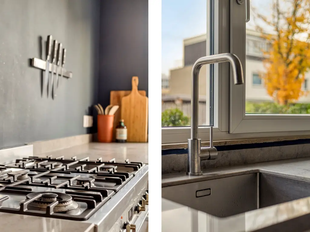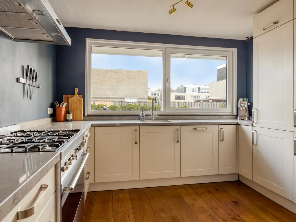 Aan de voorzijde ligt de moderne hoekkeuken, voorzien van diverse inbouwapparatuur, waaronder een koelkast, vriezer, vaatwasser en een 6-pits SMEG-fornuis met grote oven en rvs-afzuigkap.