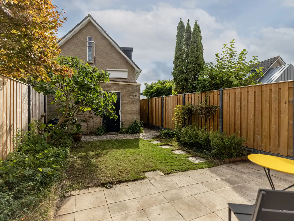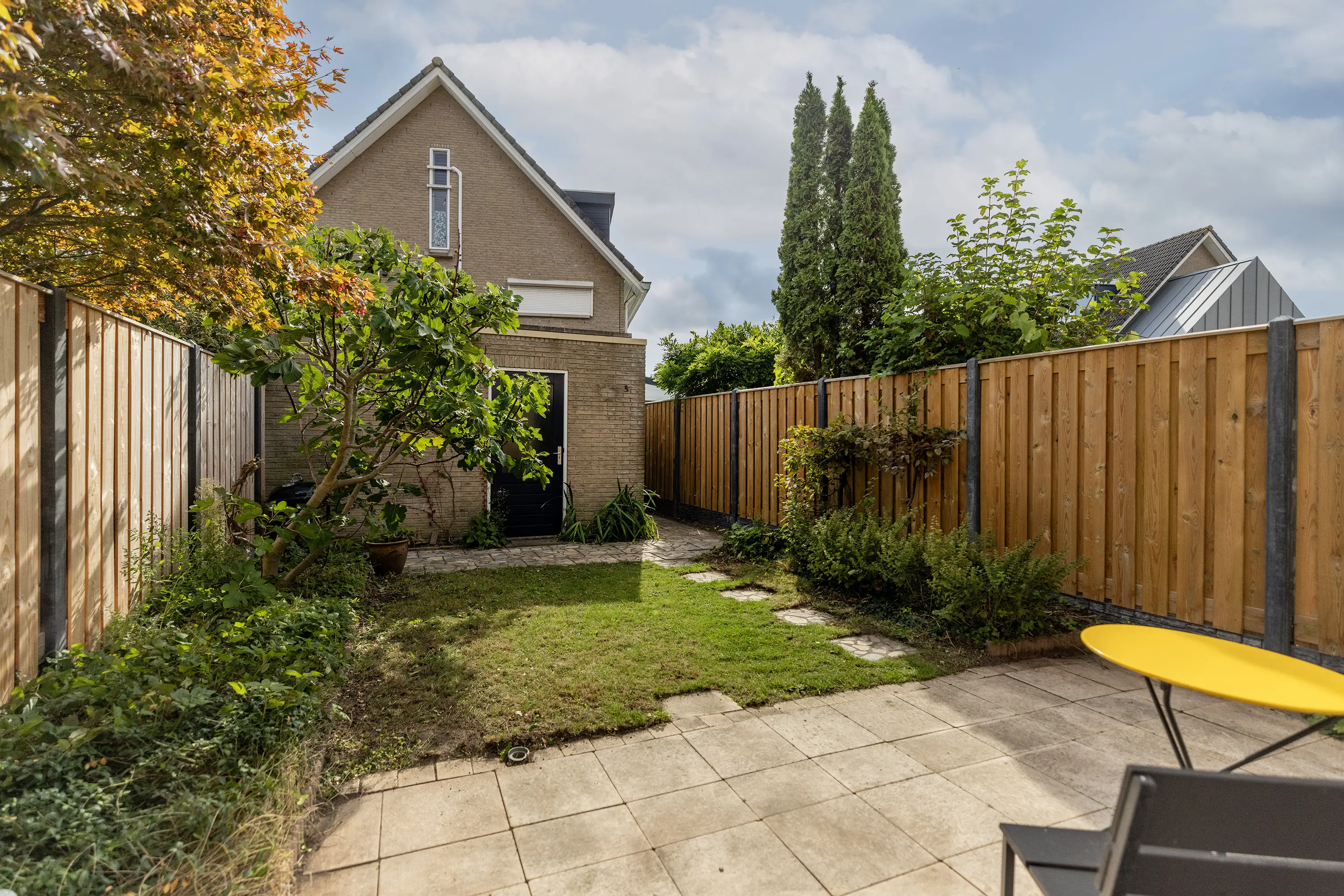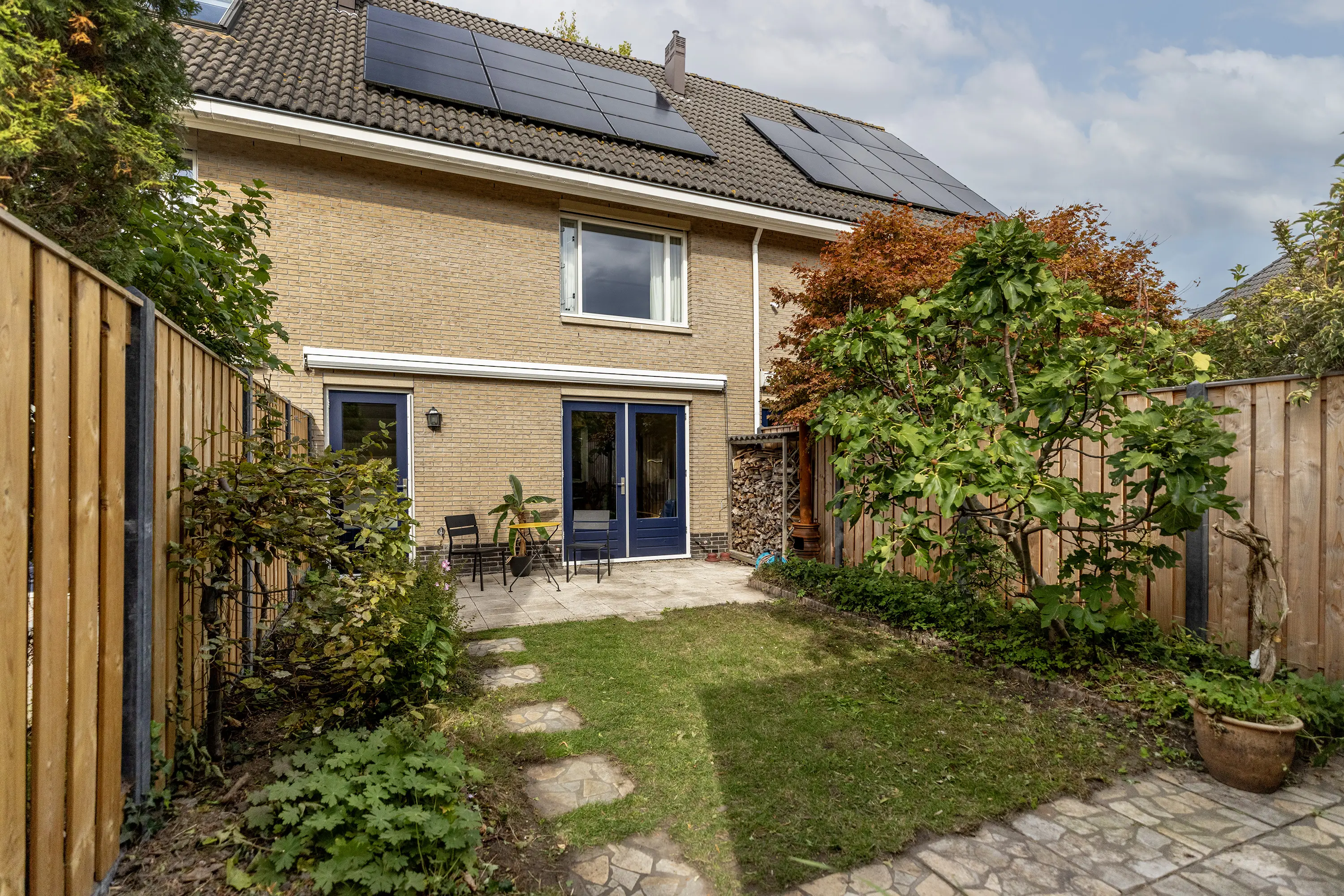 De achtertuin ligt op het zuidoosten en biedt zon van de ochtend tot in de middag. De tuin is verzorgd aangelegd met sierbeplanting, bestrating en een grasveld. Er is een handmatig bedienbaar zonnescherm aanwezig, een stenen berging achterin de tuin en een achterom voor extra gemak.