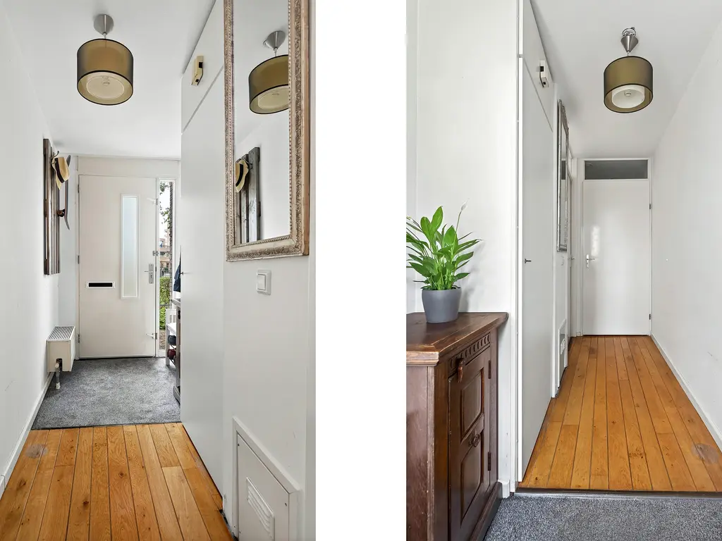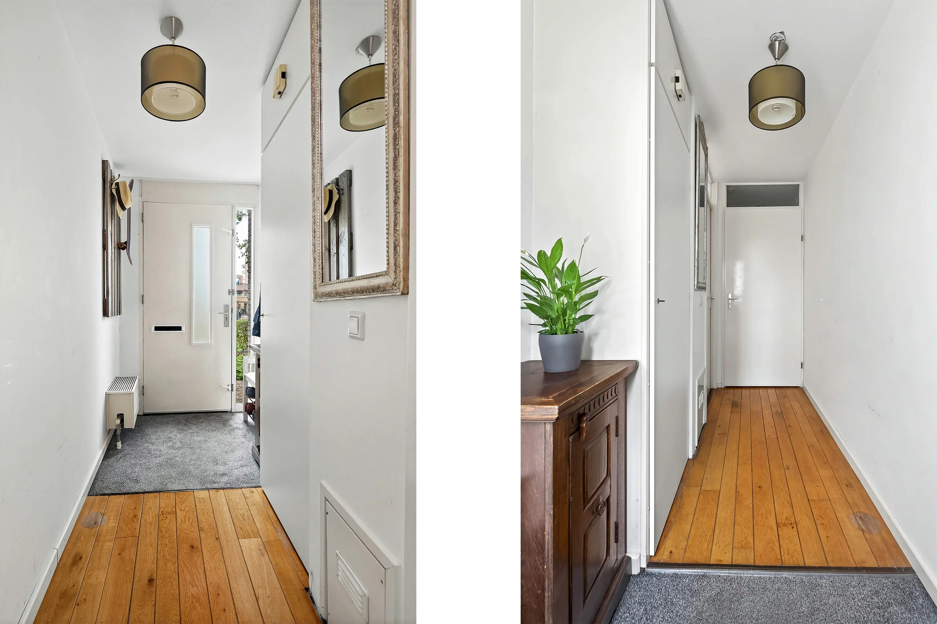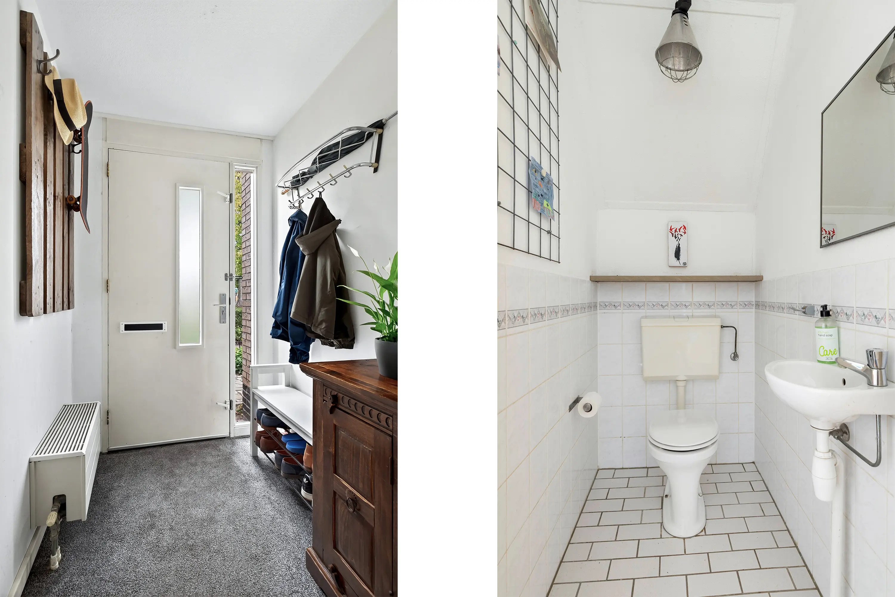 Via de voortuin stap je binnen in de hal met meterkast, toiletruimte en plek voor de garderobe. Vanuit hier bereik je de lichte woonkamer en open keuken.