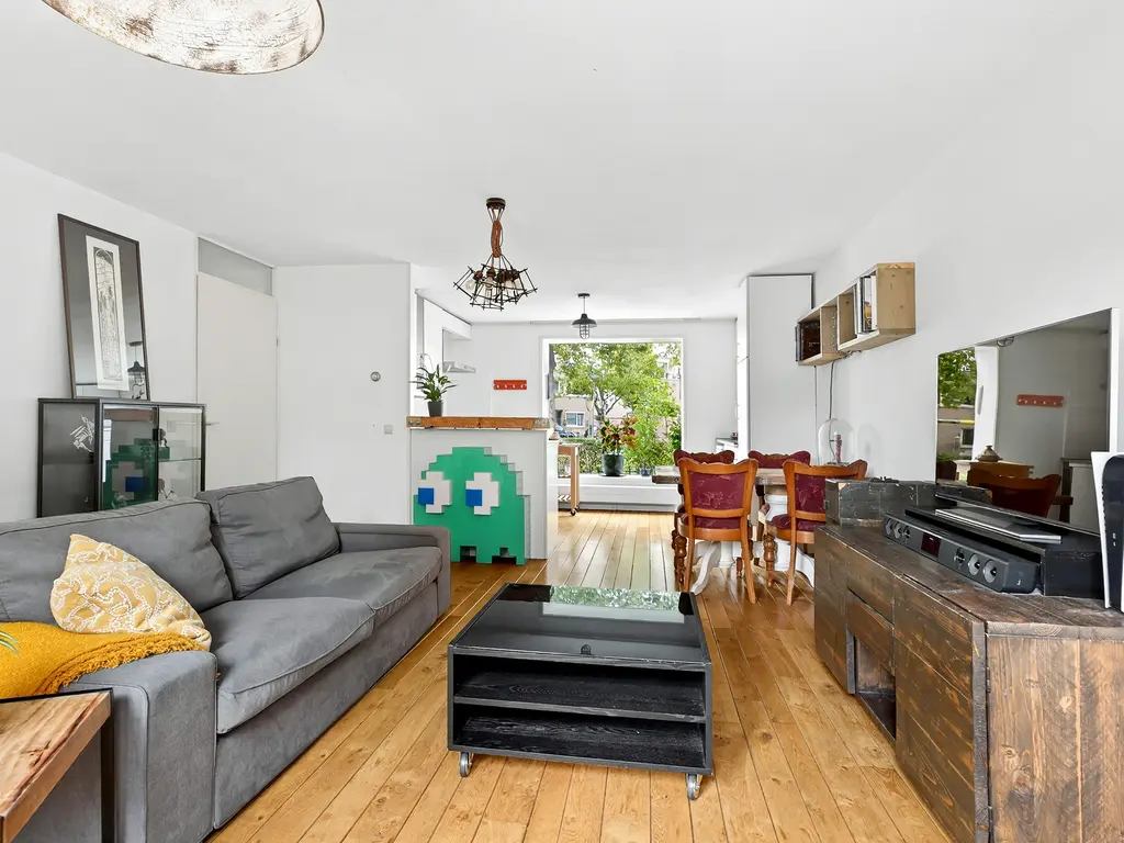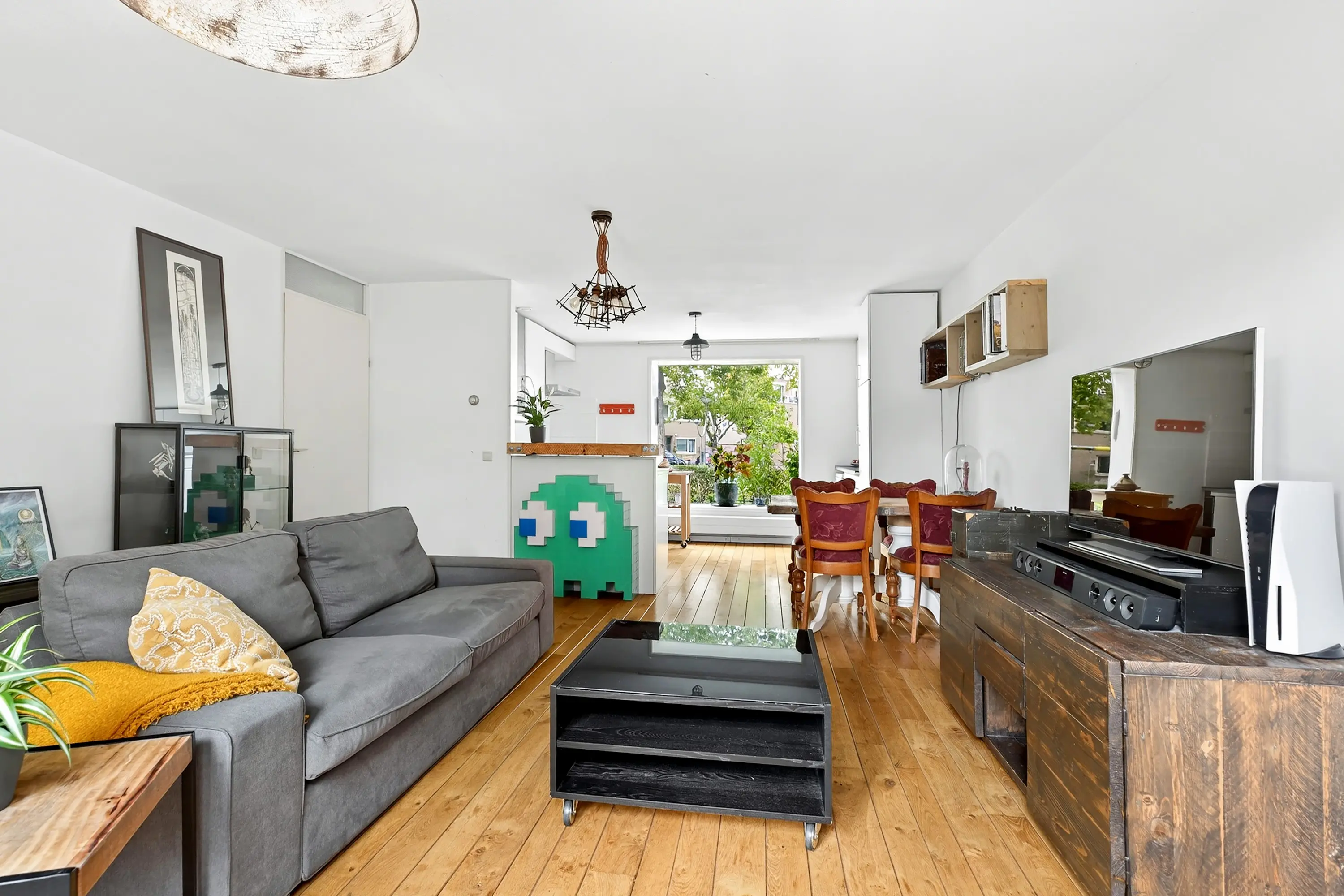 De tuingerichte woonkamer (ca. 29 m²) is heerlijk licht en ruim en voorzien van openslaande deuren naar de achtertuin. De gehele begane grond is afgewerkt met een houten vloer die de warme uitstraling van het huis versterkt. Via de tussenhal is er toegang tot de trap naar de eerste verdieping en een deur naar de tuin.