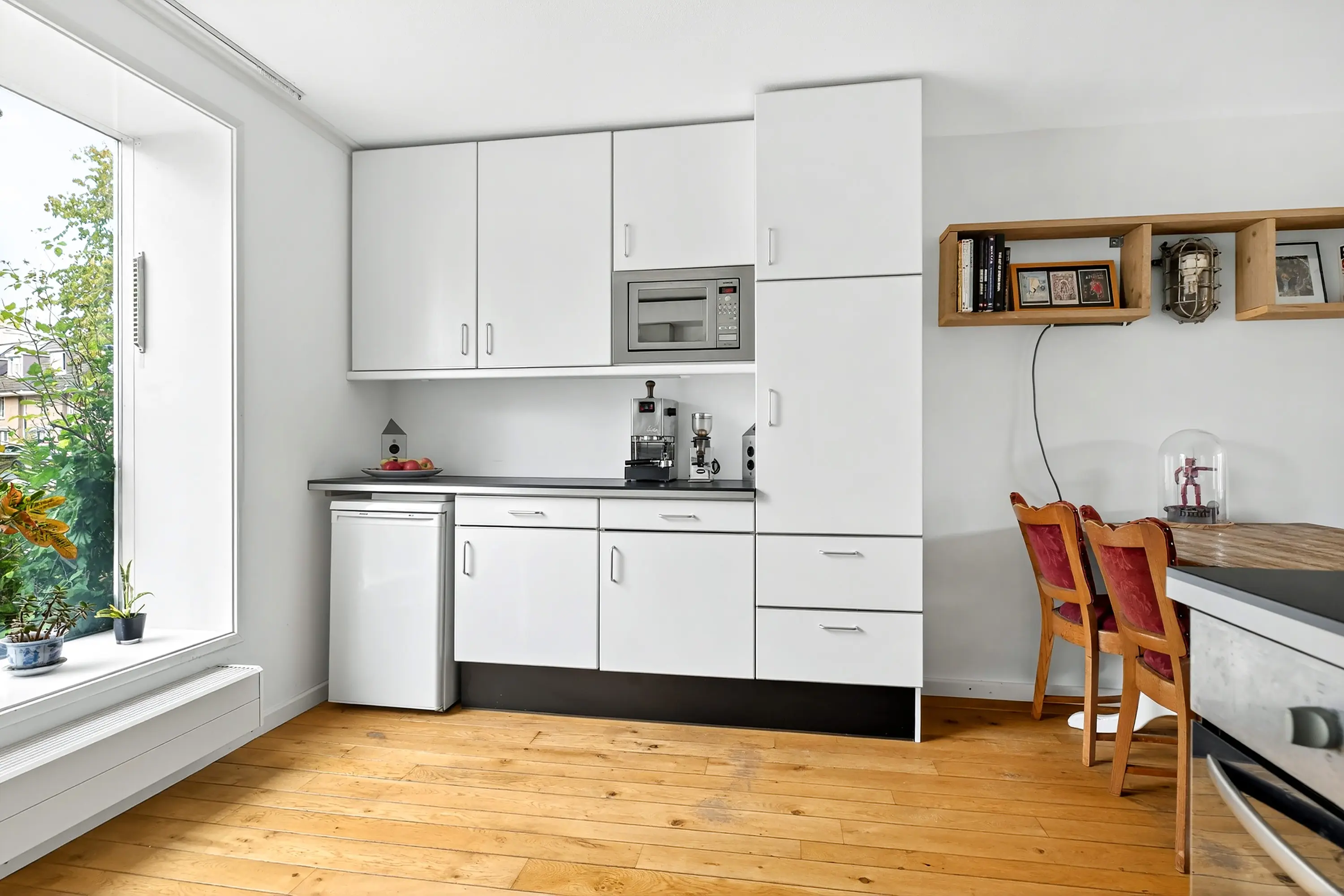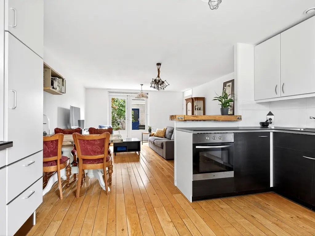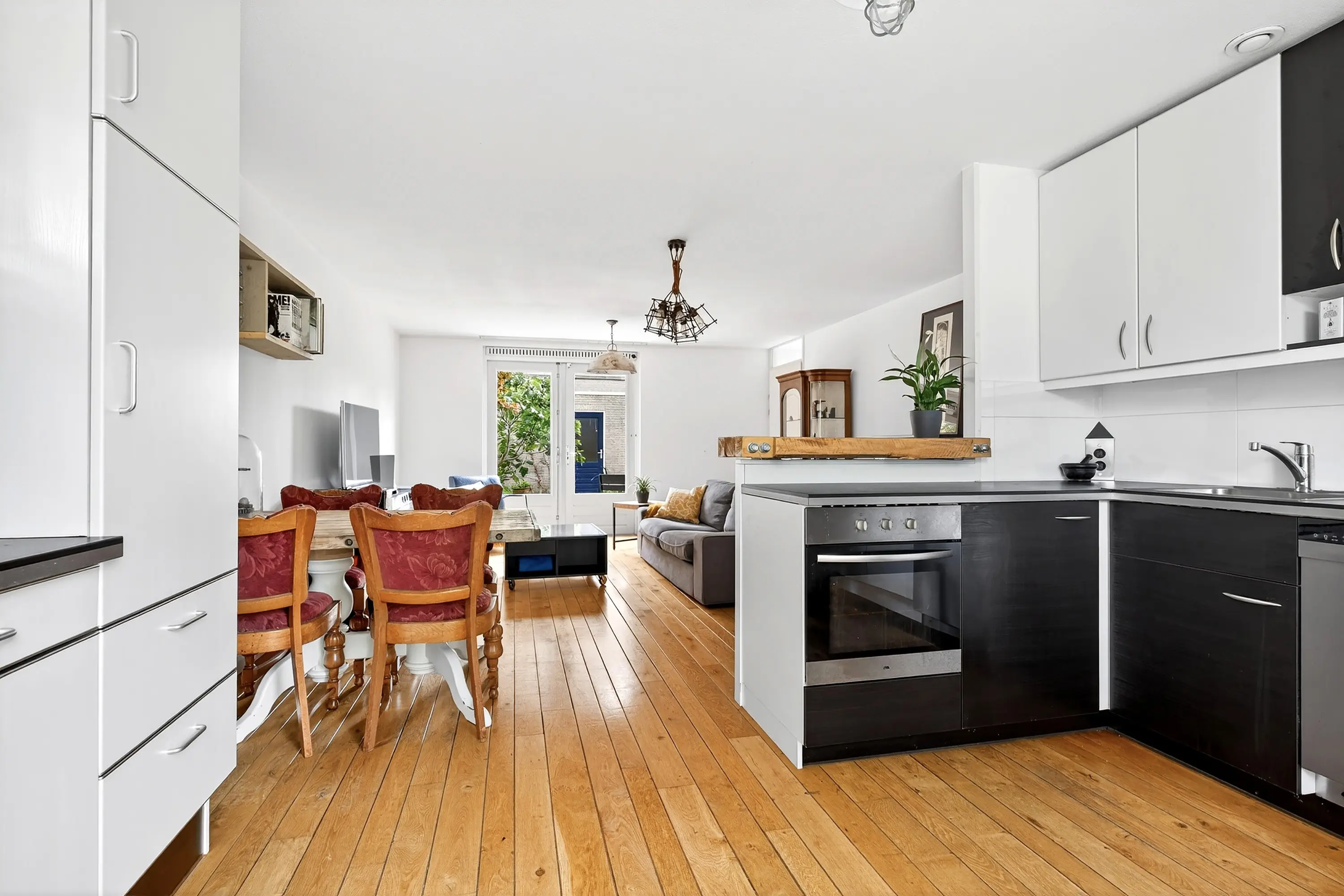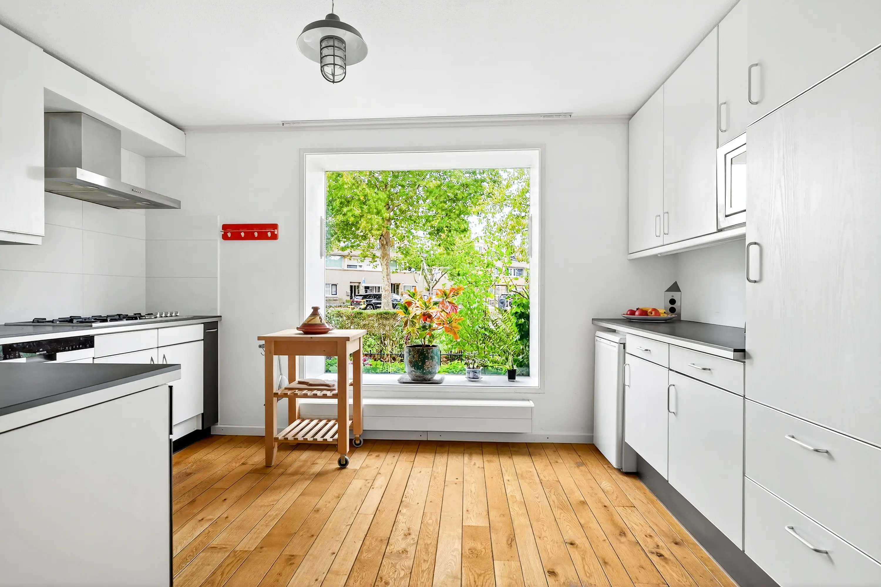 De keuken (ca. 13 m²) aan de voorzijde biedt een fijn uitzicht over de groenstrook met de speeltuin en is uitgevoerd in een hoekopstelling met diverse inbouwapparatuur: een koelkast, oven, magnetron, vaatwasser en een 5-pits gaskookplaat met RVS afzuigkap. De grote raampartijen zorgen voor veel daglicht.