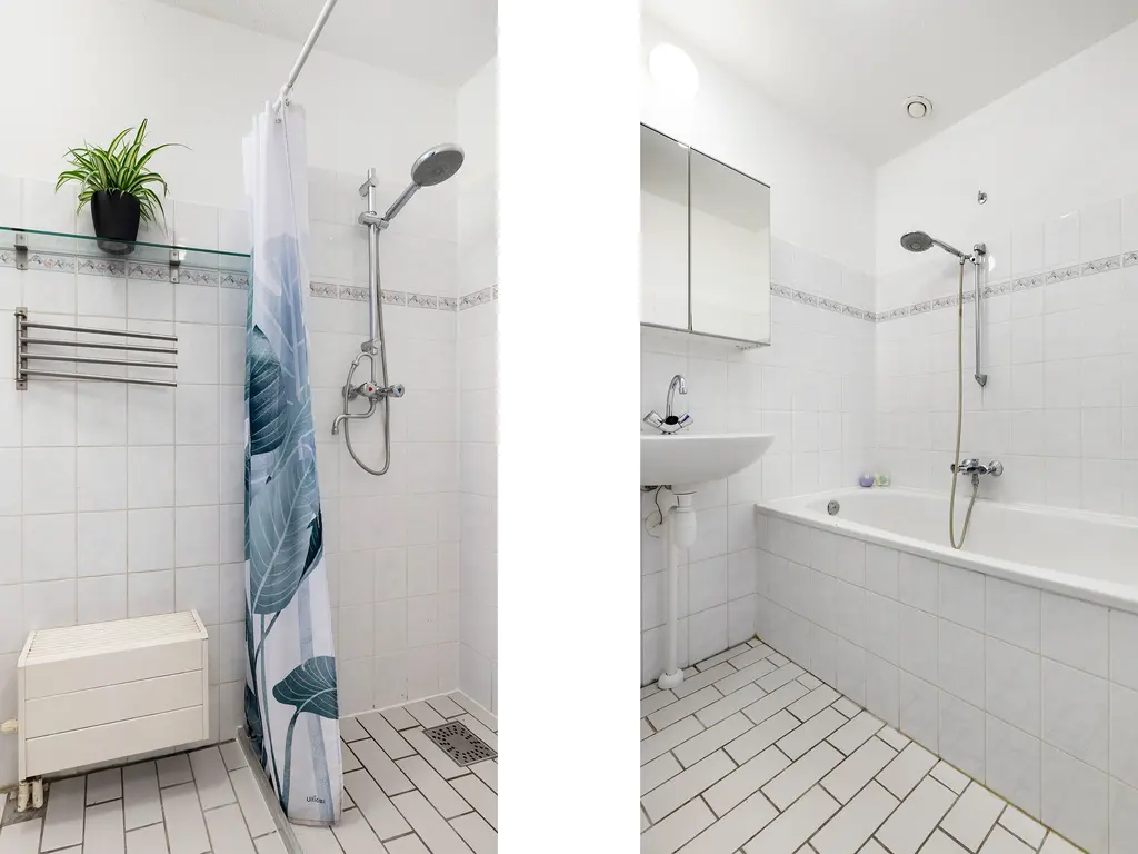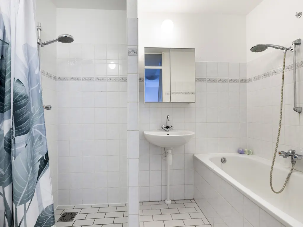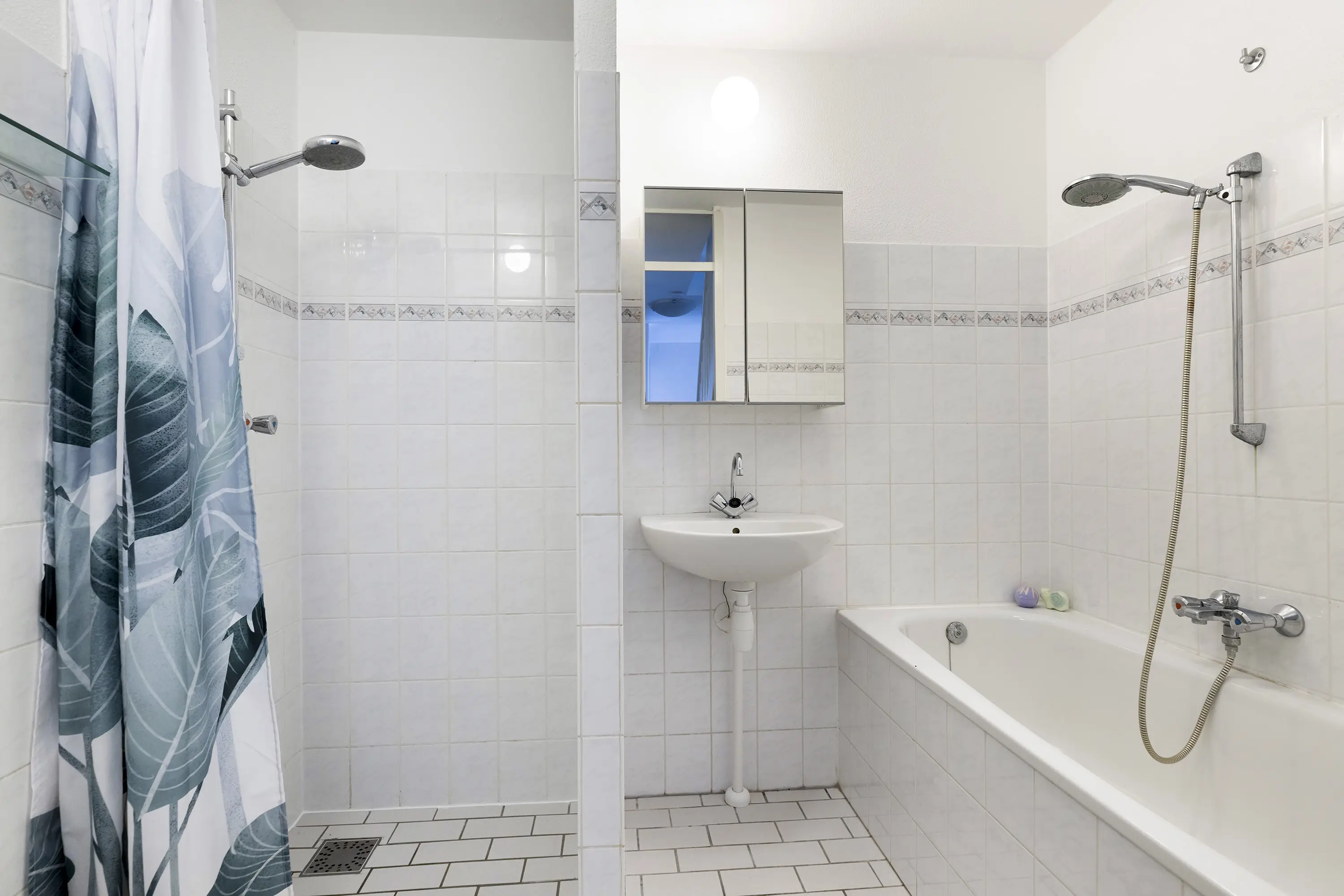 De badkamer (ca. 4 m²) is eveneens licht en netjes uitgevoerd en beschikt over een ligbad, een aparte douchecabine en een vaste wastafel.