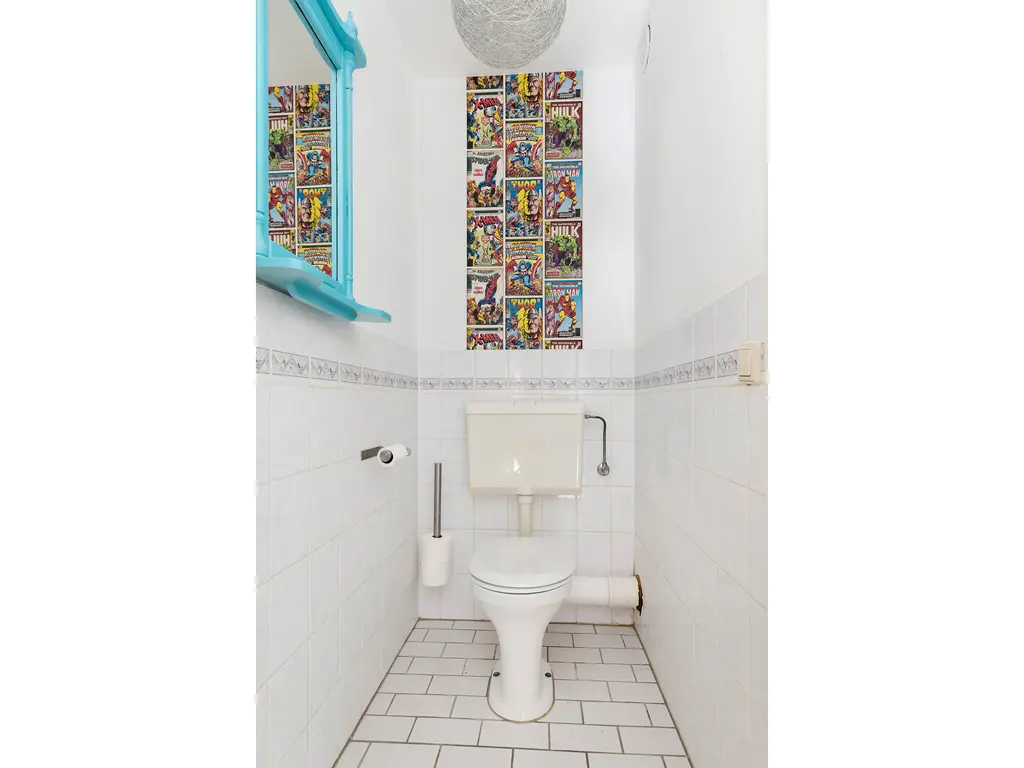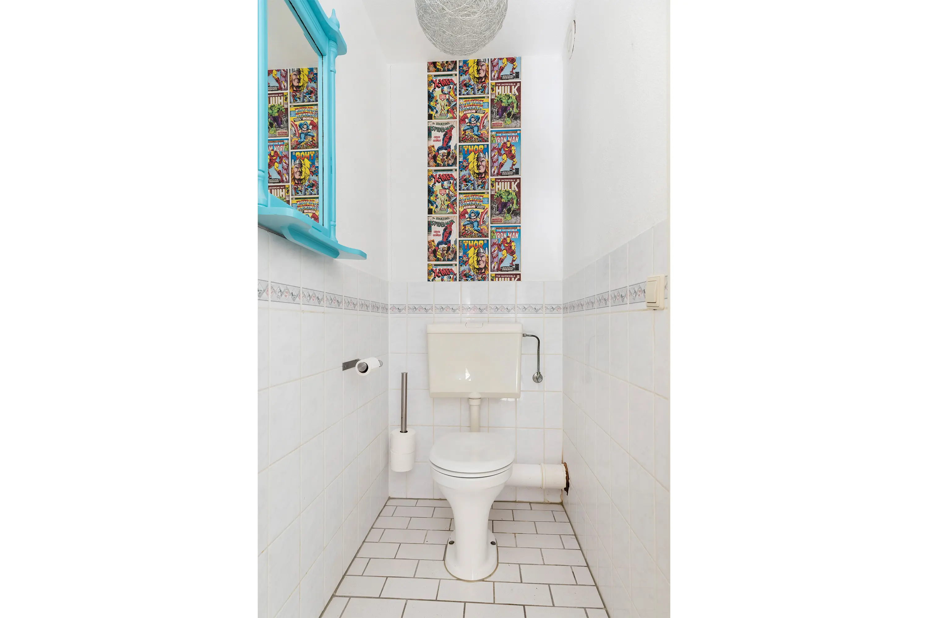 De toiletruimte is voorzien van een duoblok toilet en gedeeltelijk betegeld in een lichte kleurstelling.