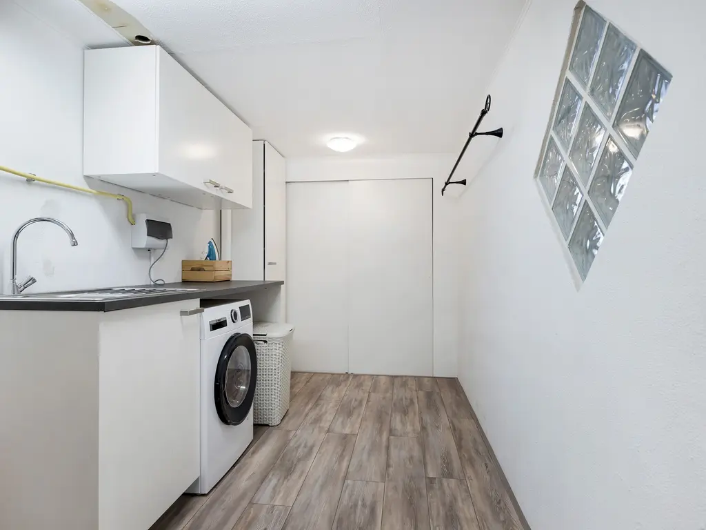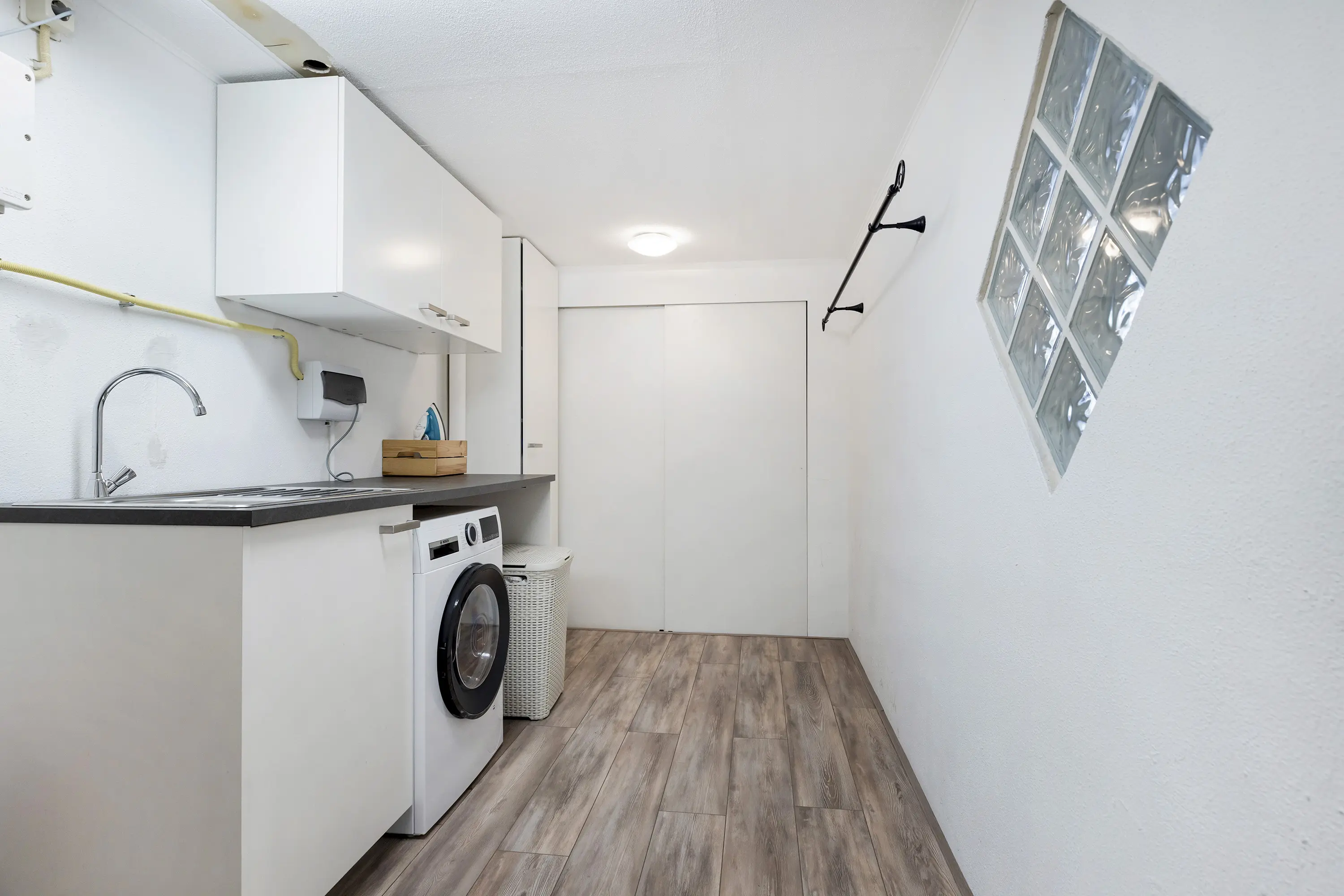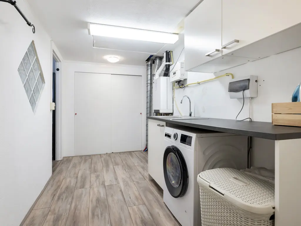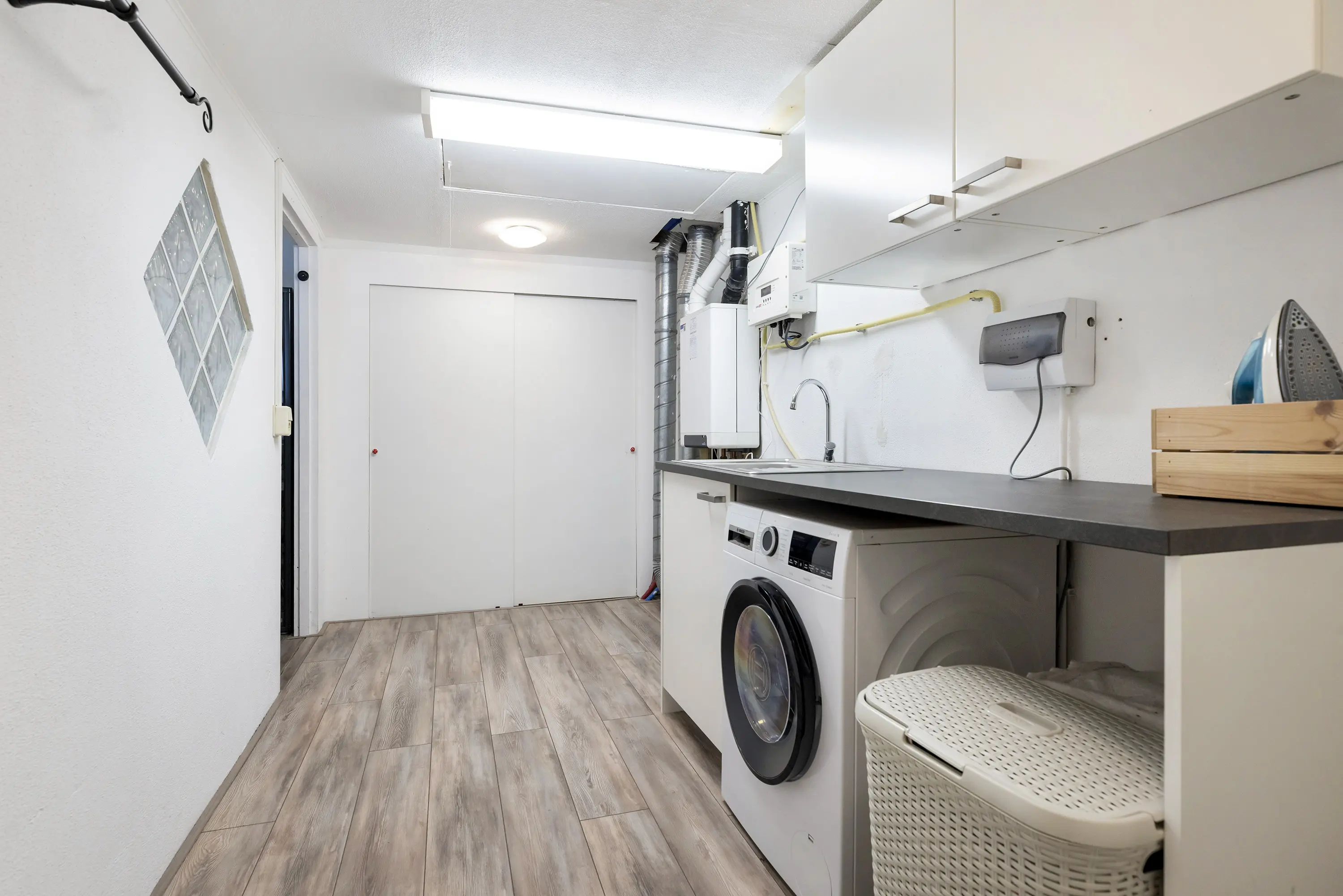 Er is een aparte technische ruimte (ca. 9 m²) met de CV-installatie, mechanische ventilatie, aansluitingen voor wasmachine en droger, de omvormer voor de zonnepanelen en een vaste wastafel. Achter de schuifdeuren bevindt zich handige bergruimte. Vanuit deze ruimte is ook de bergvliering te bereiken.