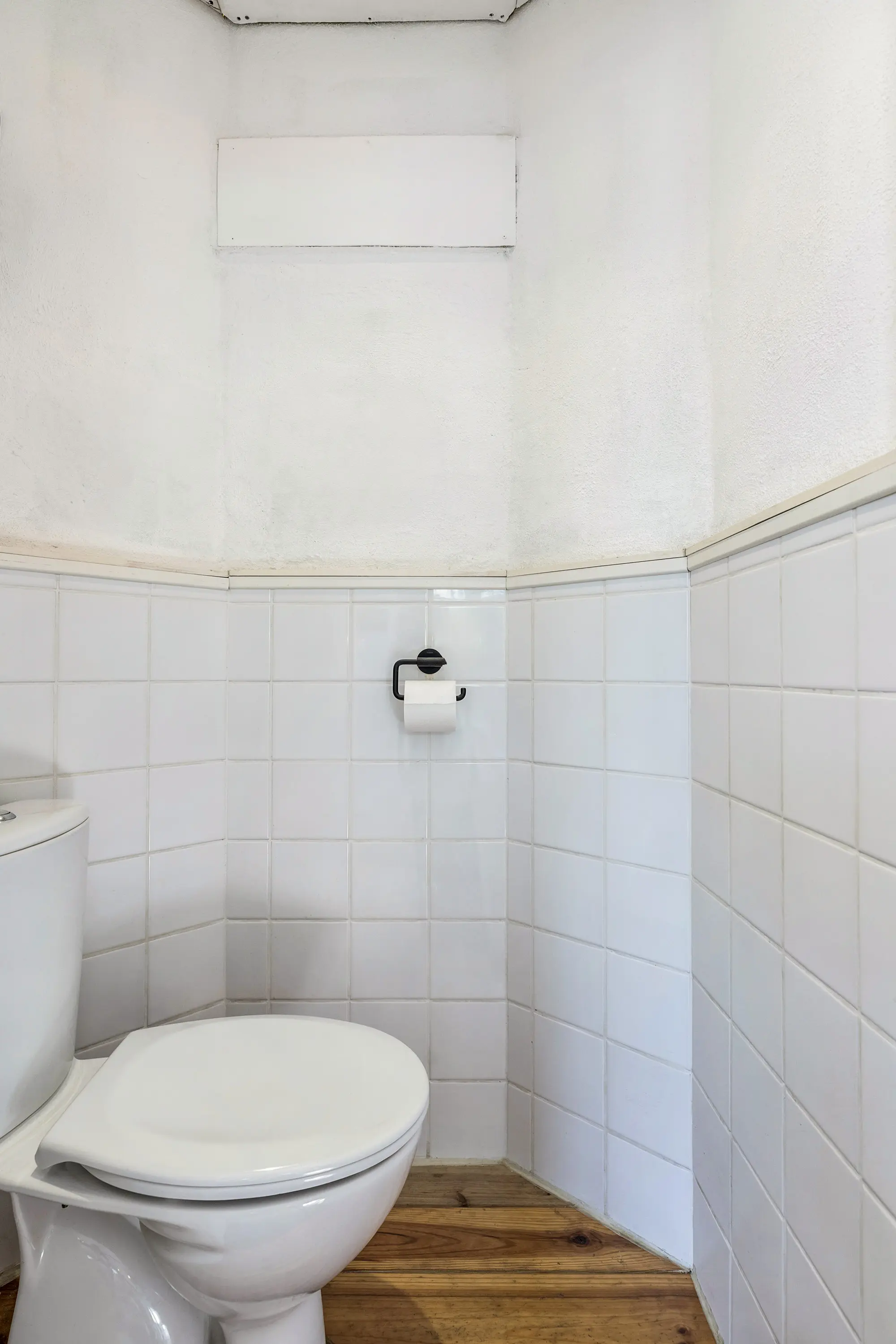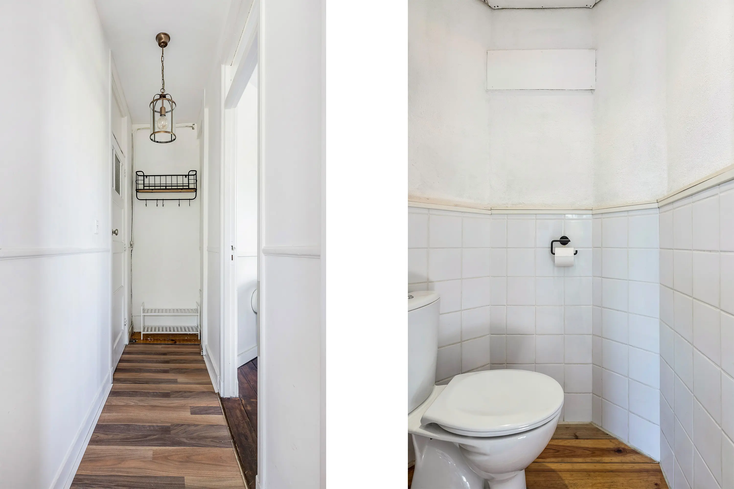 Via de overloop kom je binnen in een gezellige open ruimte. Aan de linkerkant tref je gelijk het toilet.