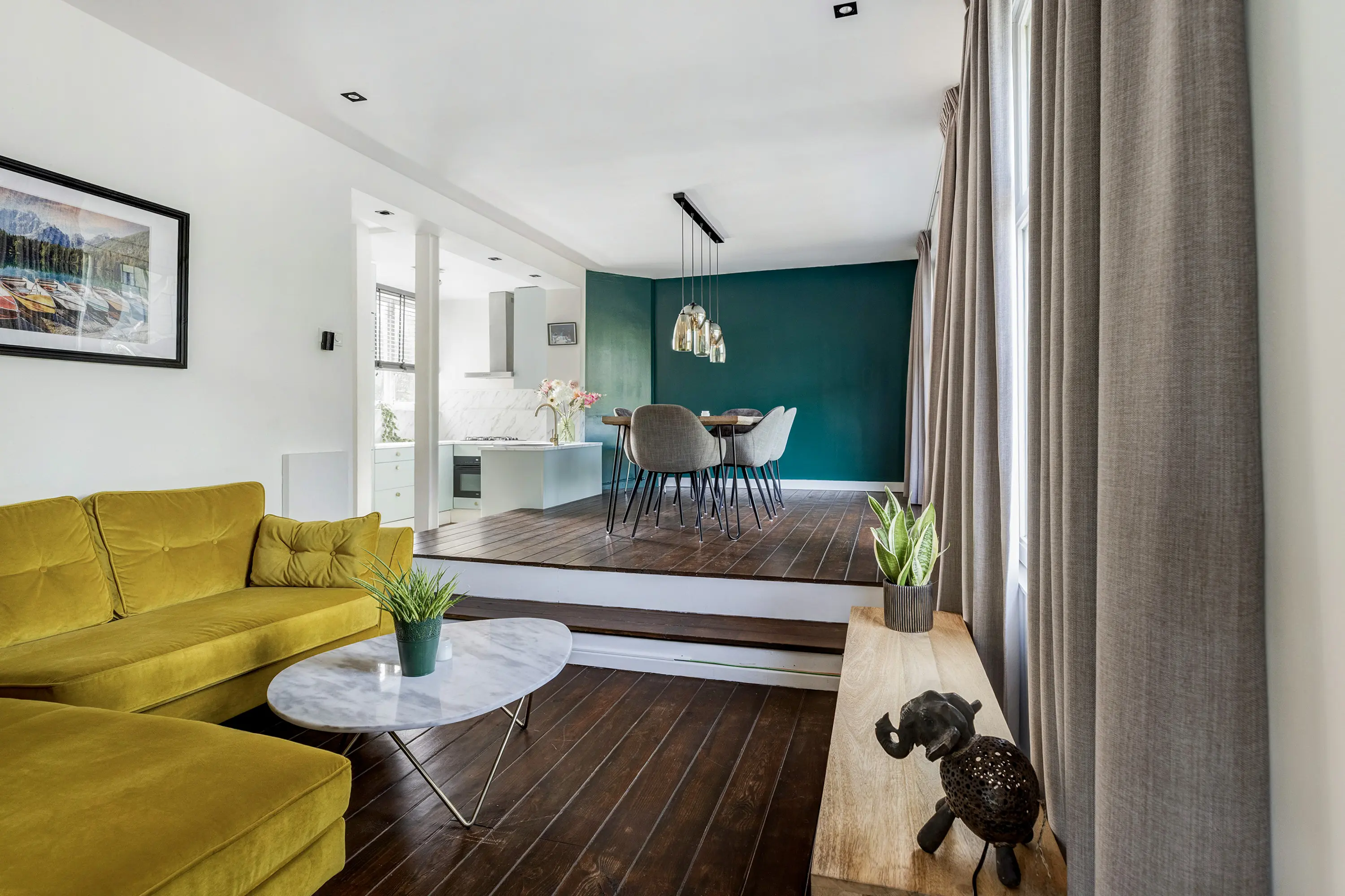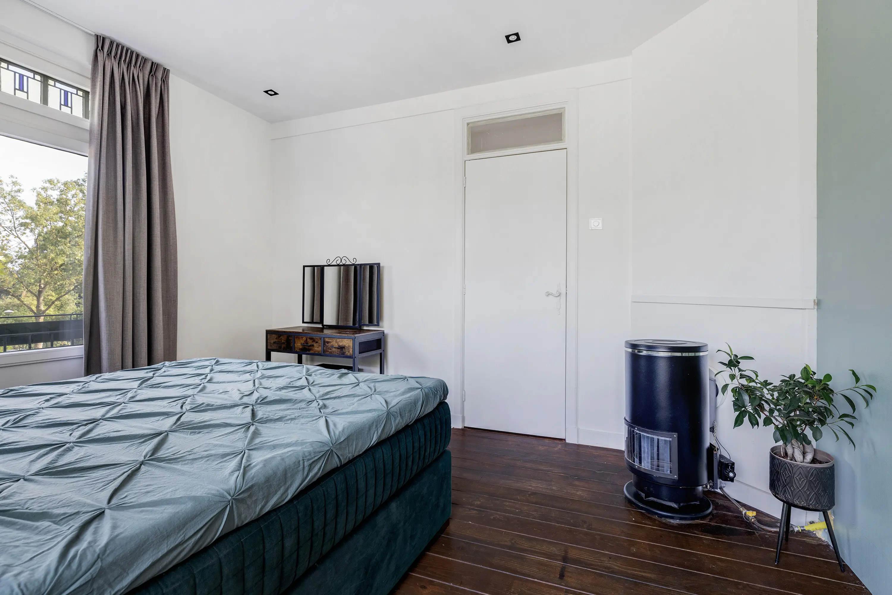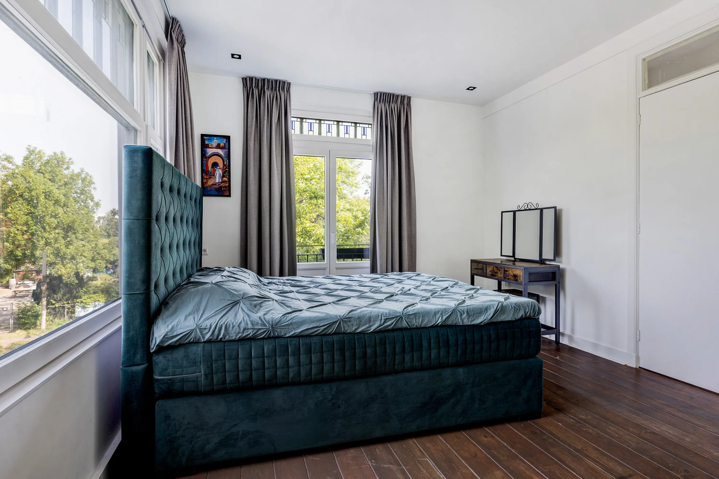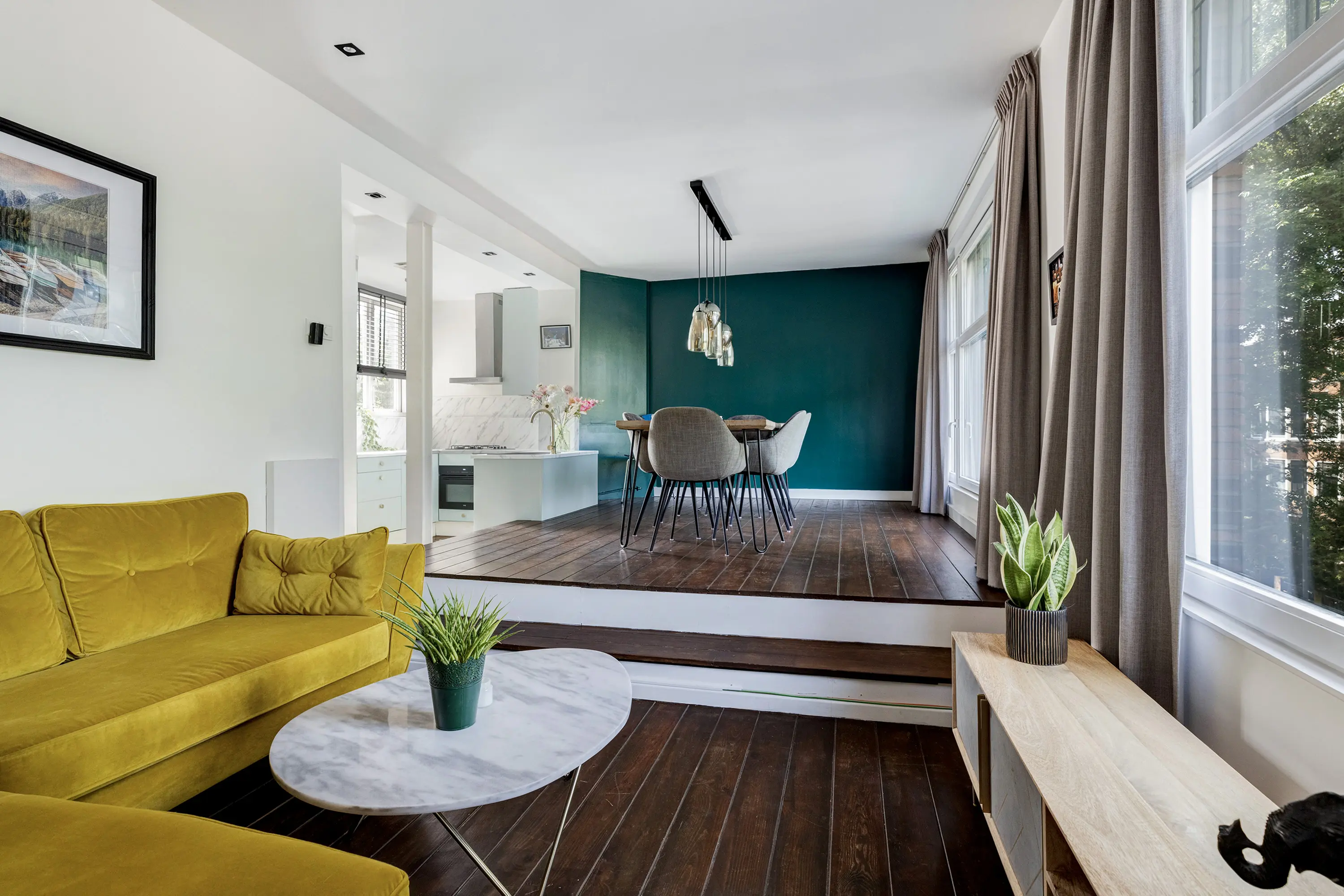 Op het verhoogde deel van de woning bevindt zich een fijne eetkamer. In het verlengde van de eetkamer, is de woonkamer. Vanuit de woonkamer kom je binnen in de ruime slaapkamer met open slaande deuren naar het Franse balkon. Achter de hoofdslaapkamer is een hal met toegang naar de tweede slaapkamer en de badkamer.
