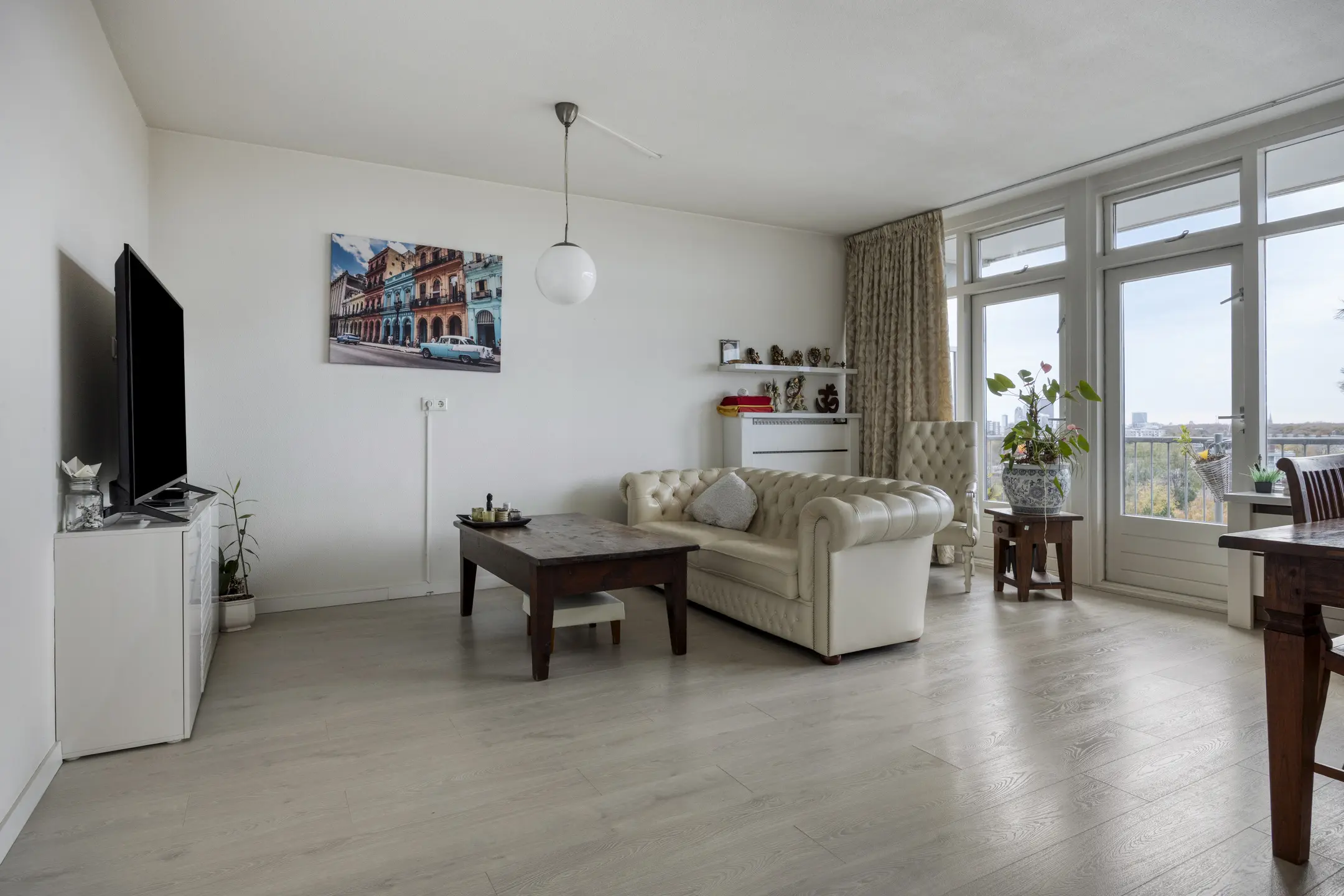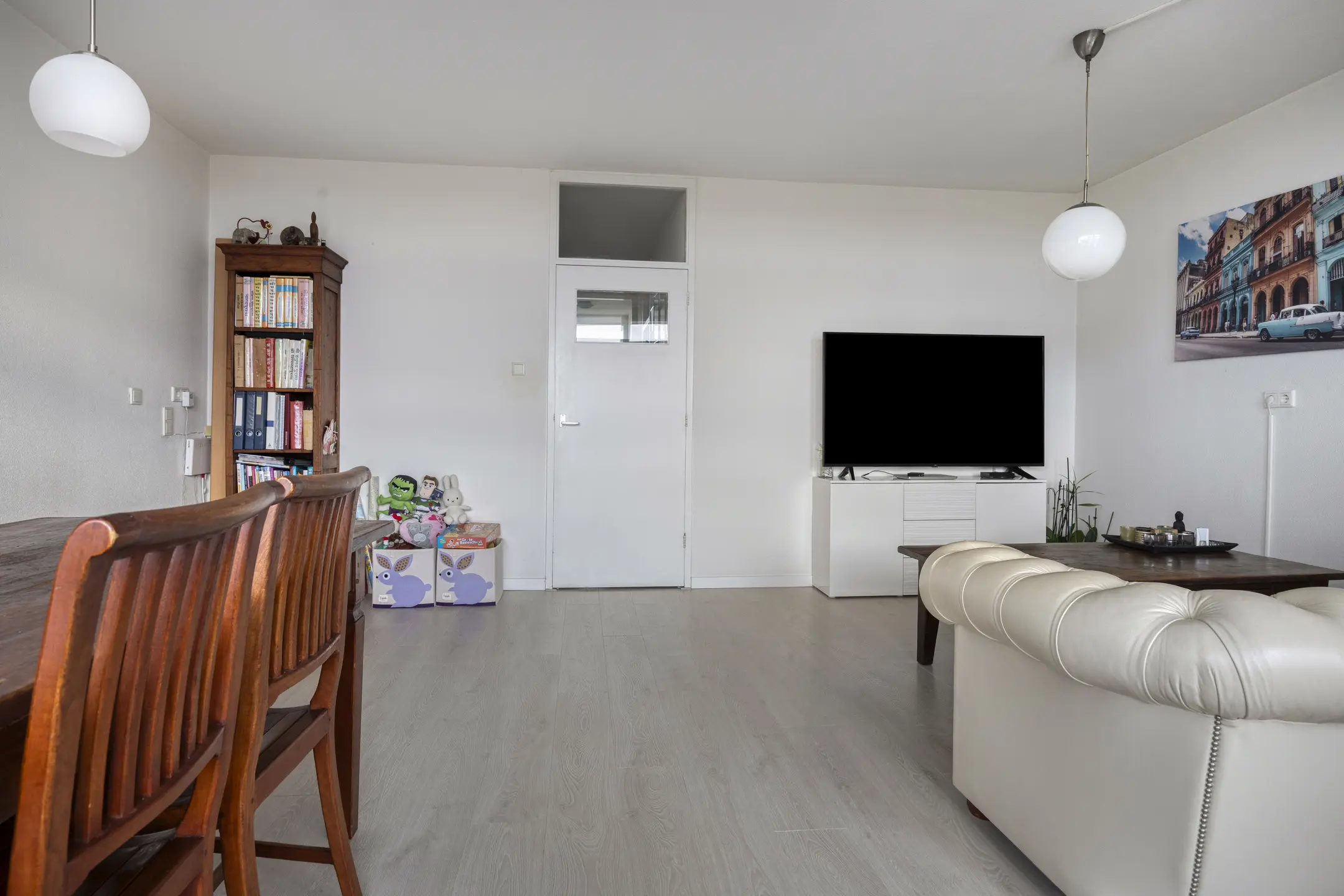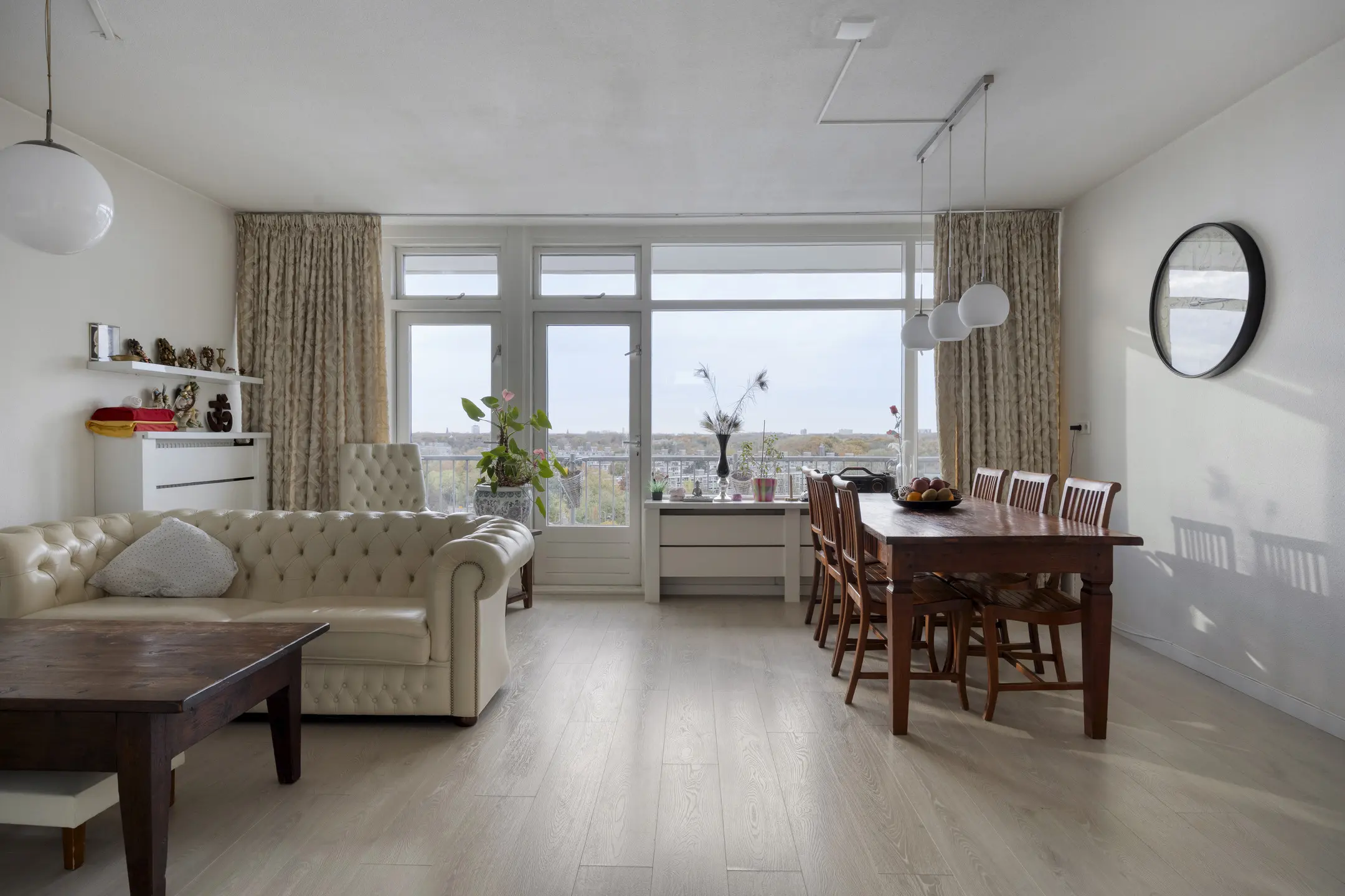 De lichte, ruime woonkamer vormt het hart van de woning. Dankzij de brede raampartij stroomt het daglicht binnen, en via de deur naar het royale balkon geniet je van de middag- en avondzon – hét perfecte plekje voor koffie, borrel of diner met uitzicht!