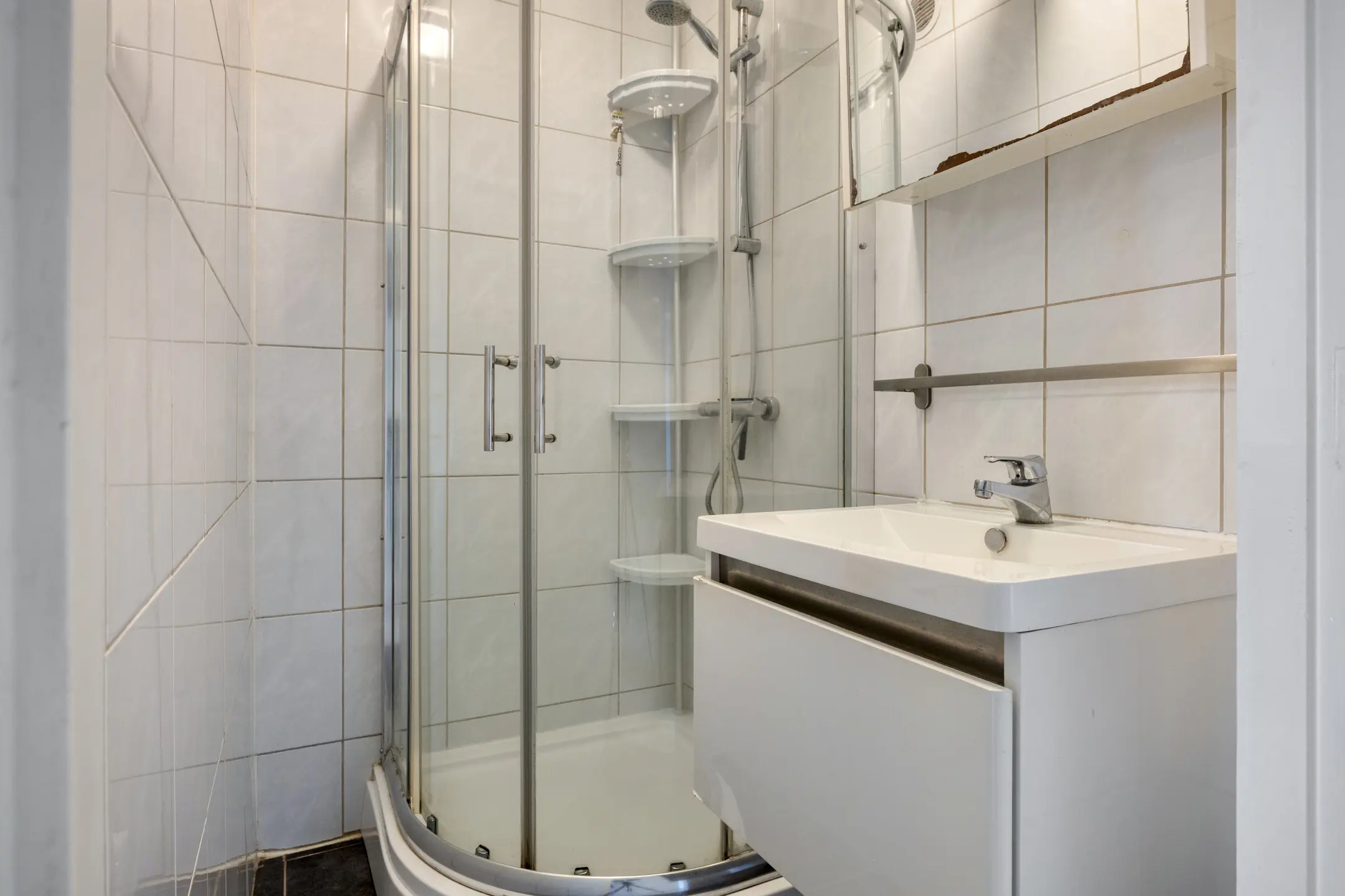 De nette badkamer biedt een fijne inloopdouche en modern wastafelmeubel.