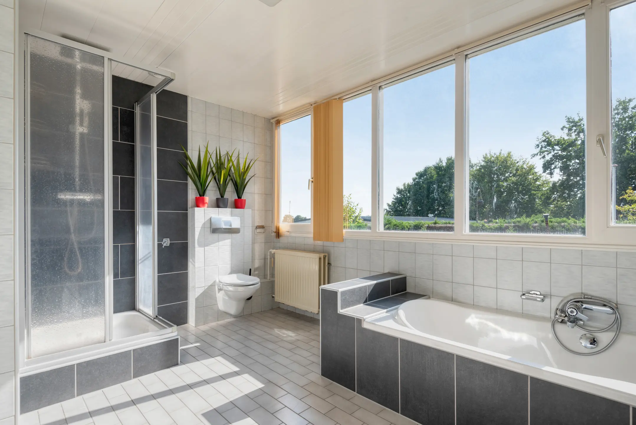 De badkamer (origineel uit 1992) is netjes onderhouden en voorzien van een ligbad, aparte douche, wastafel en toilet.