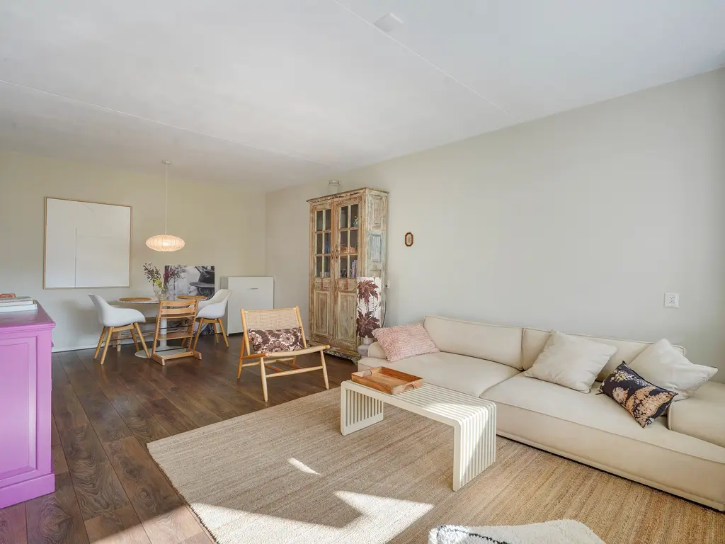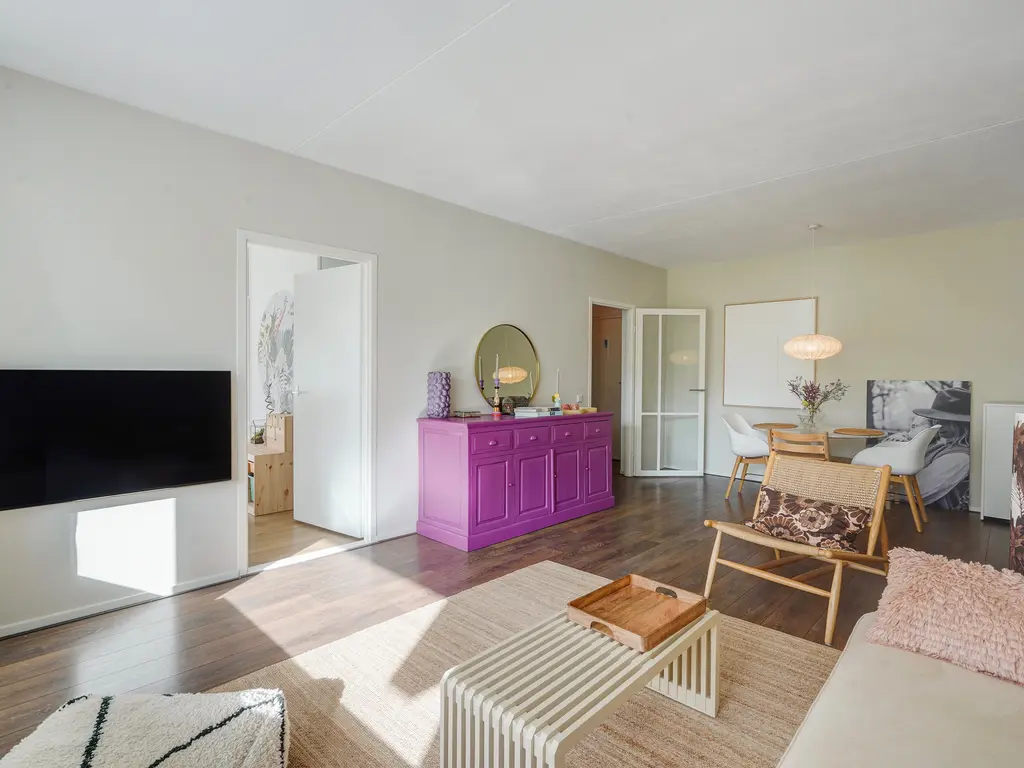 De woonkamer is van een goed formaat en ziet er keurig uit, met een mooie laminaat vloer en gestukte wanden. De woonkamer grenst aan het balkon. Het balkon is te betreden met een openslaande deur. Het Balkon is zeer ruim en gelegen over de gehele breedte van de woning. Het balkon is gelegen op het Zuidwesten en heeft een zeer groot deel van de dag zon. Het balkon ziet er goed onderhouden uit. De vloer ziet er keurig uit en ook de onderzijde van het balkon van de bovenburen is goed (recentelijk geschilderd). Er is een hand bediend zonnescherm aanwezig op het balkon.