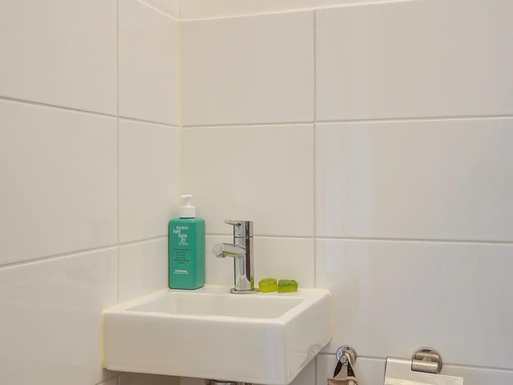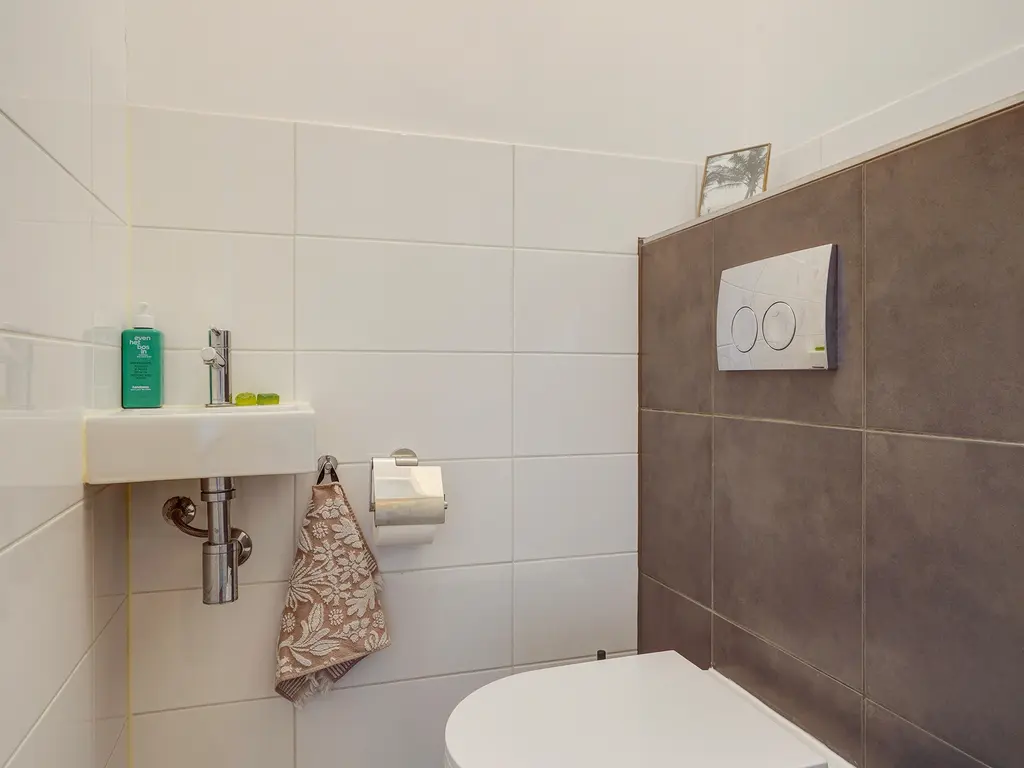 Na binnenkomst van het appartement op de eerste verdieping, treffen we de hal. In de hal is de toiletruimte te betreden. De toiletruimte ziet er netjes en modern uit en heeft een hangend toilet met inbouw reservoir en fontein met wasbak.