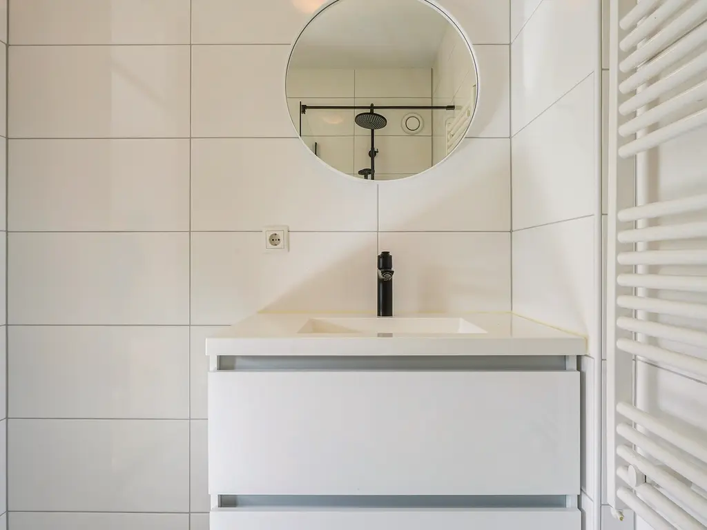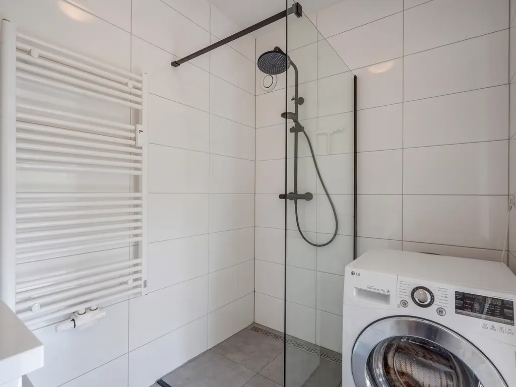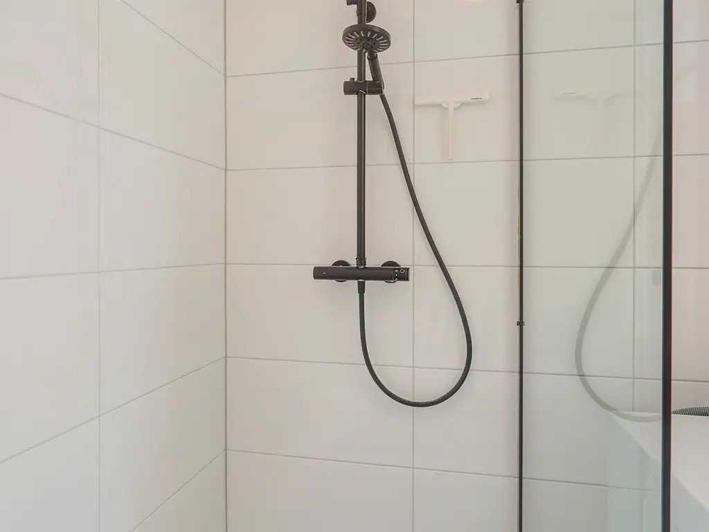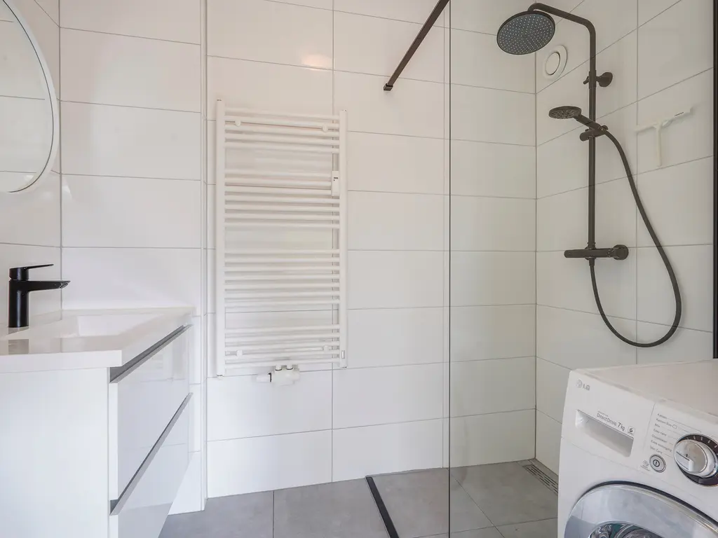 Vanuit de slaapkamer is er toegang tot de badkamer. De badkamer is in 2018 geïnstalleerd en voorzien van een inloopdouche, wasbak met meubel en handdoekradiator. De kranen e.d. zijn in zwart uitgevoerd en het oogt netjes en modern. Ook is in de badkamer de wasmachine geplaatst.