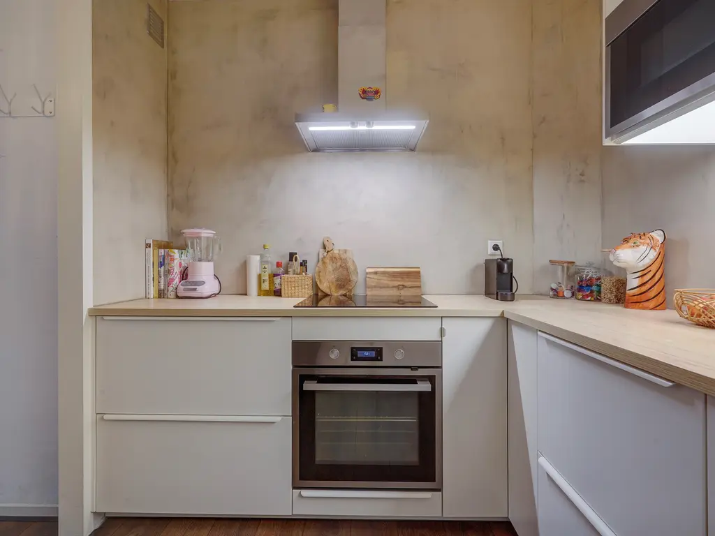 The hall also provides access to the kitchen. Installed in 2020, the kitchen is equipped with a dishwasher, oven, microwave, hot water tap, 4-burner induction cooktop, and a freestanding fridge-freezer. There's also ample cupboard space, and the wall behind the kitchen is neatly finished. The kitchen has a luxurious feel.