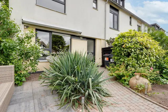 De zonnige diepe achtertuin van maar liefst bijna 15 meter biedt volop privacy en ligt naast een fraai plantsoen.