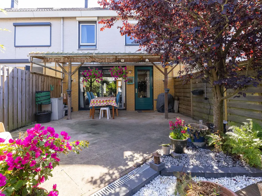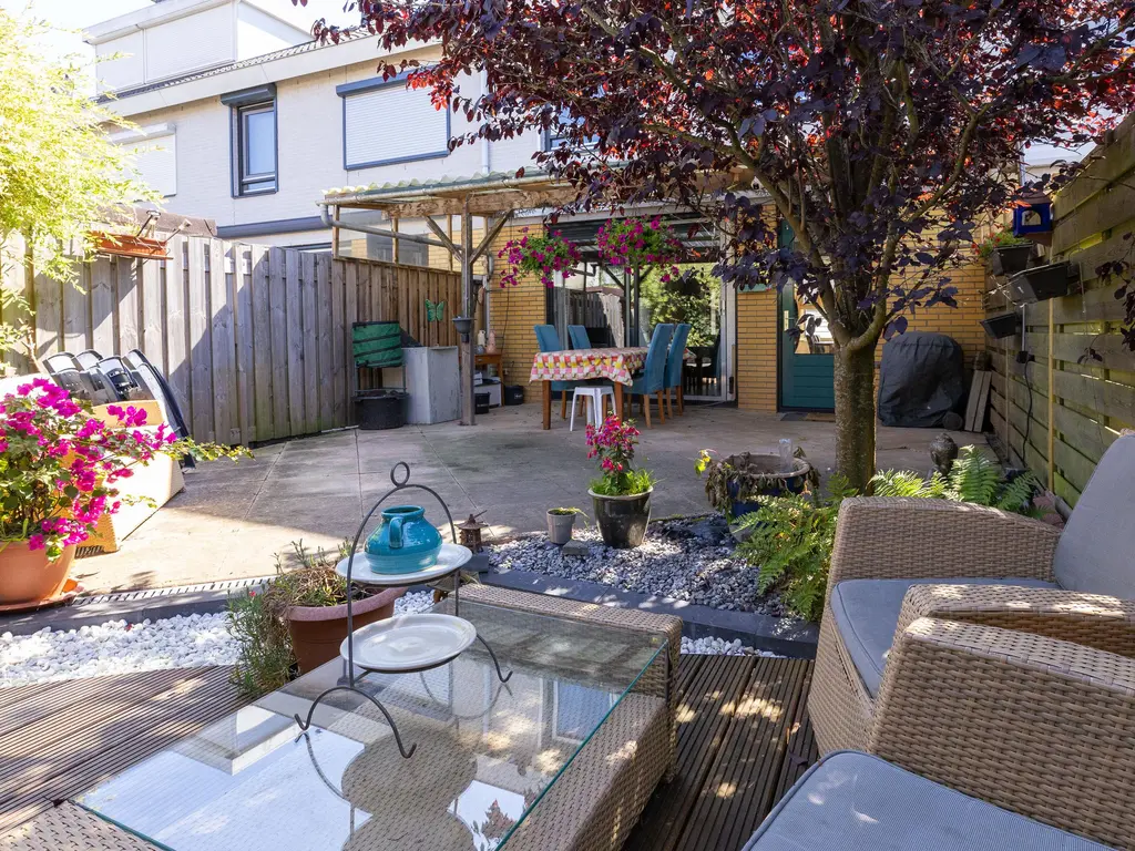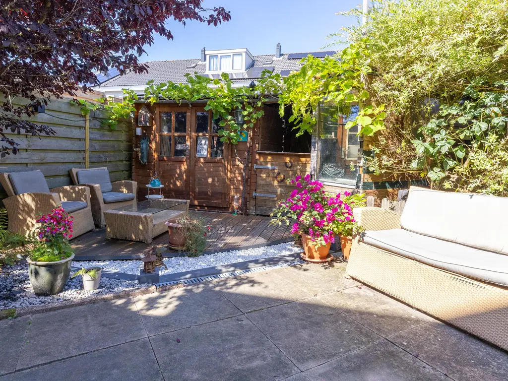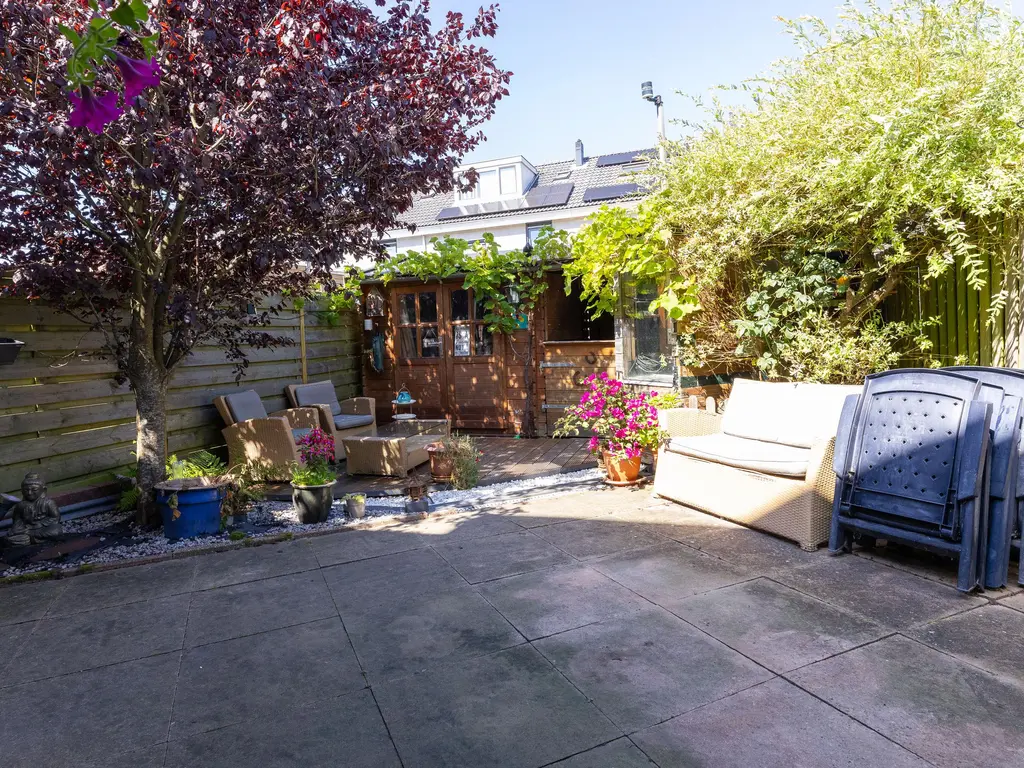 De voortuin is strak betegeld en de achtertuin biedt alles voor buiten genieten. De overkapping aan de woning maakt het mogelijk om beschut buiten te zitten. Achterin vindt u een houten berging en een tweede berging met toegang tot de achtergelegen steeg, ideaal voor fietsen, scooters of tuinspullen.