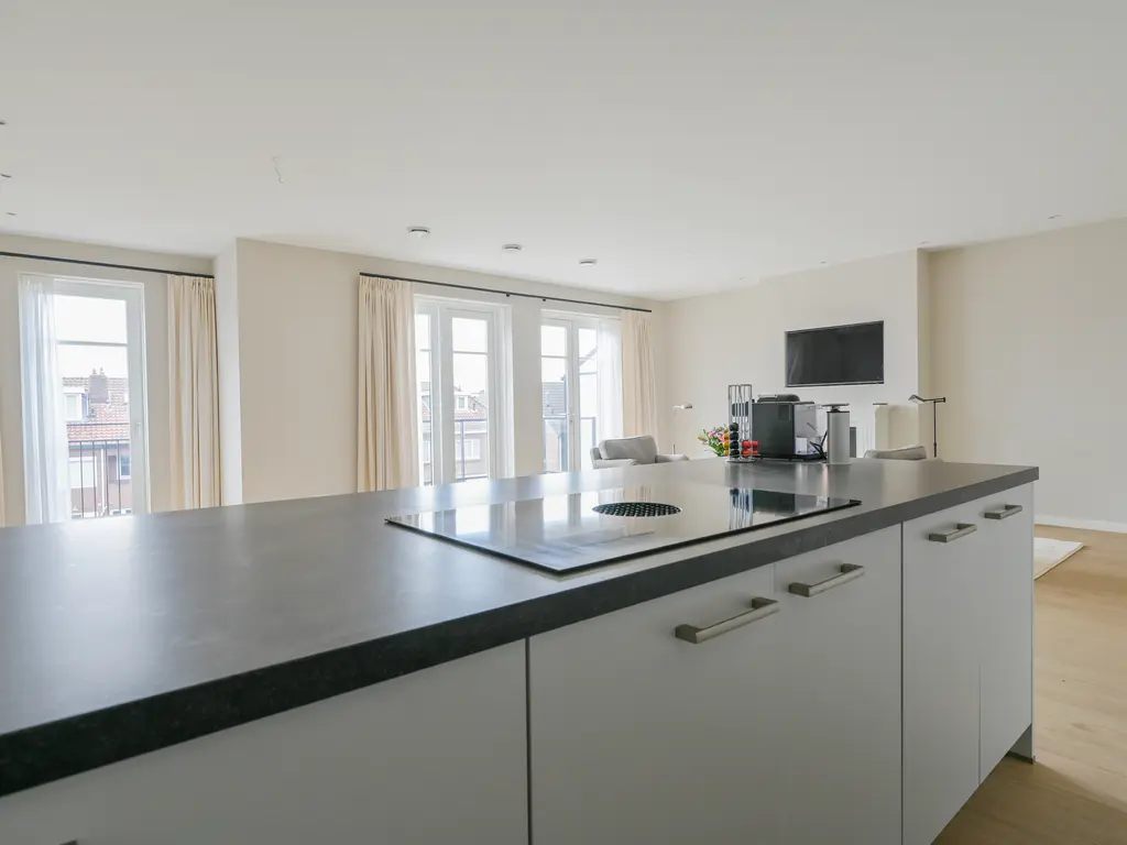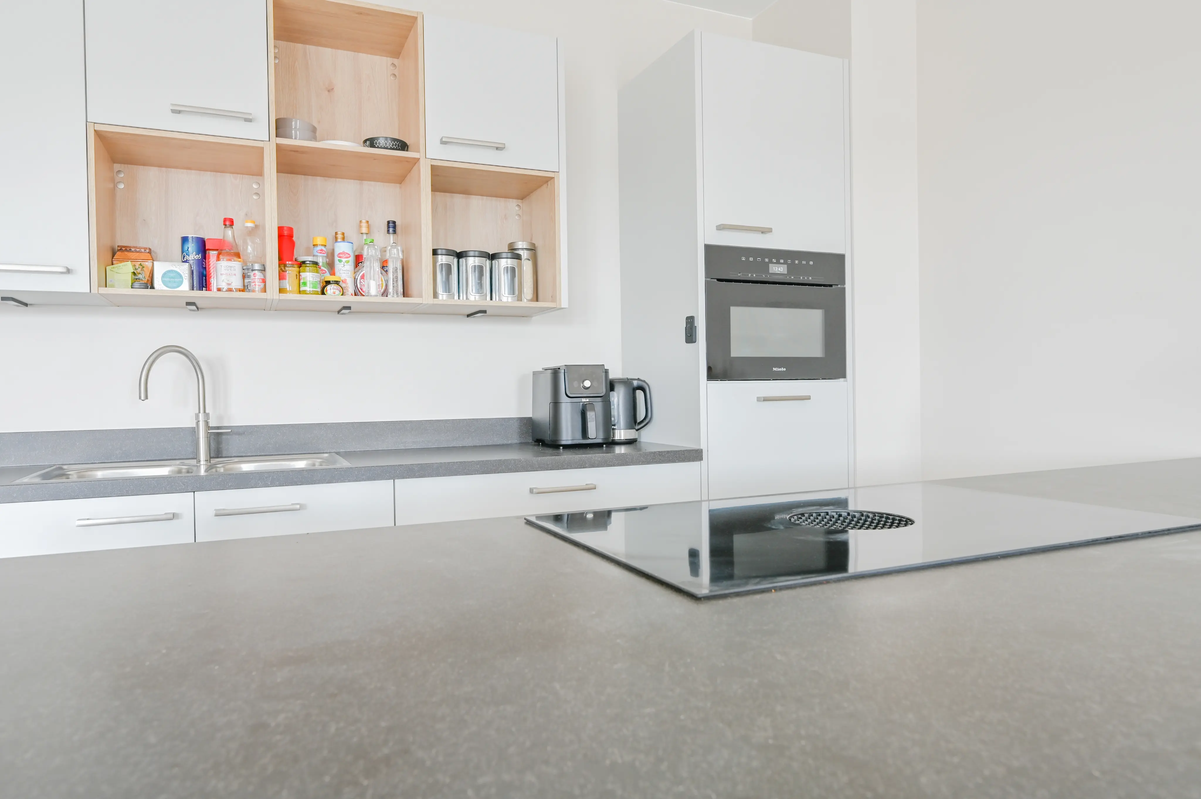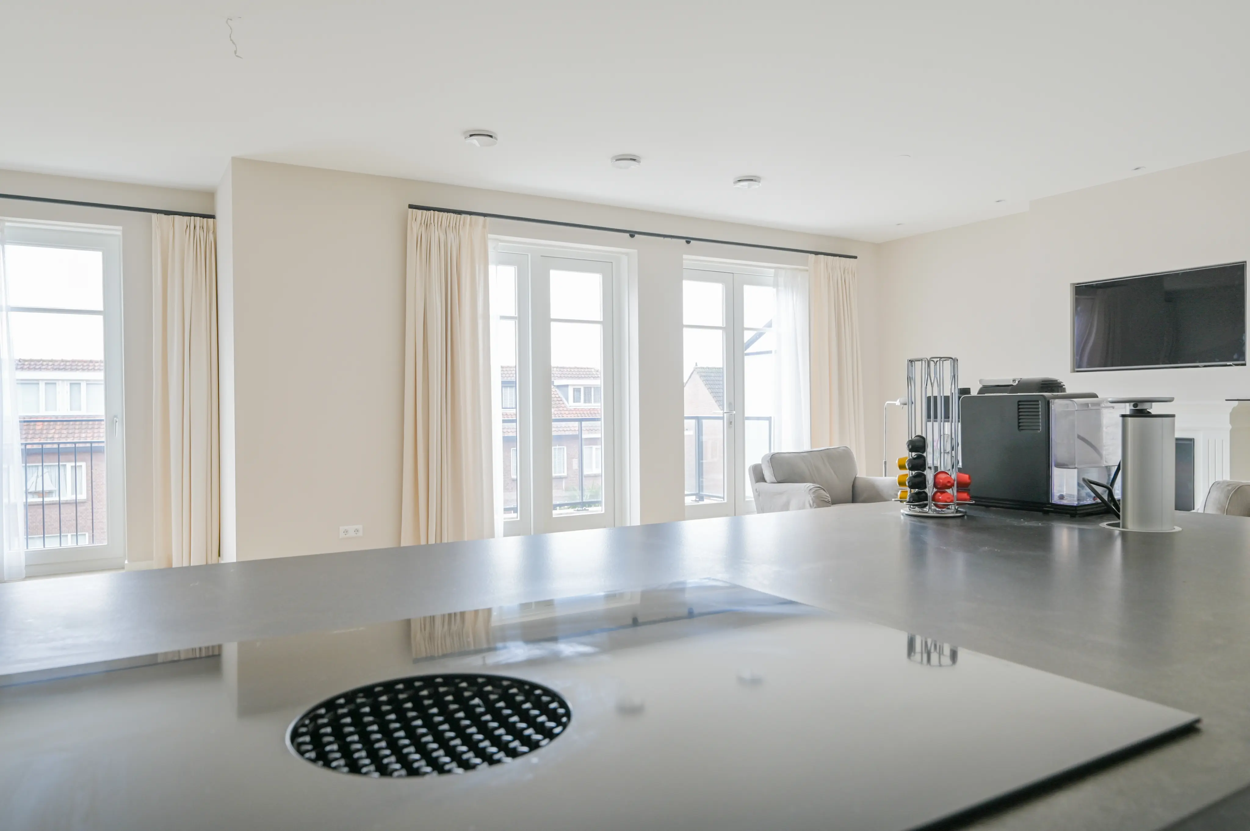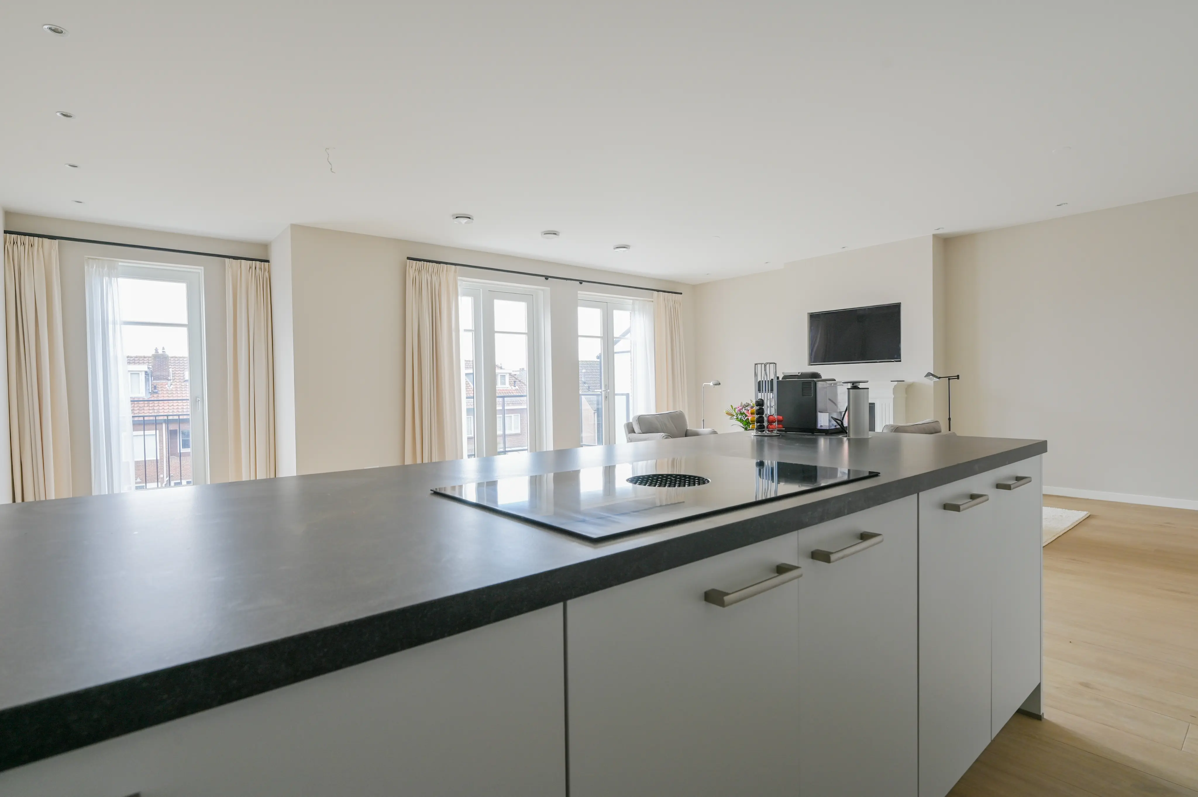 De lichte en ruime woonkamer (64 m²) bevindt zich op de tweede verdieping en heeft een open keuken met een modern kookeiland. Deze geeft toegang tot het ruime balkon (12,3m2) gelegen op het zuiden. De open keuken is compleet uitgerust met een inductiekookplaat, koelkast, vriezer en vaatwasser.