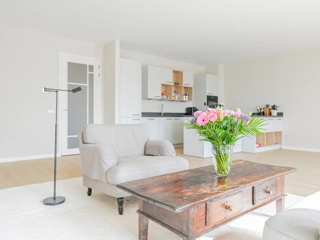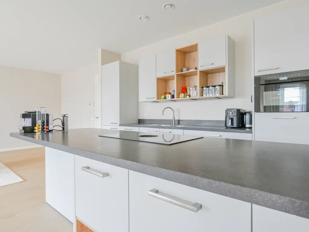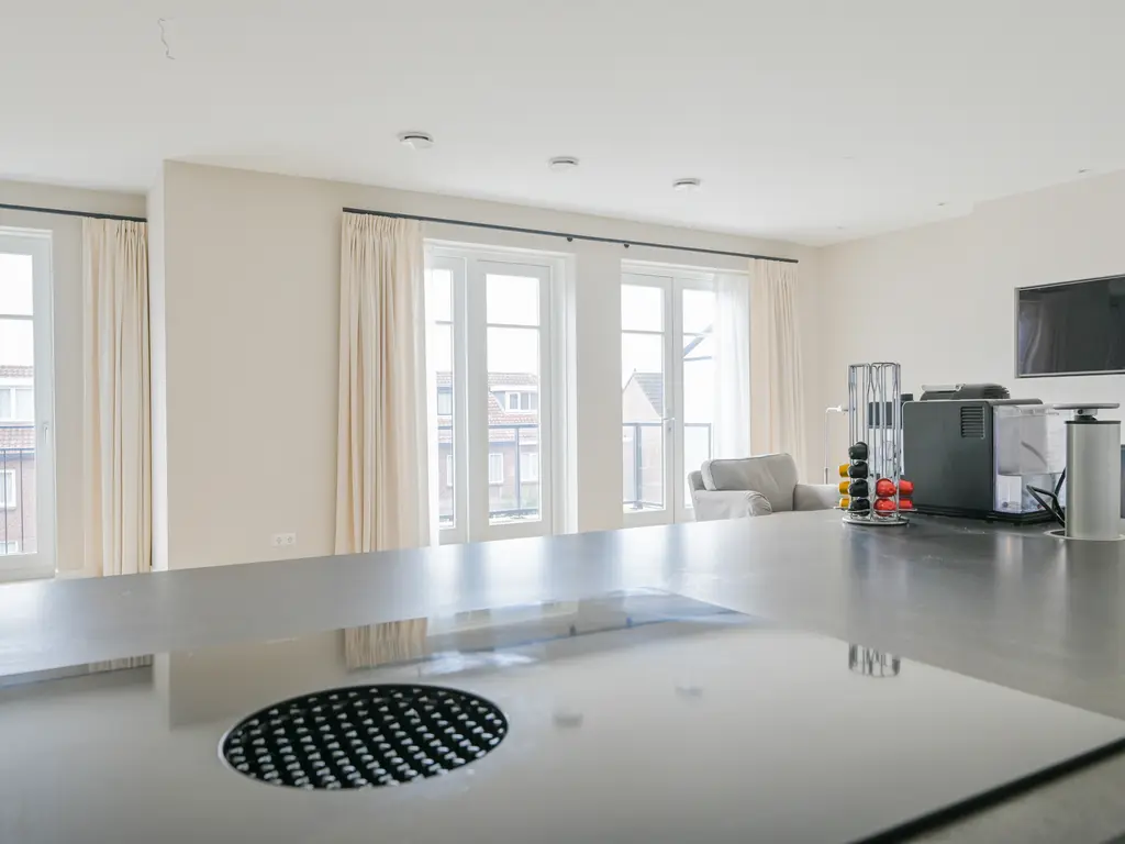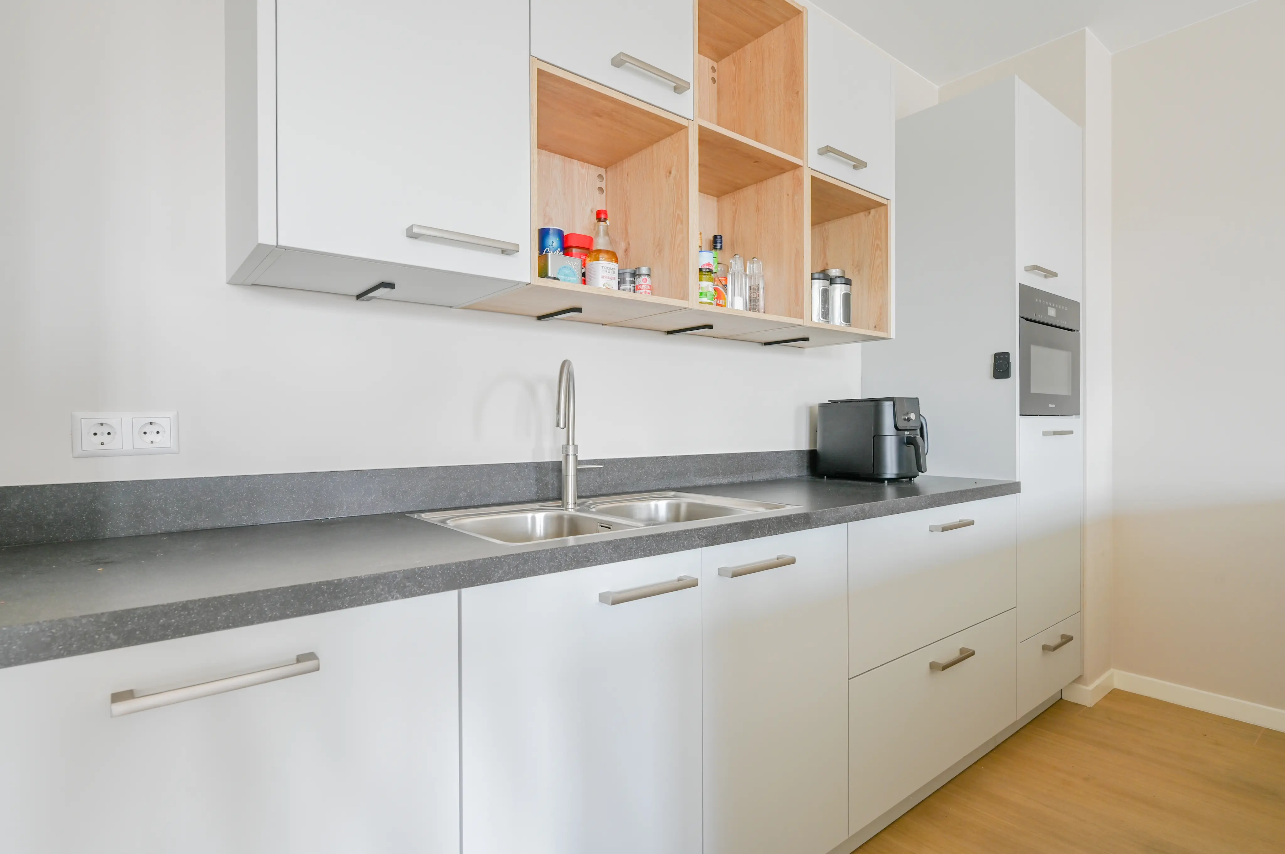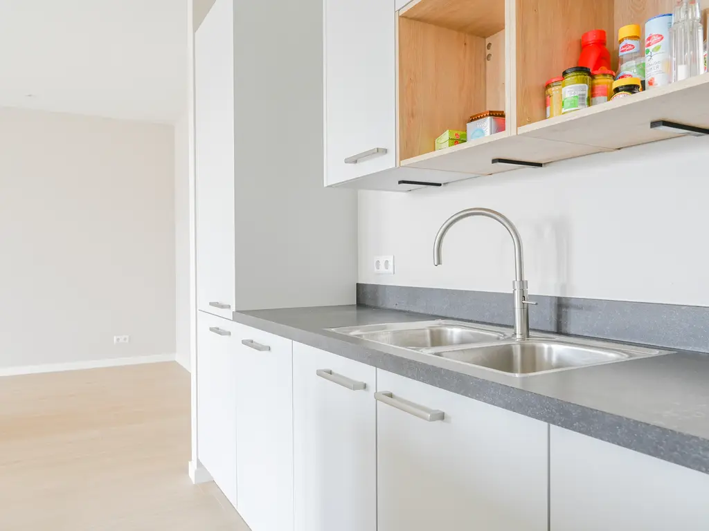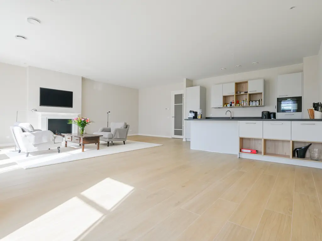 De lichte en ruime woonkamer (64 m²) bevindt zich op de tweede verdieping en heeft een open keuken met een modern kookeiland. Deze geeft toegang tot het ruime balkon (12,3m2) gelegen op het zuiden. De open keuken is compleet uitgerust met een inductiekookplaat, koelkast, vriezer en vaatwasser.