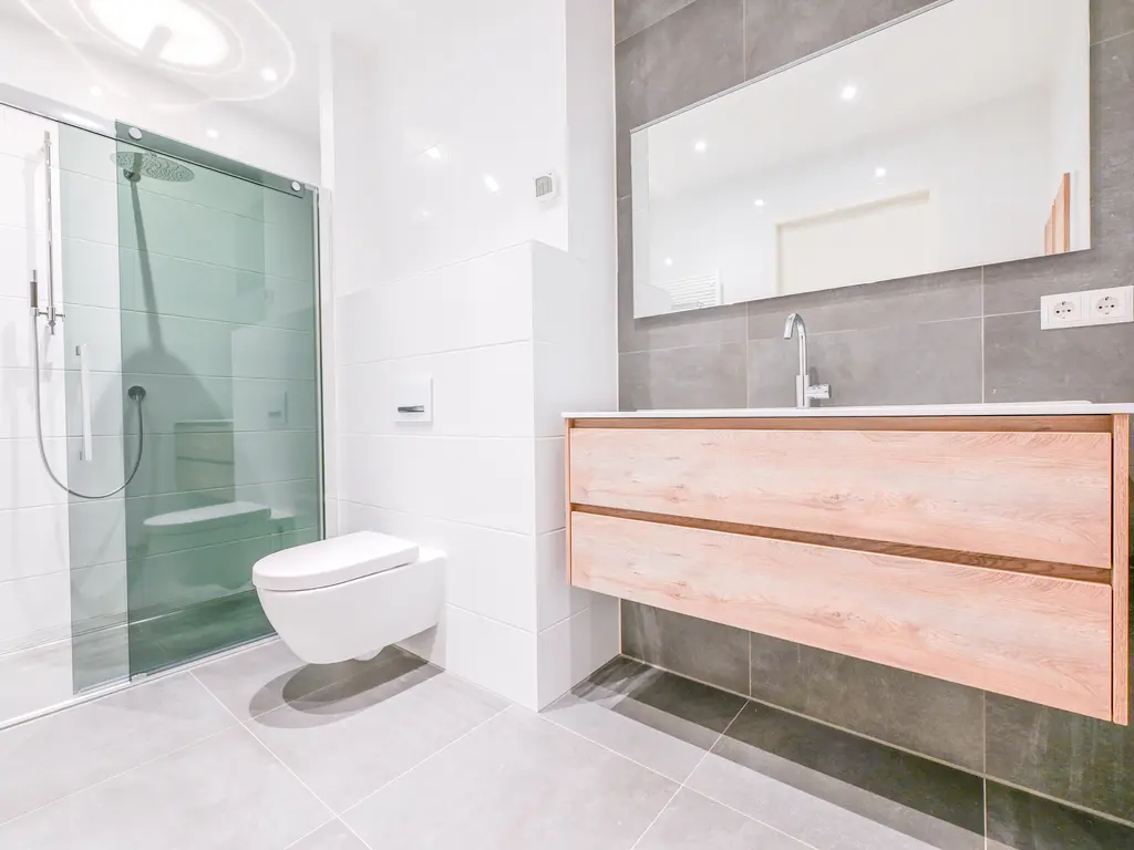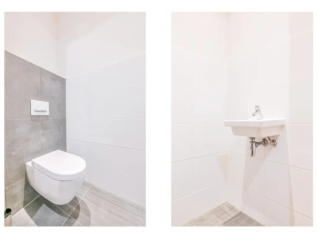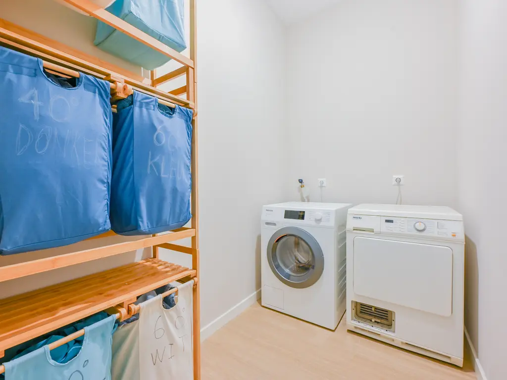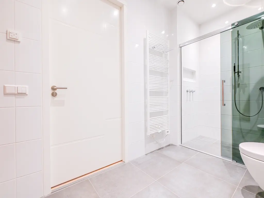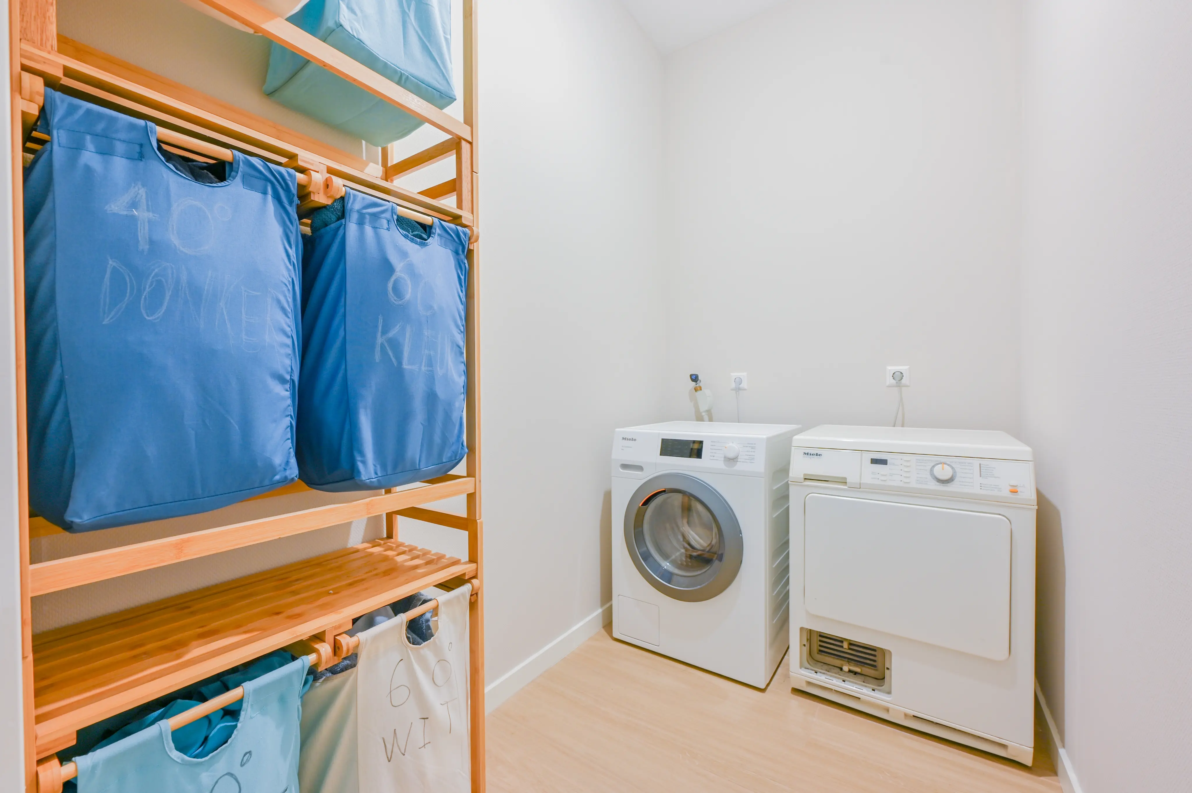 De luxe badkamer beschikt over een ruime inloopdouche, een tweede toilet, een wastafel en ingebouwde opbergkasten. Daarnaast is er een separaat toilet naast de voordeur. Verder beschikt het appartement over een aparte wasruimte en een technische ruimte.