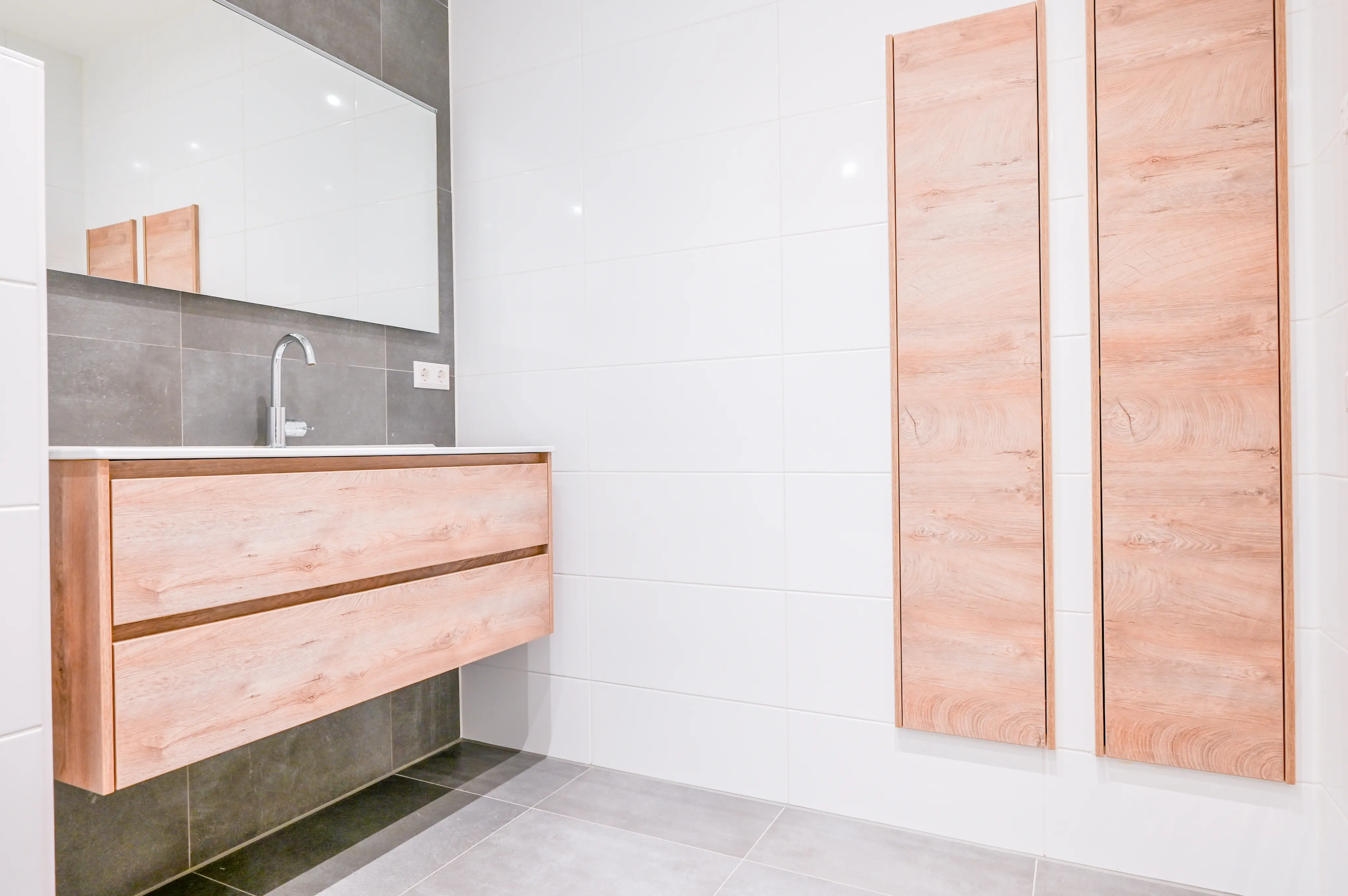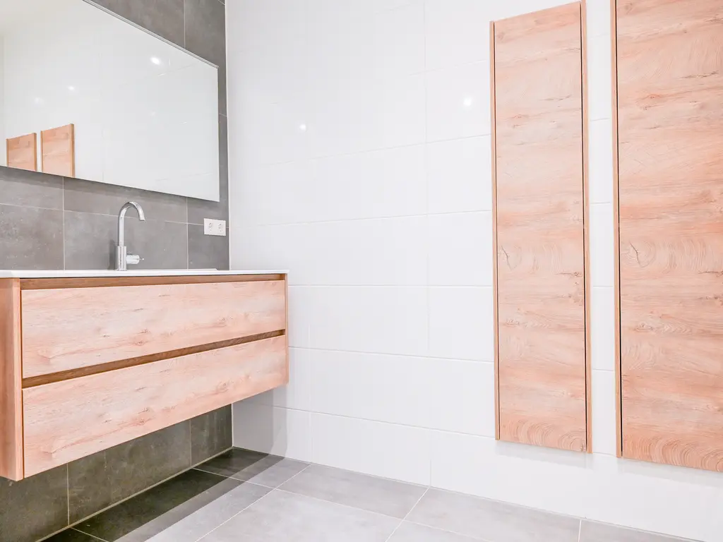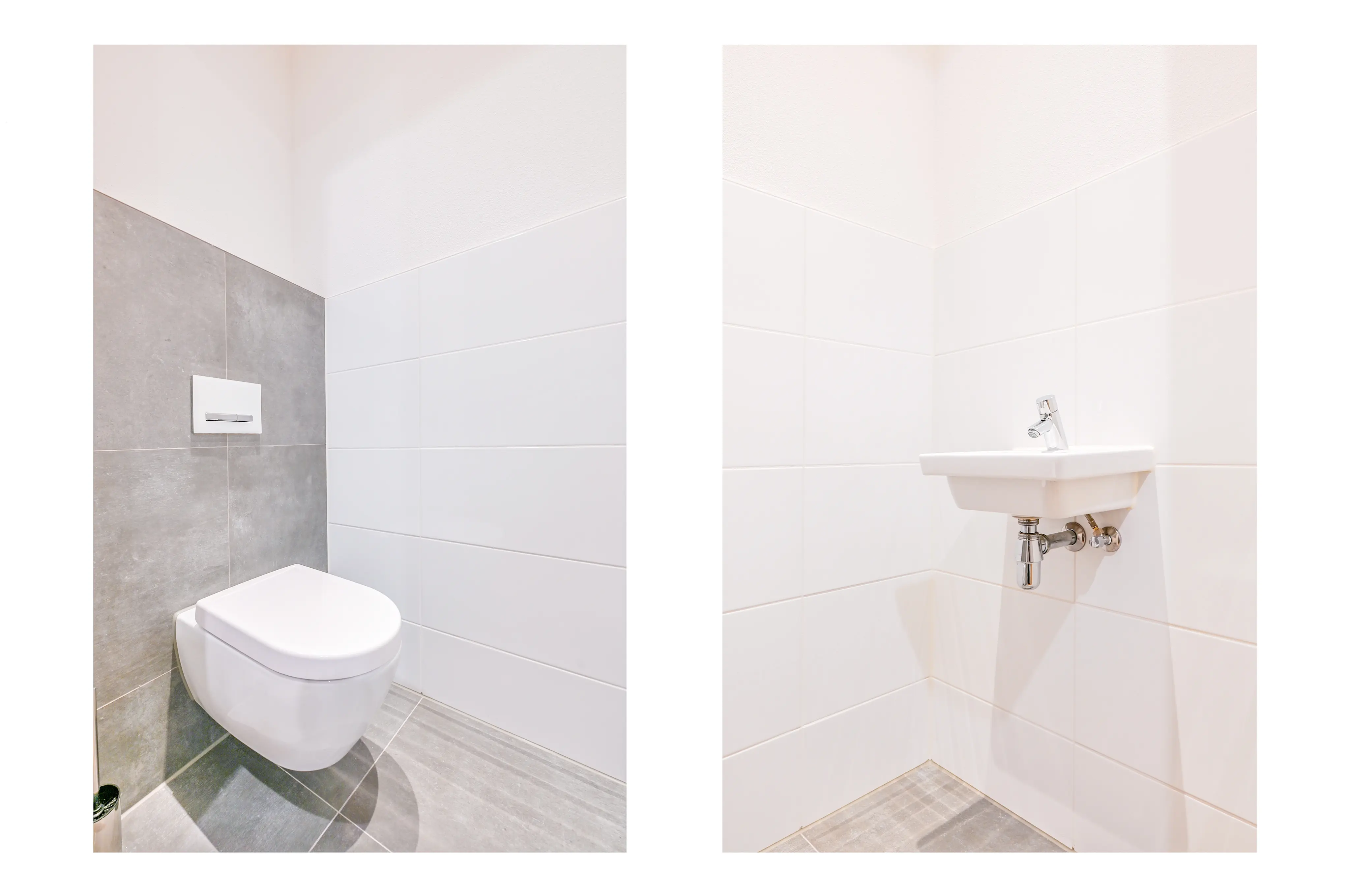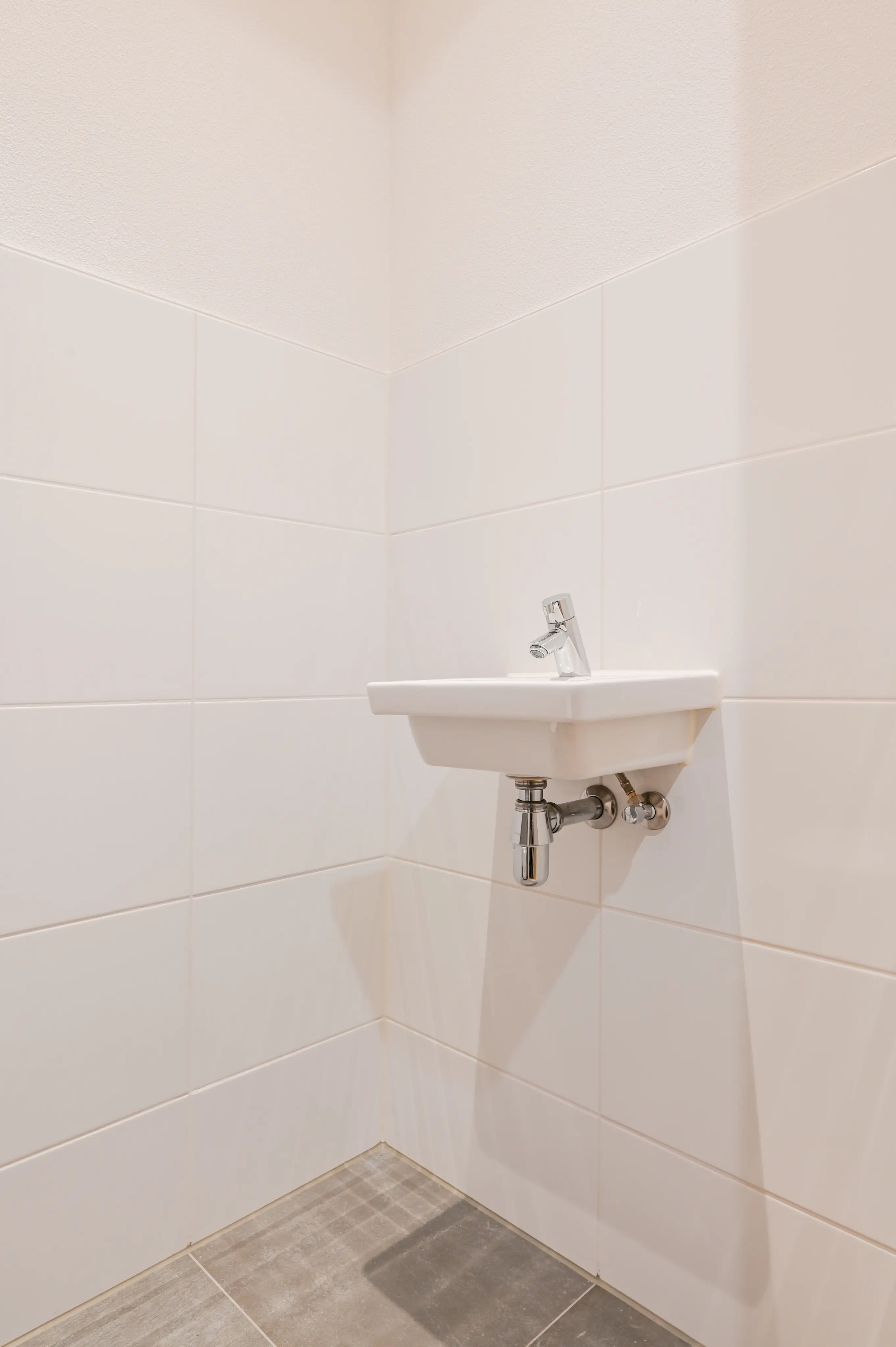 De luxe badkamer beschikt over een ruime inloopdouche, een tweede toilet, een wastafel en ingebouwde opbergkasten. Daarnaast is er een separaat toilet naast de voordeur. Verder beschikt het appartement over een aparte wasruimte en een technische ruimte.