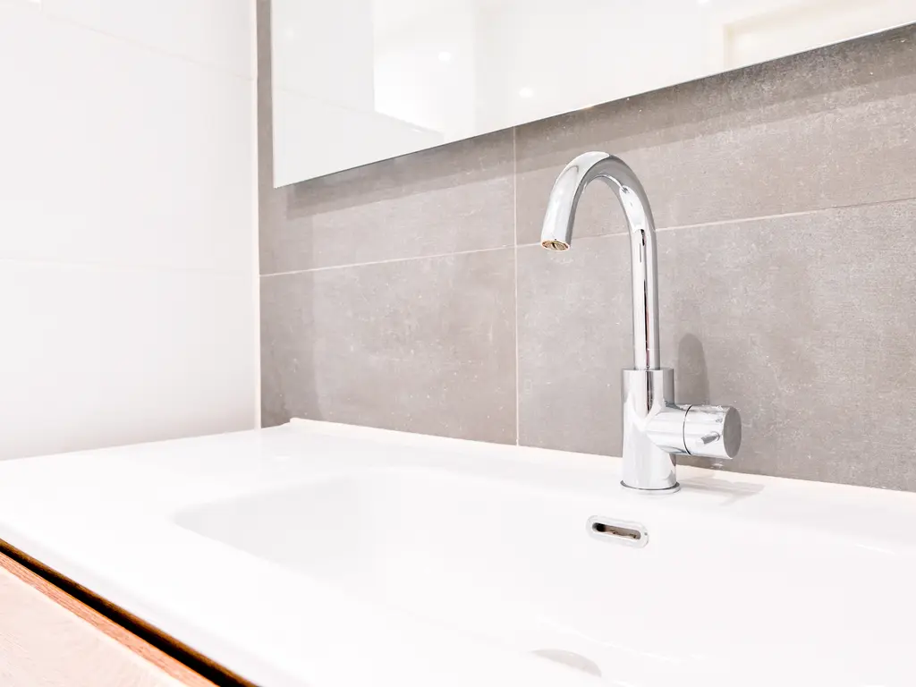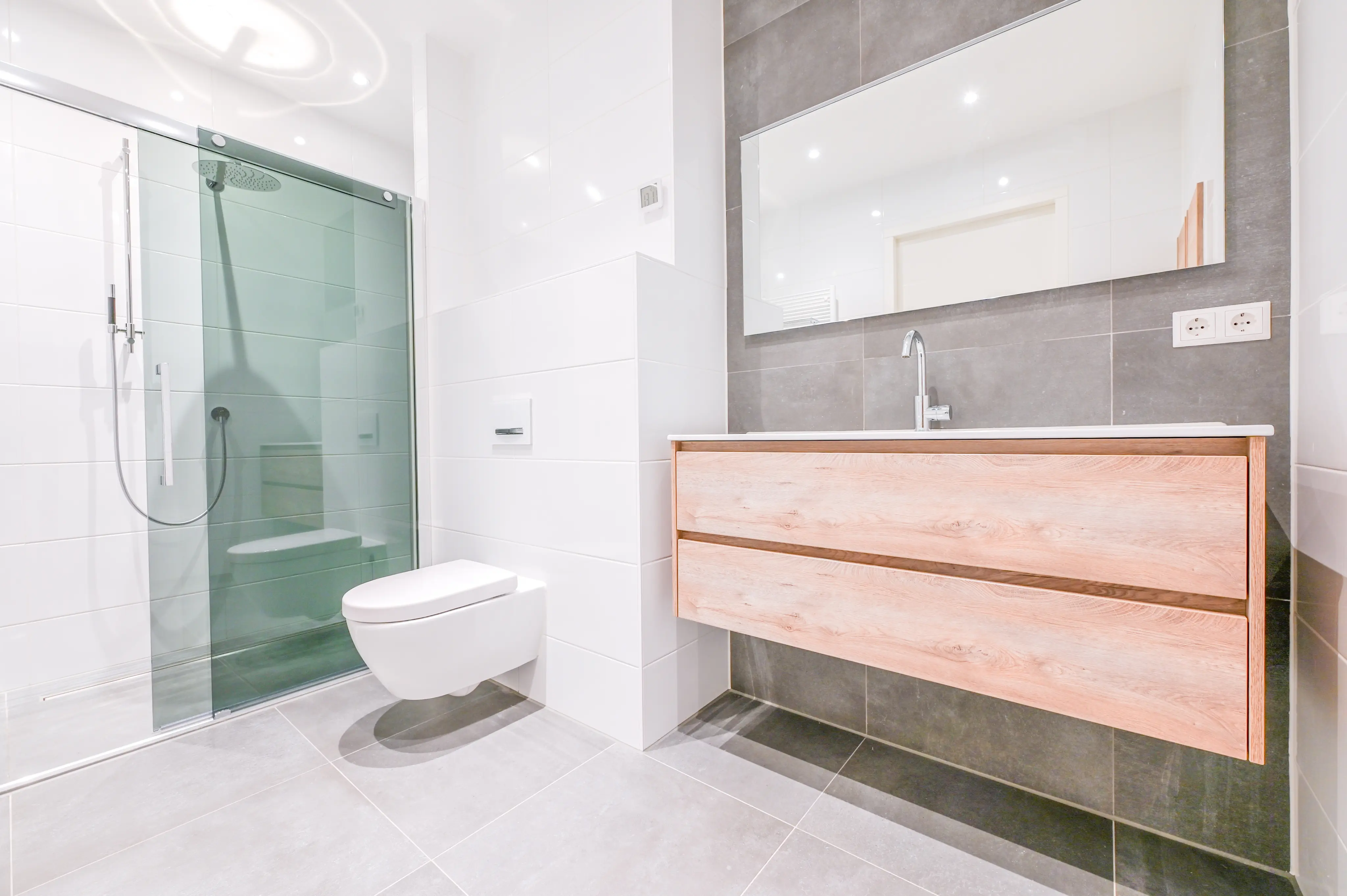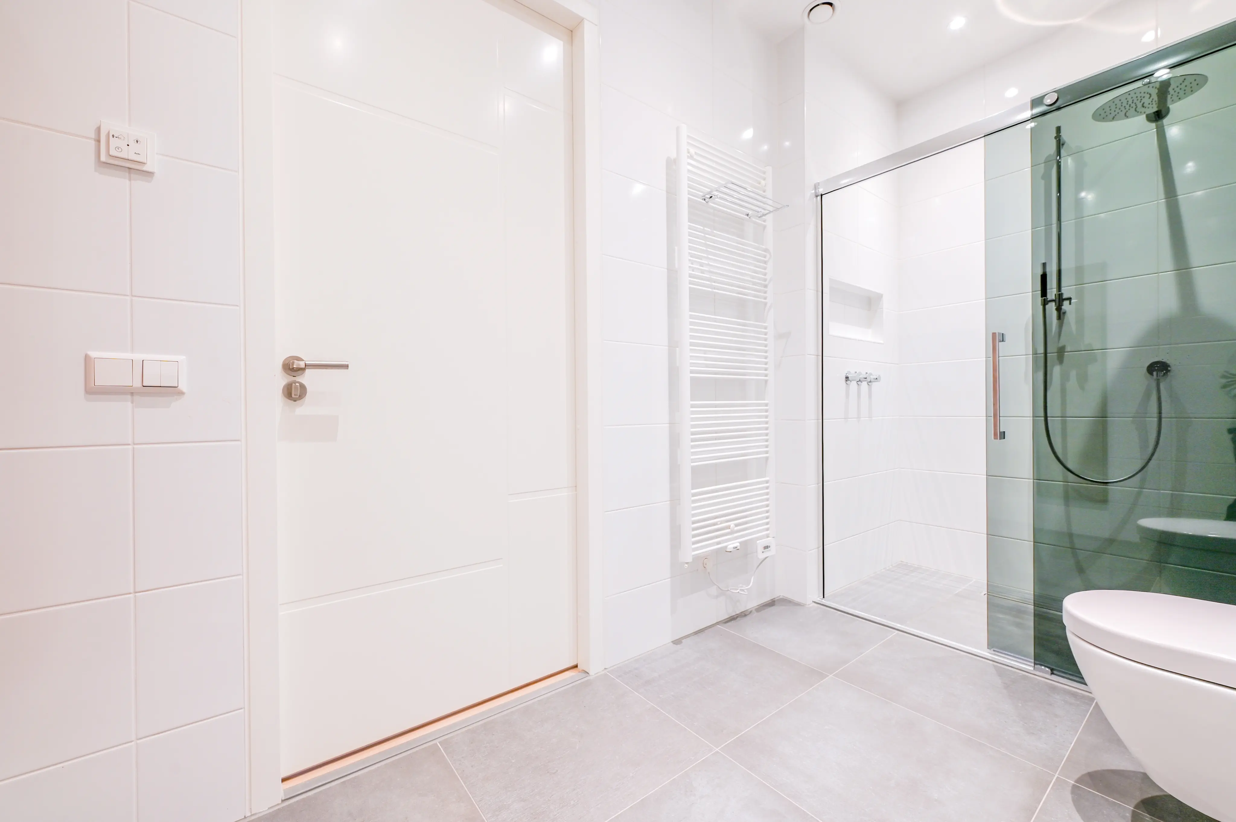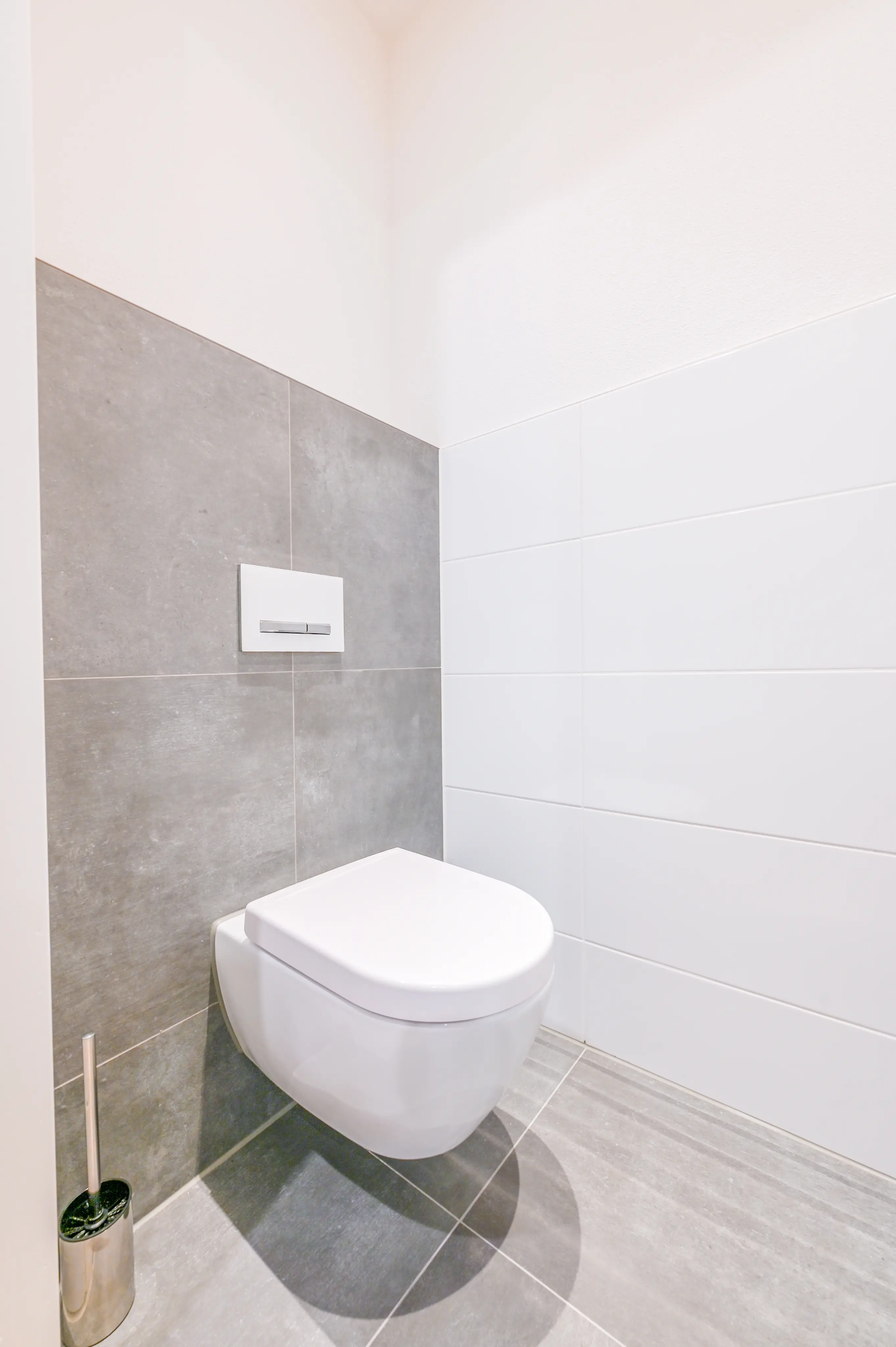 De luxe badkamer beschikt over een ruime inloopdouche, een tweede toilet, een wastafel en ingebouwde opbergkasten. Daarnaast is er een separaat toilet naast de voordeur. Verder beschikt het appartement over een aparte wasruimte en een technische ruimte.