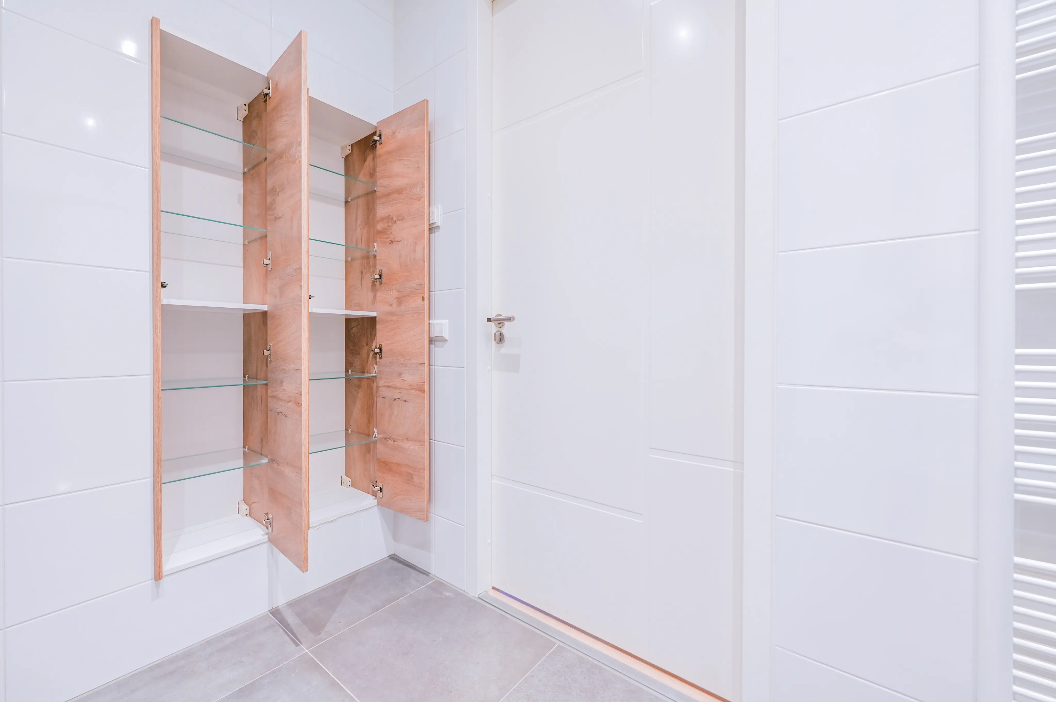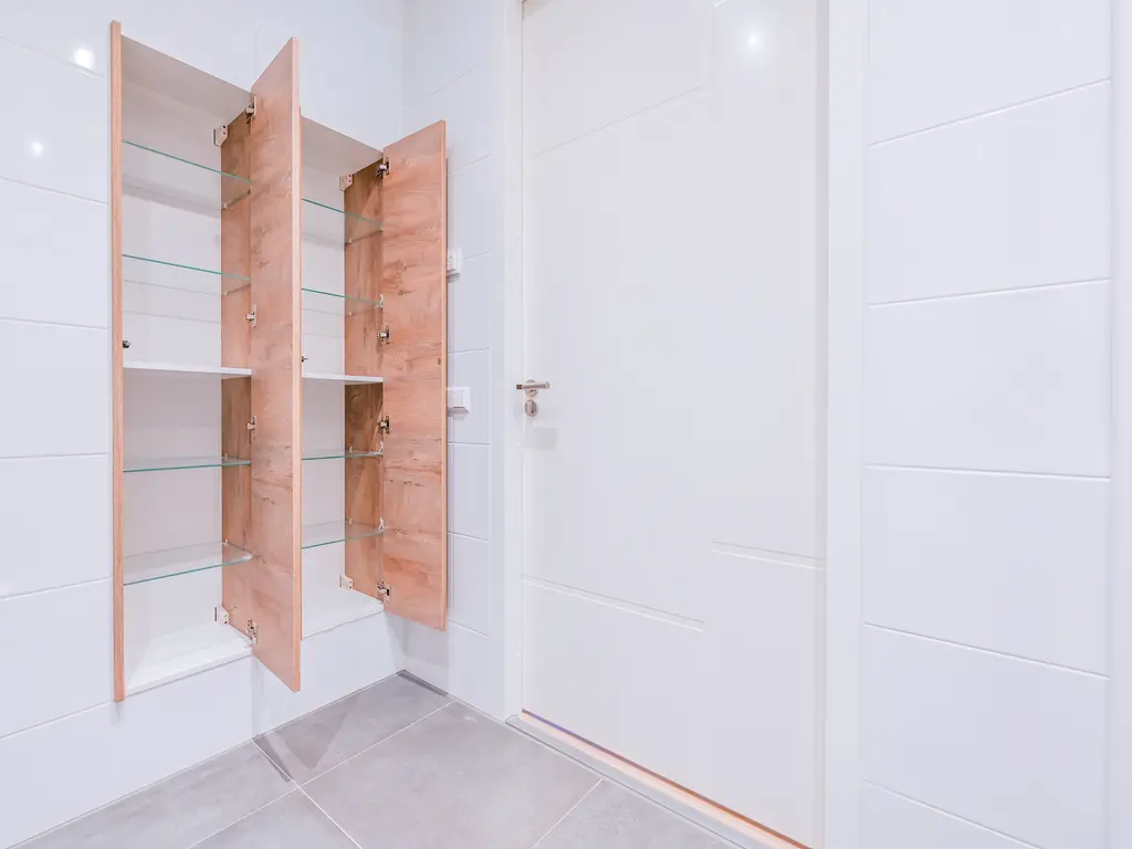 The luxurious bathroom features a spacious walk-in shower, a second toilet, a sink, and built-in storage cabinets. Additionally, there is a separate toilet next to the entrance. The apartment also includes a laundry room and a technical room.