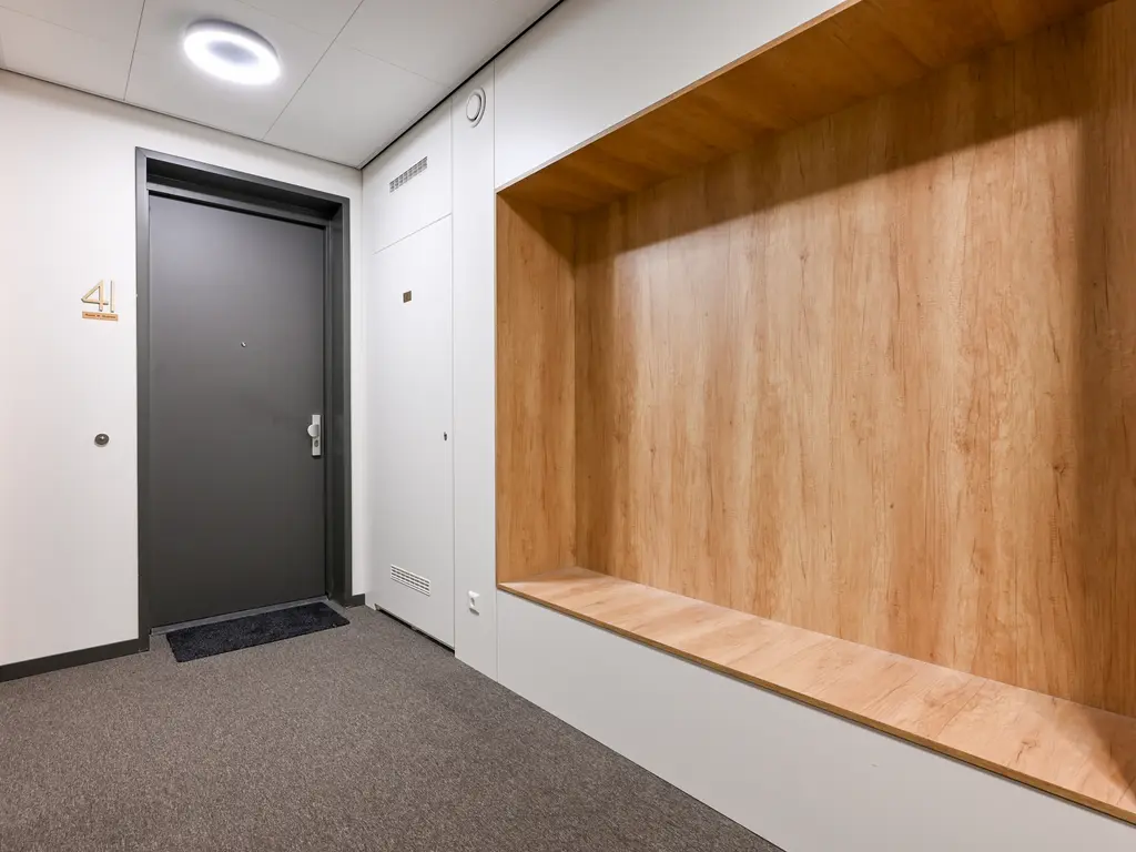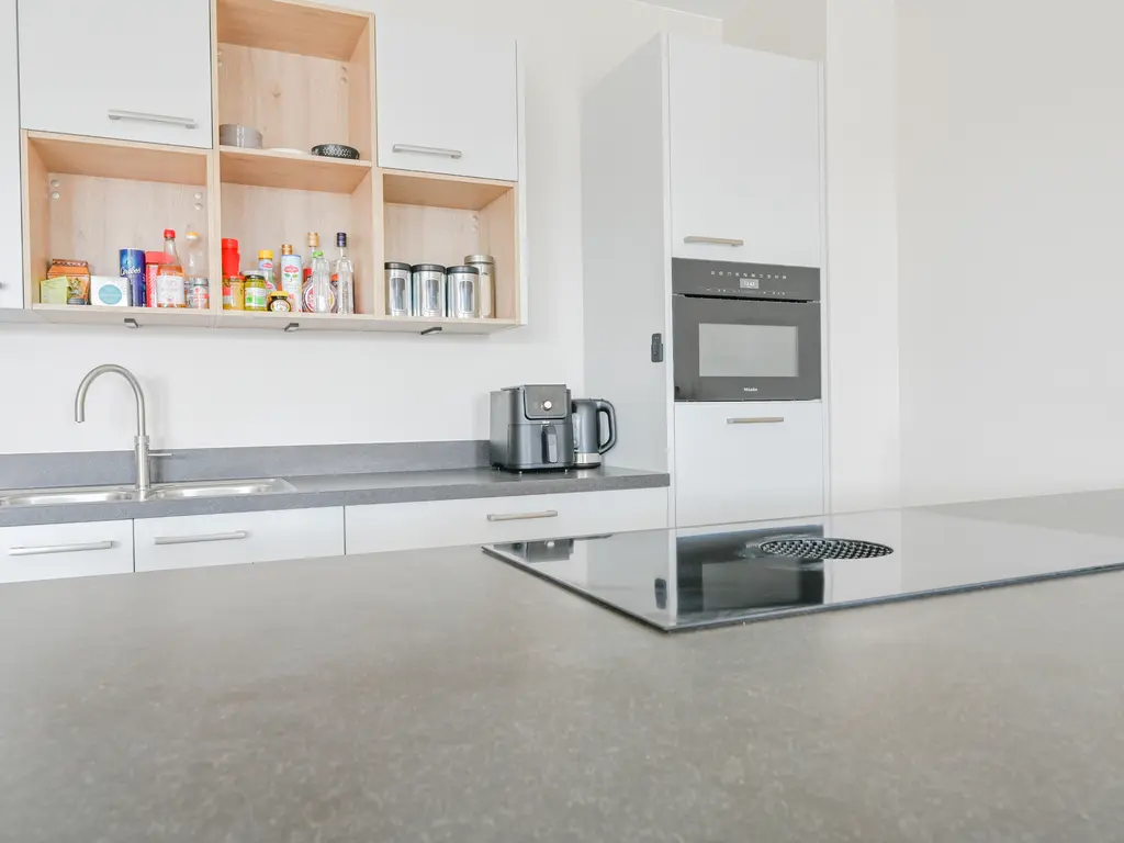 The bright and spacious living room (64 m²) is located on the second floor and features an open kitchen with a modern cooking island. It provides access to the large south-facing balcony (12.3 m²). The open kitchen is fully equipped with an induction cooktop, refrigerator, freezer, and dishwasher.