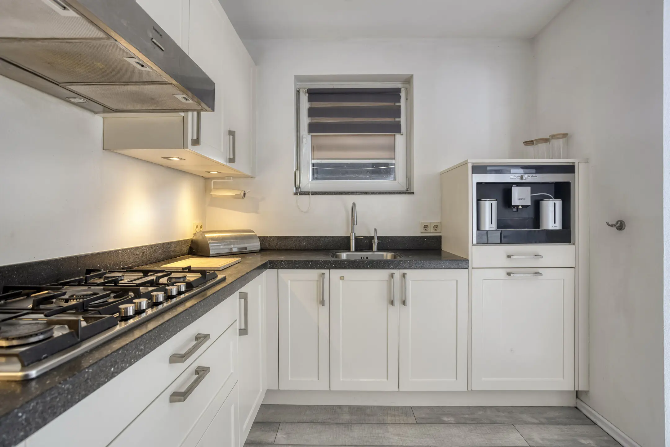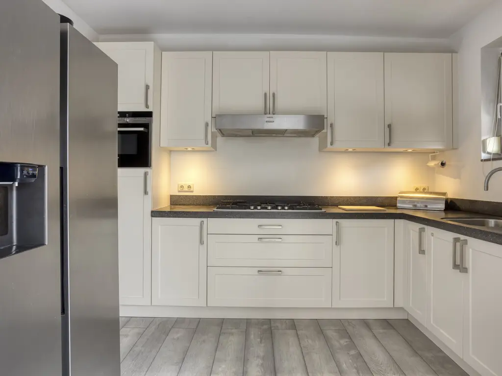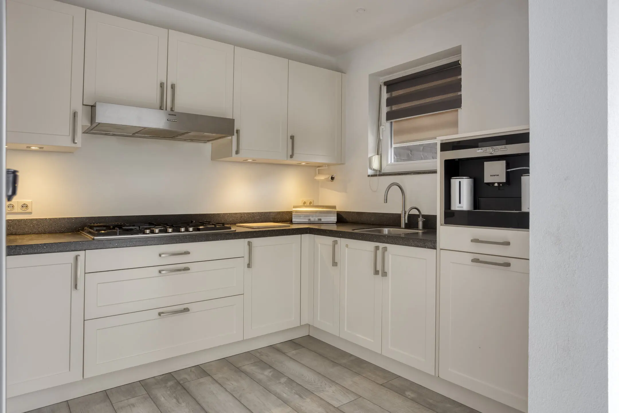 De keuken is modern en licht, uitgevoerd in een hoekopstelling met een mooi donker blad en voorzien van inbouwapparatuur. Er is bovendien ruimte voor een grote koel-vriescombinatie, waardoor je alles bij de hand hebt. Door de open verbinding met de woonkamer oogt de keuken extra ruim. Een raam boven de spoelbak biedt uitzicht naar buiten en laat het daglicht binnenstromen.