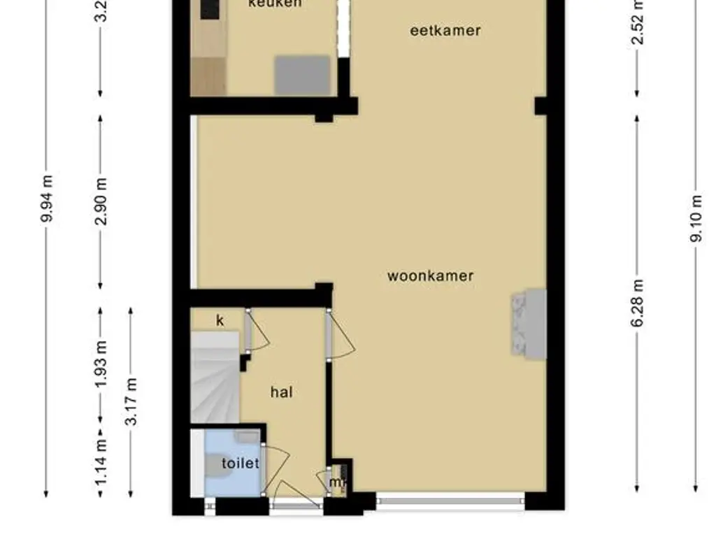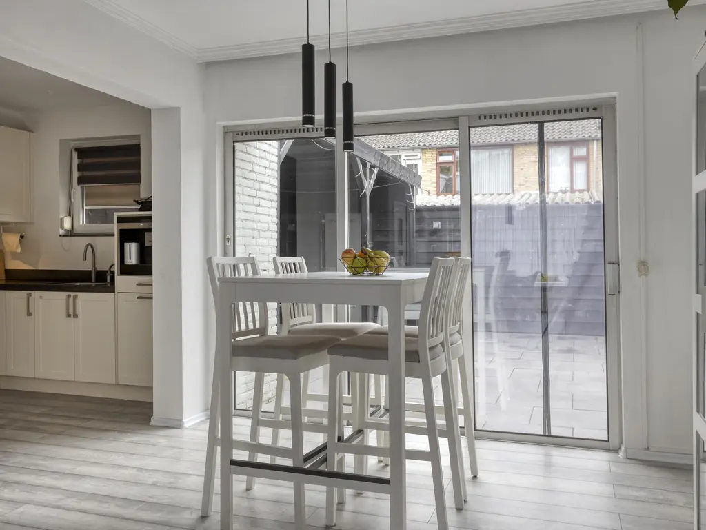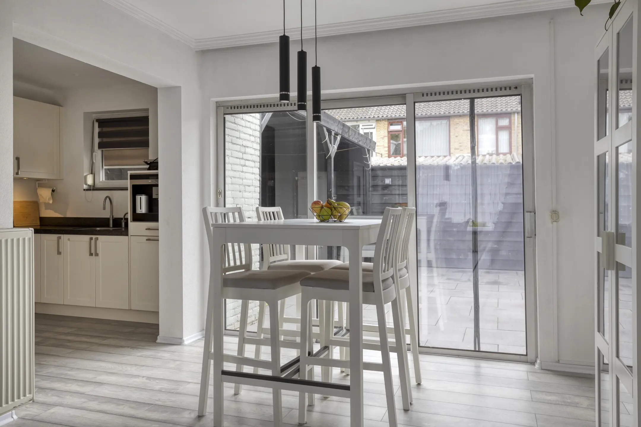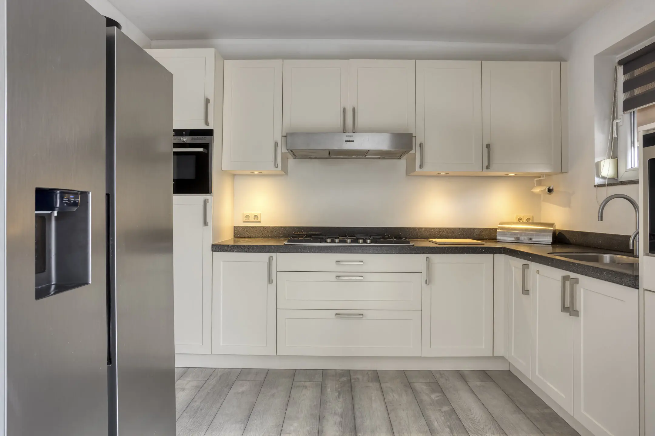 De keuken is modern en licht, uitgevoerd in een hoekopstelling met een mooi donker blad en voorzien van inbouwapparatuur. Er is bovendien ruimte voor een grote koel-vriescombinatie, waardoor je alles bij de hand hebt. Door de open verbinding met de woonkamer oogt de keuken extra ruim. Een raam boven de spoelbak biedt uitzicht naar buiten en laat het daglicht binnenstromen.