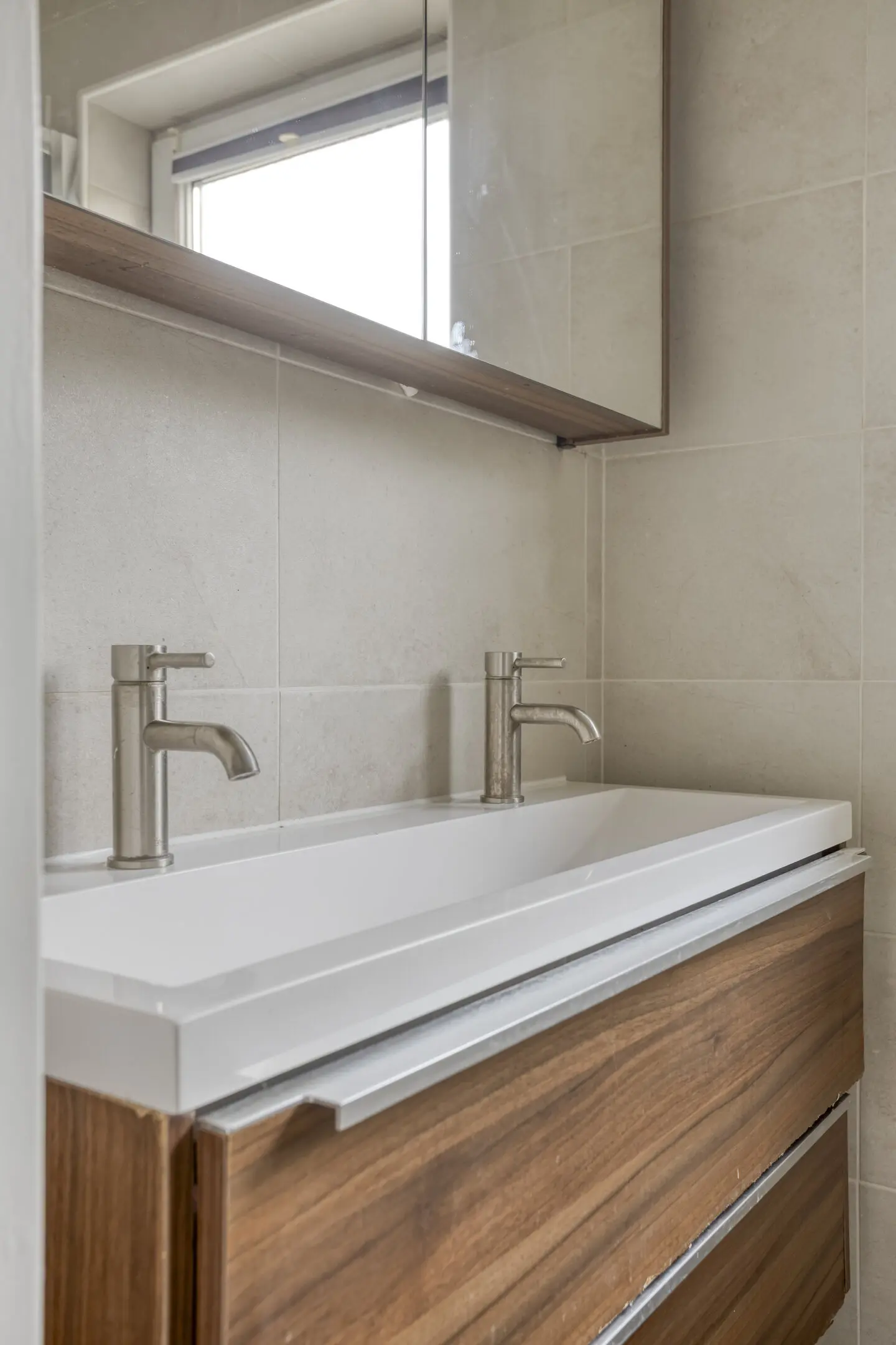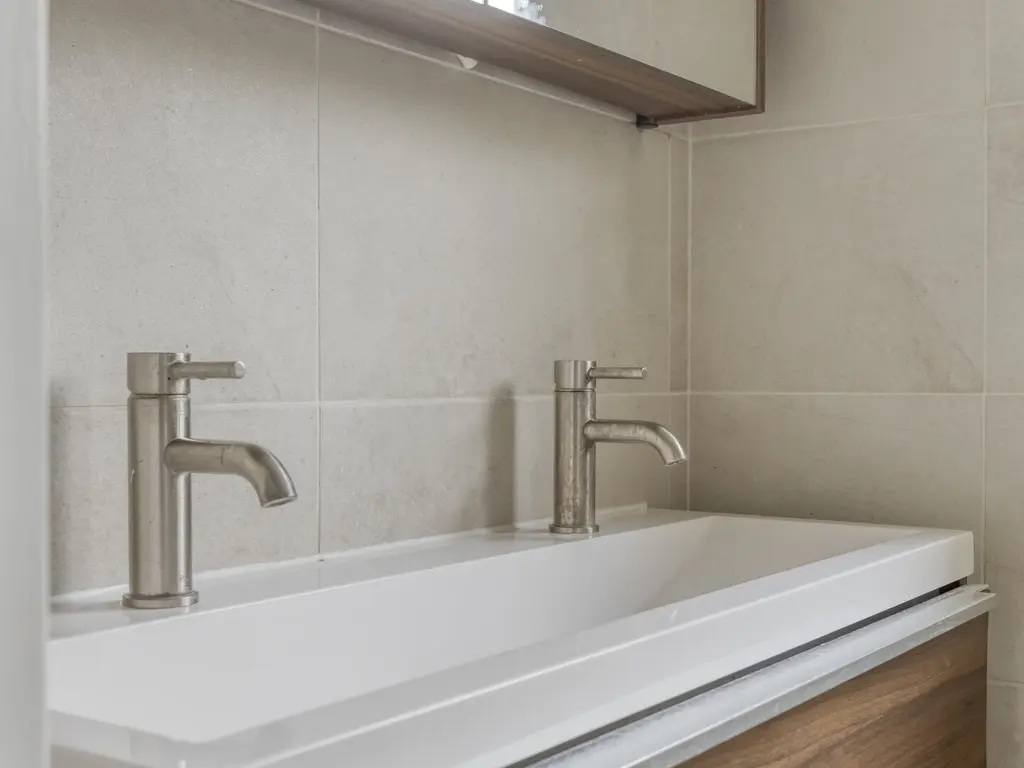 - Badkamer met inloopdouche, hangtoilet en grote dubbele wastafel met meubel