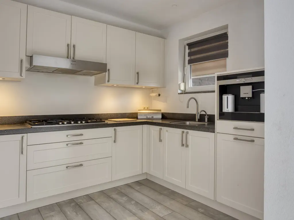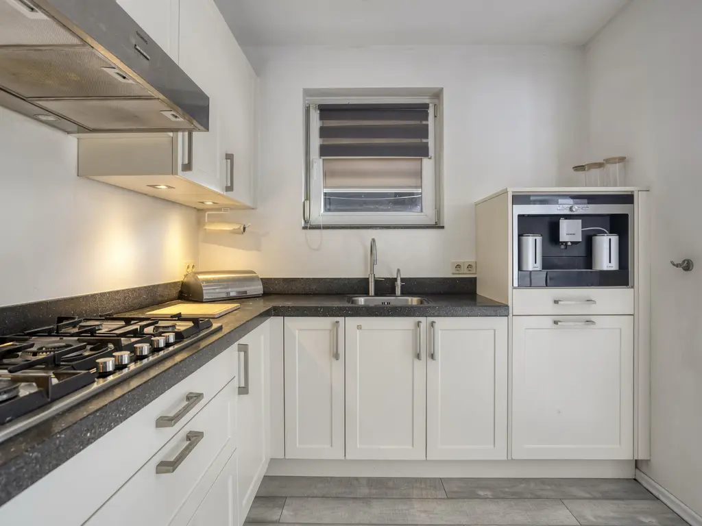 De keuken is modern en licht, uitgevoerd in een hoekopstelling met een mooi donker blad en voorzien van inbouwapparatuur. Er is bovendien ruimte voor een grote koel-vriescombinatie, waardoor je alles bij de hand hebt. Door de open verbinding met de woonkamer oogt de keuken extra ruim. Een raam boven de spoelbak biedt uitzicht naar buiten en laat het daglicht binnenstromen.