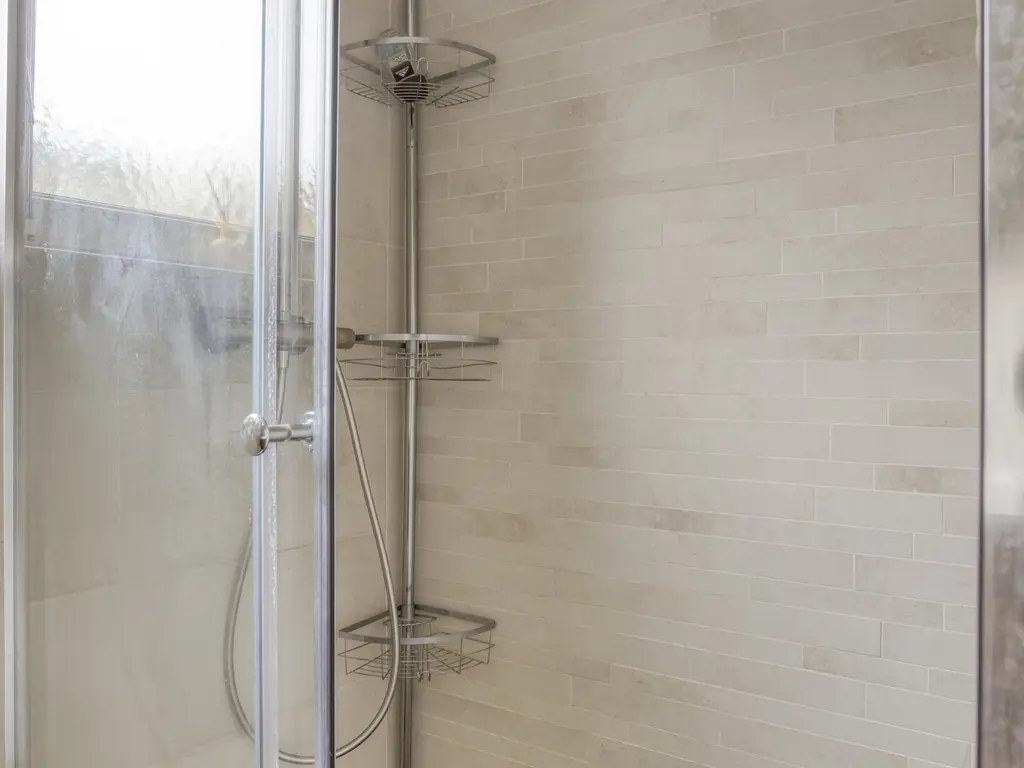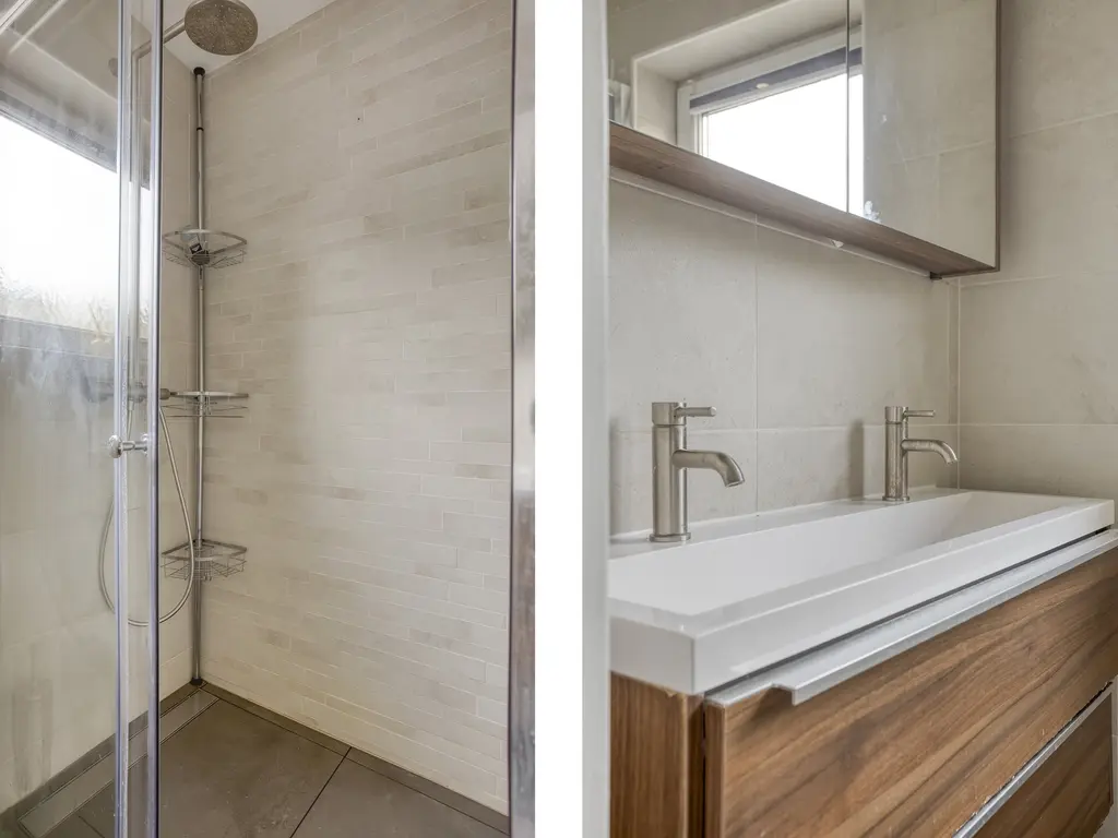 - Badkamer met inloopdouche, hangtoilet en grote dubbele wastafel met meubel