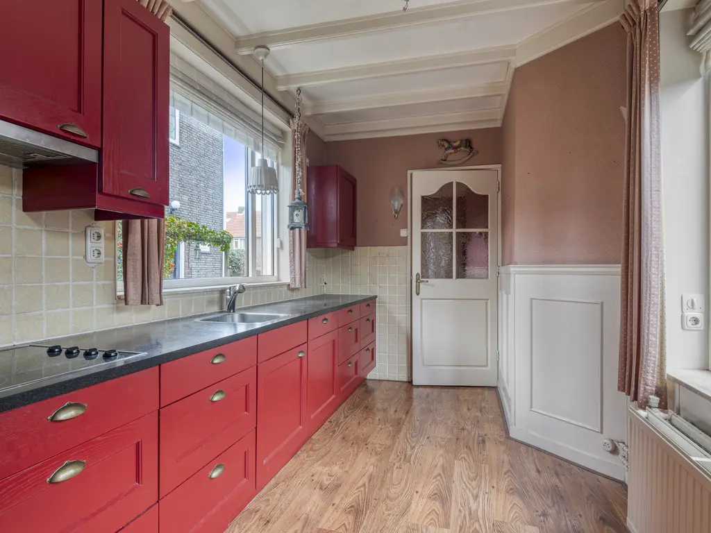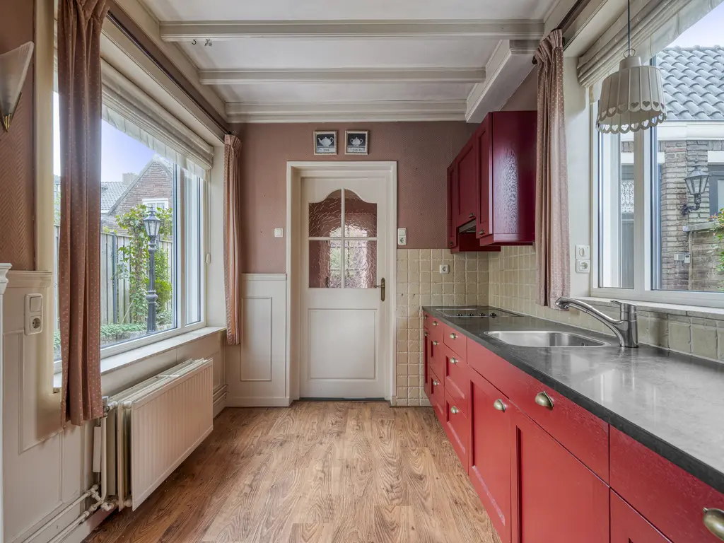 De keuken is aan de achterzijde gelegen en beschikt over diverse inbouwapparatuur. De keuken is onder andere voorzien van oven, vaatwasser en koelkast.