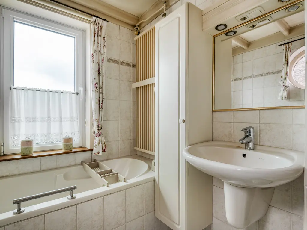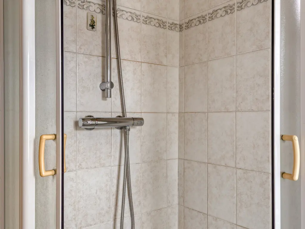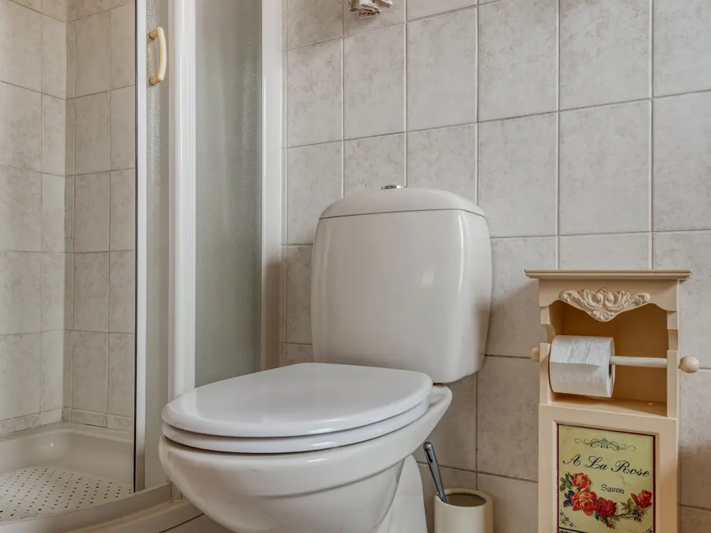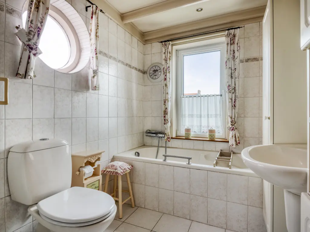 De badkamer is compleet uitgerust met ligbad, wastafel, toilet en douche.