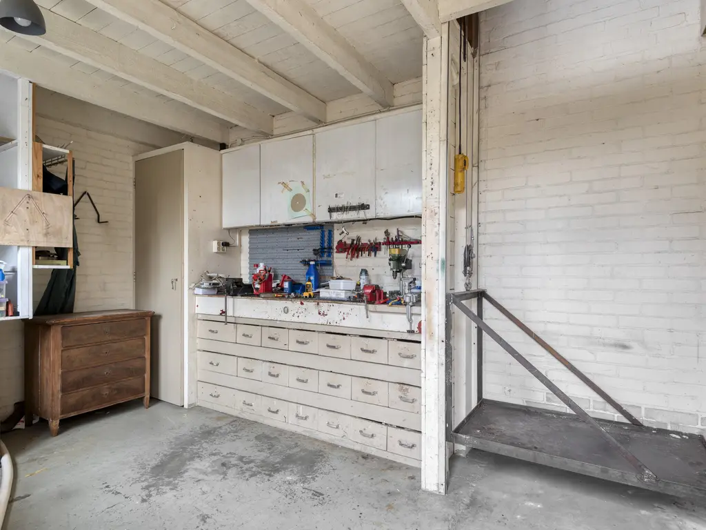Vanuit de keuken bereikt u de aangebouwde garage, met daarachter een werk- of hobbyruimte. Via een lift is de vliering van de garage bereikbaar voor extra opslag.