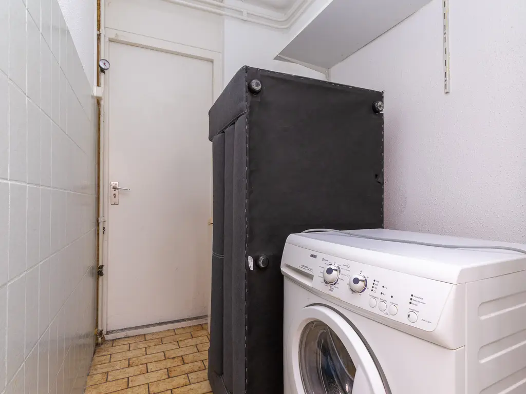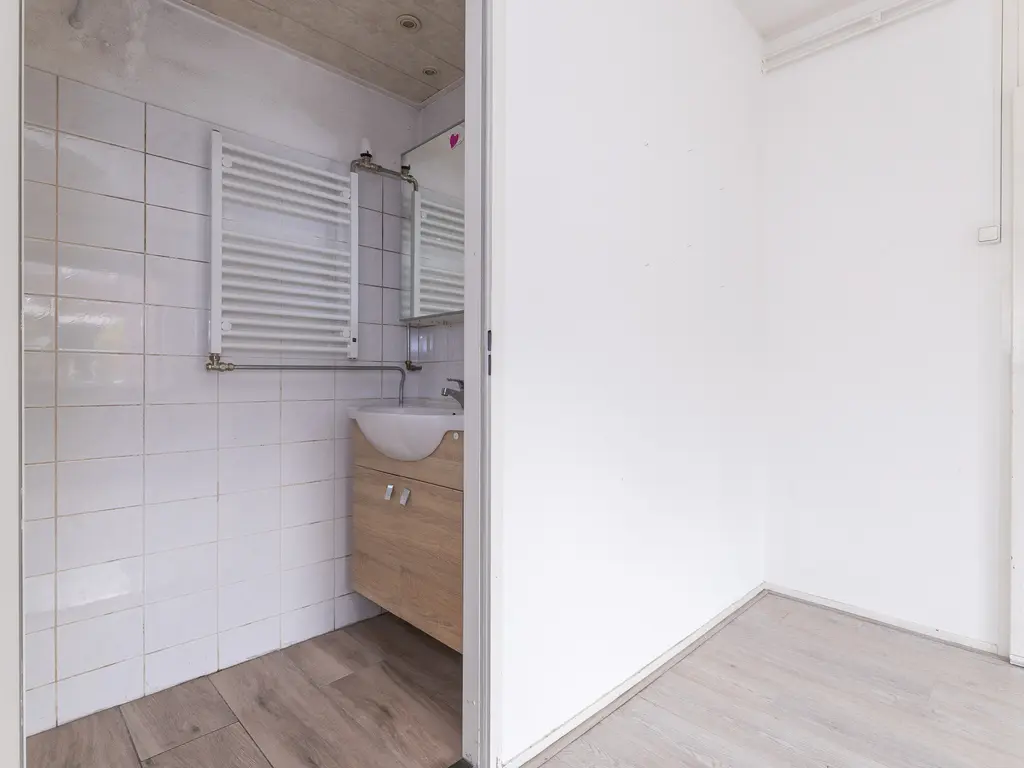 Entree, slaapkamer aan de linkerzijde met aansluitend de badkamer voorzien van een douche en wastafelmeubel. Het toilet is in de hal geplaatst. Via de lange hal bereik je de woonkamer met half open keuken. Aan de zijkant van de woonkamer is een ruimte gecreëerd voor de wasmachine. De tuin is via de woonkamer bereikbaar.