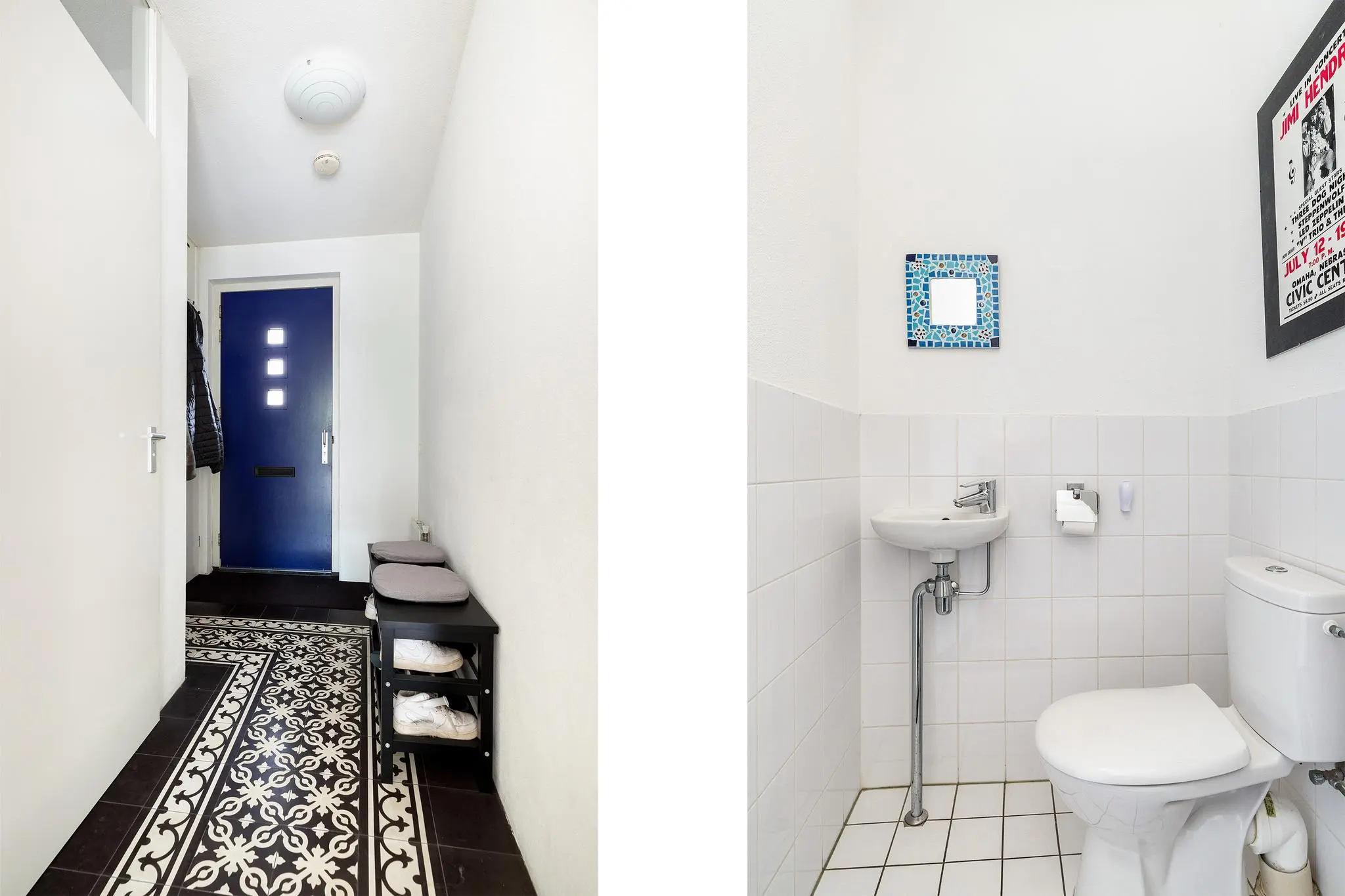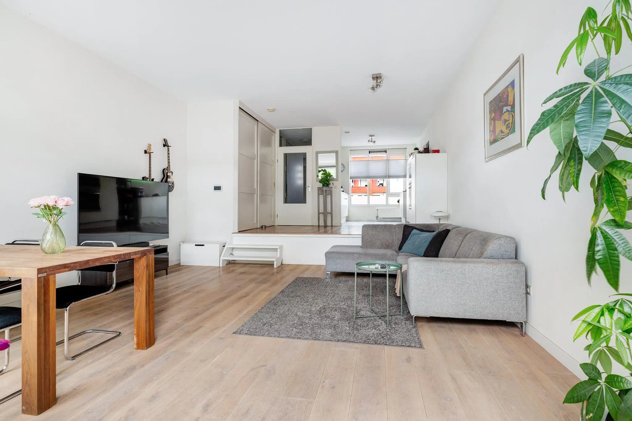 Via de entree komt u in de hal met garderobe, meterkast en een keurig betegeld toilet voorzien van een dublok toilet en een fonteintje. De leefruimte is verrassend door het speelse niveauverschil: de open keuken ligt iets hoger dan de zitkamer, wat een ruimtelijk en dynamisch gevoel geeft.