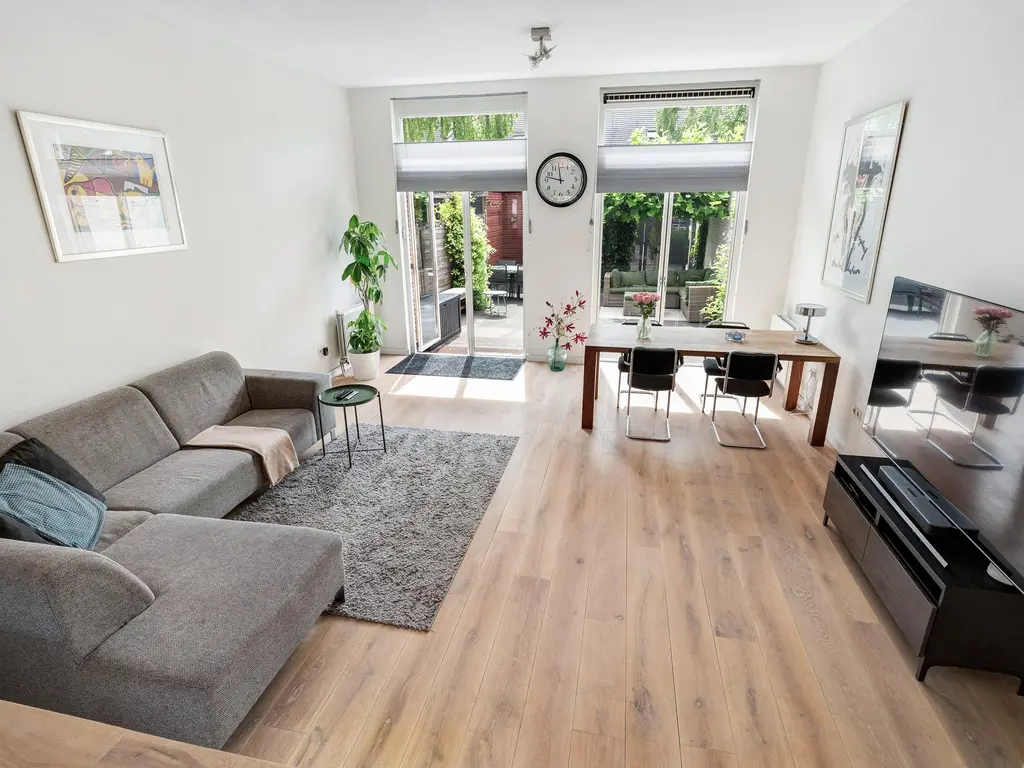 Via twee treden bereikt u de sfeervolle woonkamer (ca. 29 m²) aan de achterzijde. De hoge plafonds en de dubbele openslaande deuren naar de tuin zorgen voor een indrukwekkende ruimtelijkheid. De lichte whitewash eikenhouten vloer geeft het geheel een warme, moderne uitstraling.