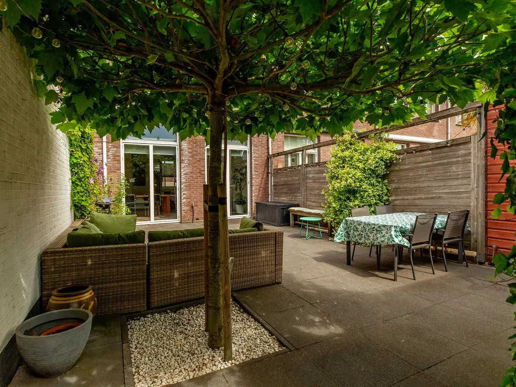 De achtertuin ligt op het zonnige zuidoosten en is ingericht met sierbestrating, een elektrisch bedienbaar zonnescherm en een vrijstaande houten berging. De brede openslaande poort biedt toegang tot de achtergelegen parkeerplaats en geeft u de mogelijkheid om de auto in de tuin te parkeren.