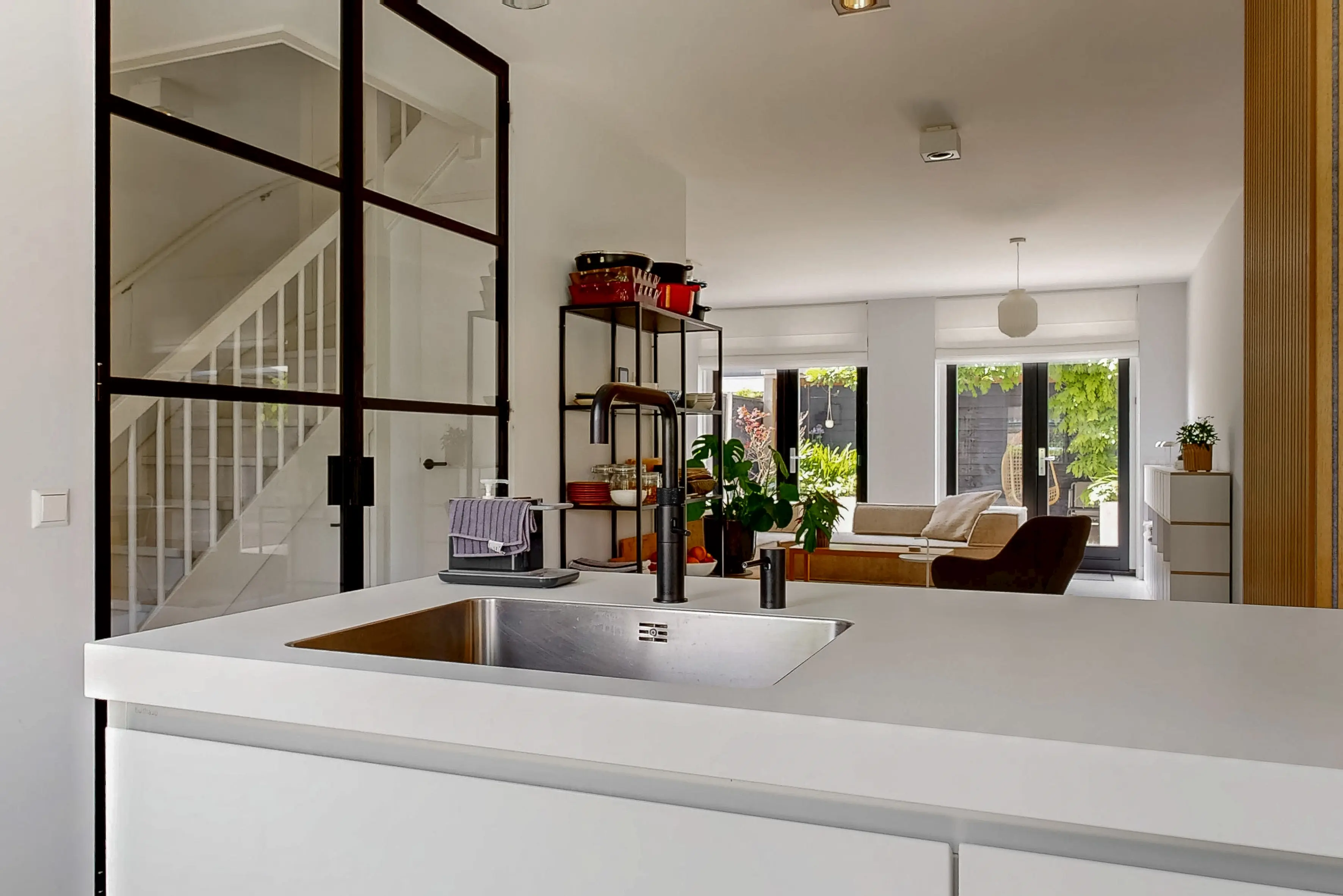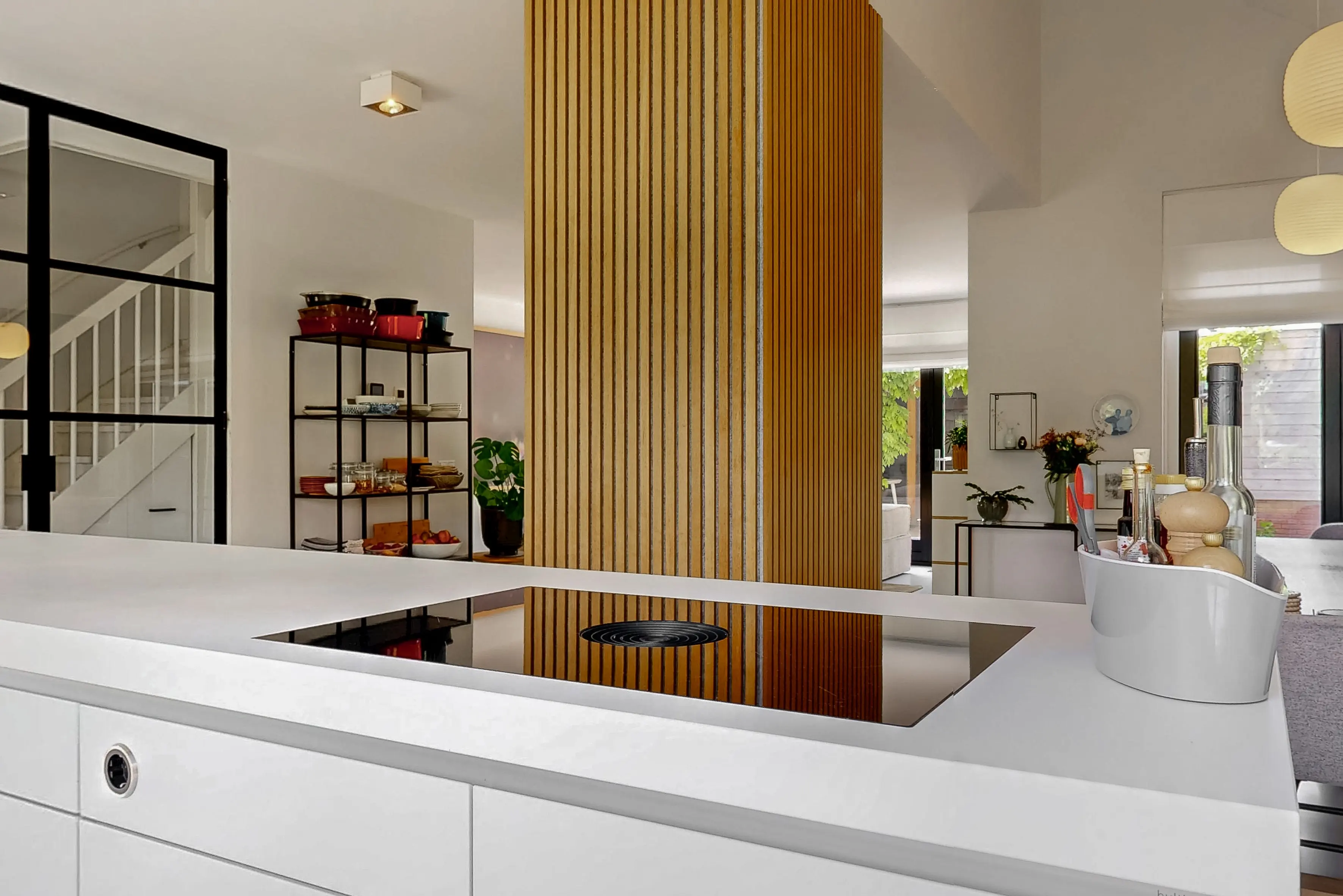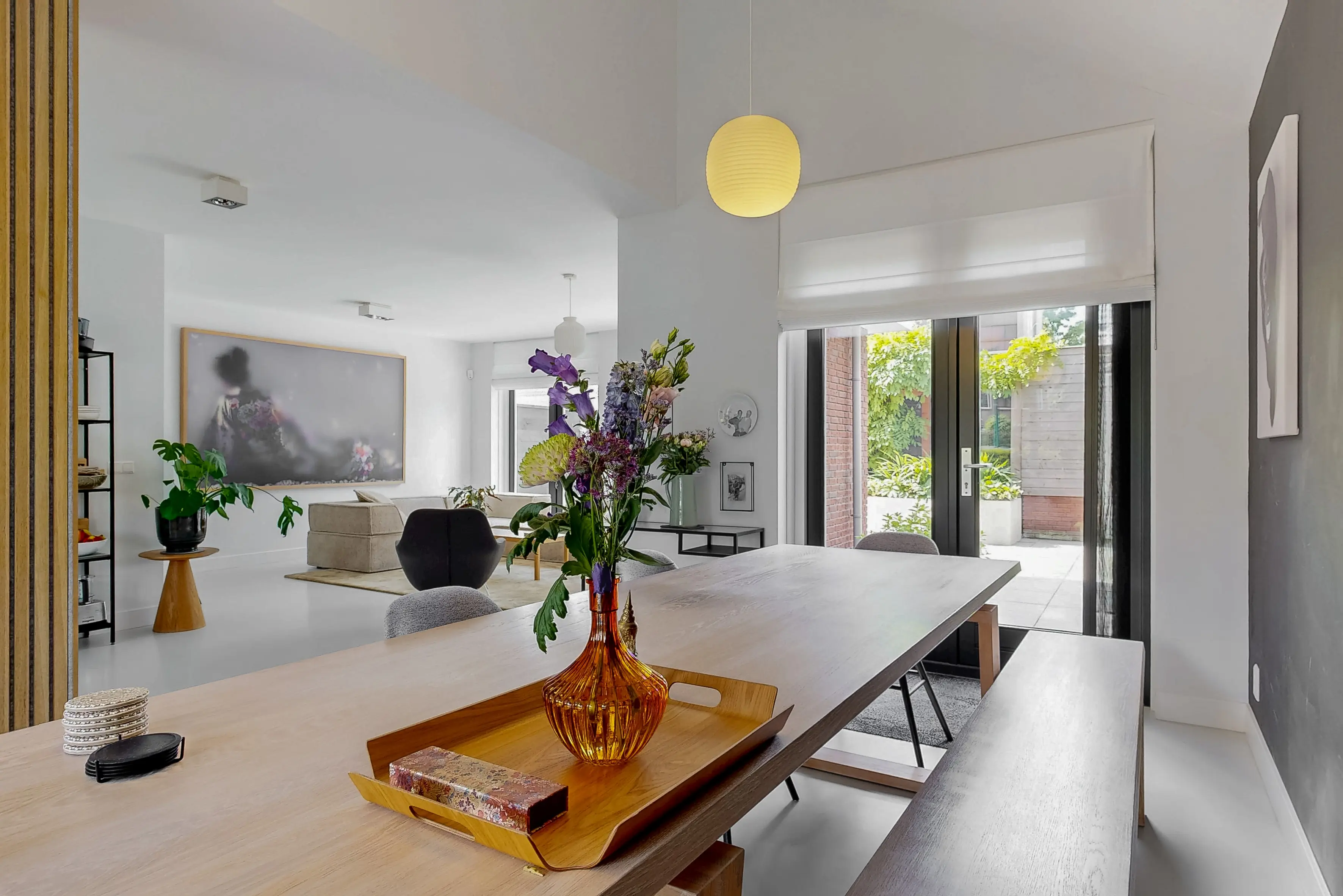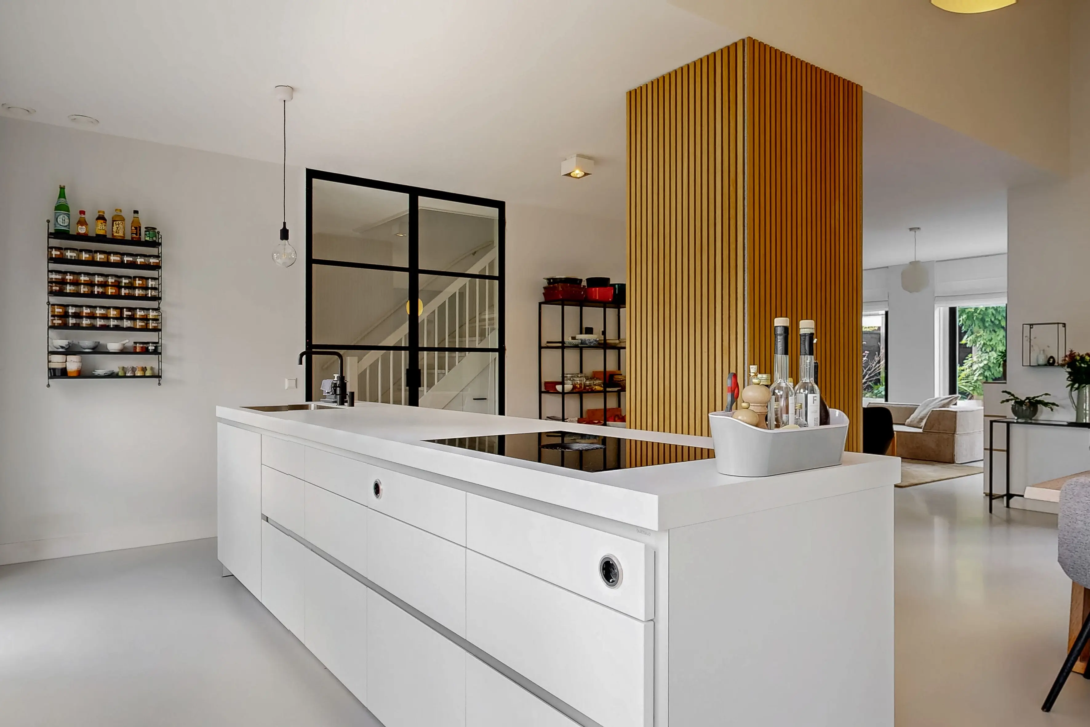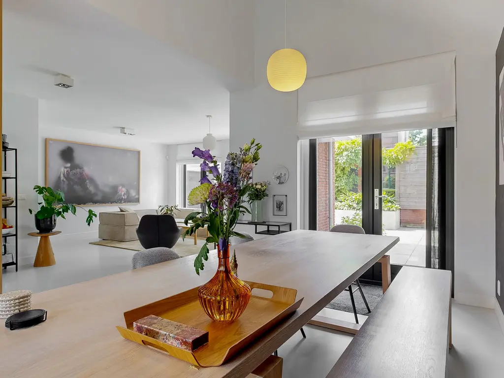 Voortuin en oprit met plaats voor twee auto’s op eigen terrein. Entree, hal met toilet, meterkast, trap naar de verdieping, een kast en toegang tot de keuken en woonkamer. De mooie Bulthaup keuken aan de voorzijde van de woning is van alle moderne gemakken en (inbouw)apparatuur voorzien. Zo heeft het bijvoorbeeld een inductie kookplaat met ingebouwde afzuigkap, een Quooker, vaatwasser, koel-/ vriescombinatie, een oven en een combi-stoomoven. Dankzij de uitbouw aan de zijkant is er extra veel leefruimte gecreëerd in de lichte woonkamer. De royale woonkamer heeft een moderne gietvloer met vloerverwarming, glad gestuukte muren en plafond en via de openslaande deuren heeft u toegang tot de zonnige en verzorgde achtertuin, waar je heerlijk kunt genieten van het buitenleven. In de tuin staat een heerlijke veranda met berging. ideaal voor fietsen en opslag.