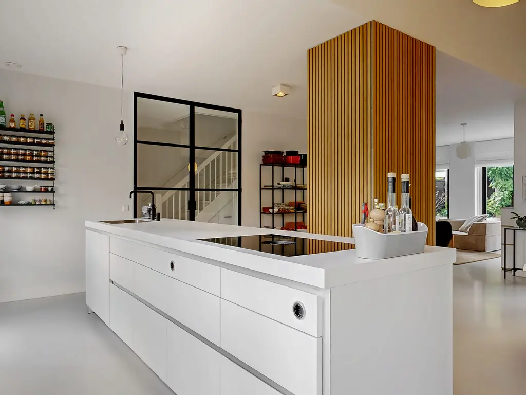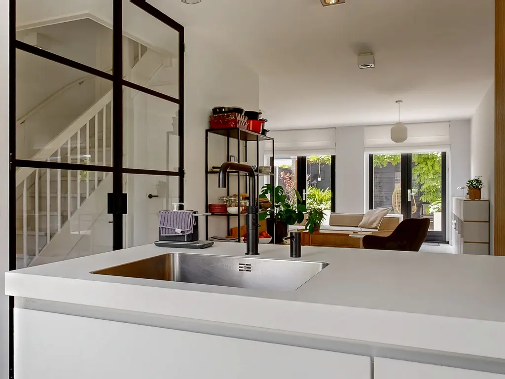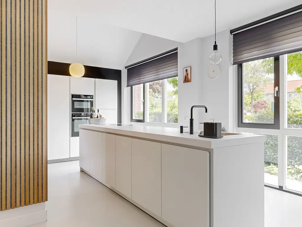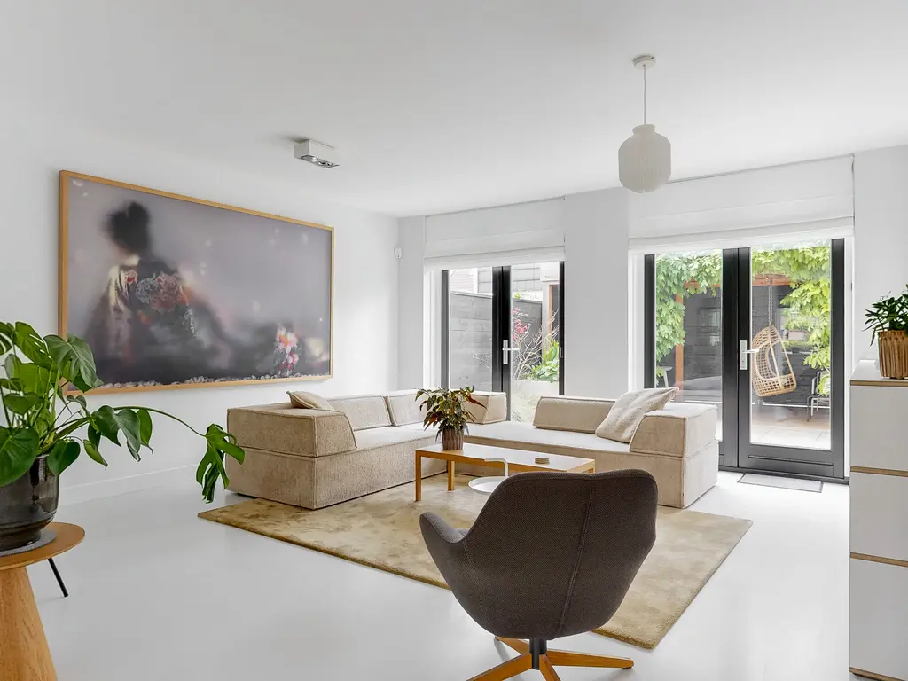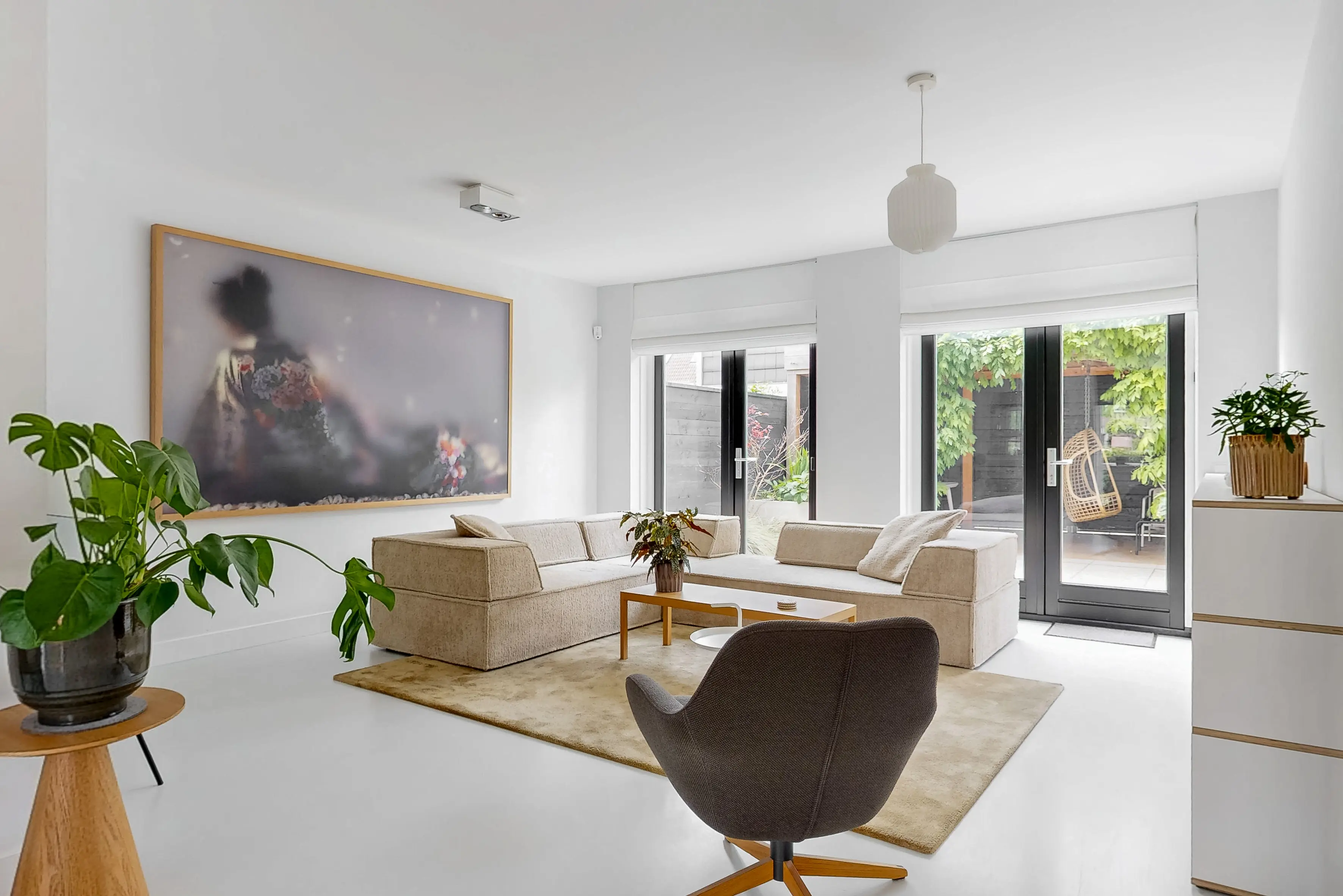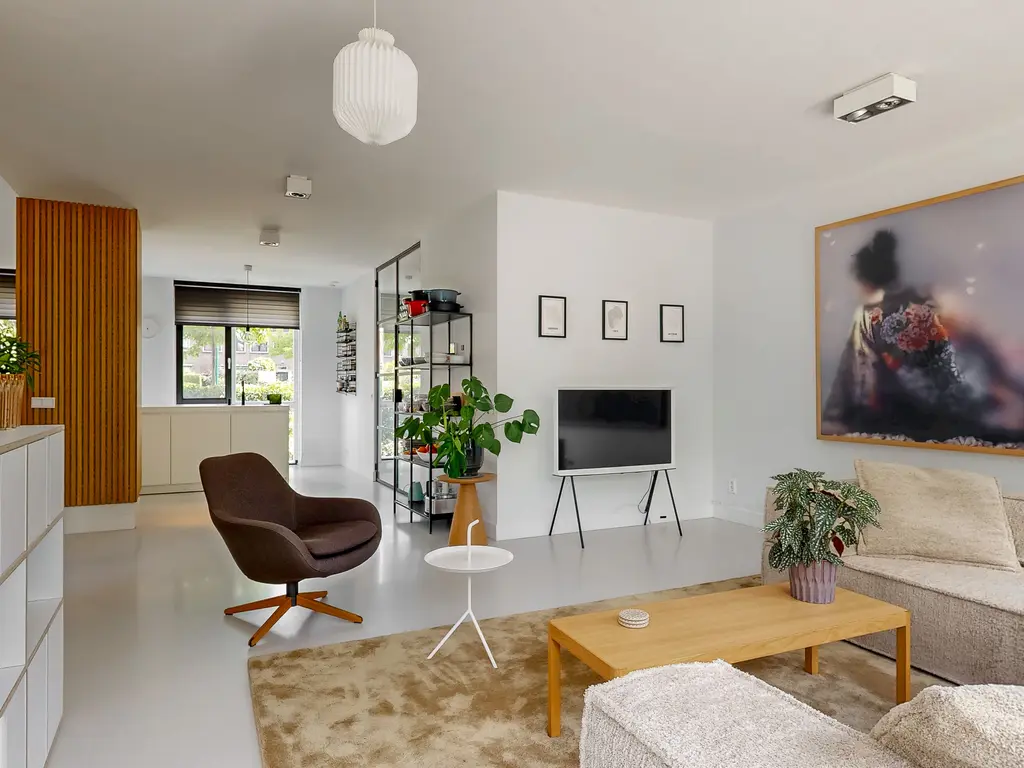 Voortuin en oprit met plaats voor twee auto’s op eigen terrein. Entree, hal met toilet, meterkast, trap naar de verdieping, een kast en toegang tot de keuken en woonkamer. De mooie Bulthaup keuken aan de voorzijde van de woning is van alle moderne gemakken en (inbouw)apparatuur voorzien. Zo heeft het bijvoorbeeld een inductie kookplaat met ingebouwde afzuigkap, een Quooker, vaatwasser, koel-/ vriescombinatie, een oven en een combi-stoomoven. Dankzij de uitbouw aan de zijkant is er extra veel leefruimte gecreëerd in de lichte woonkamer. De royale woonkamer heeft een moderne gietvloer met vloerverwarming, glad gestuukte muren en plafond en via de openslaande deuren heeft u toegang tot de zonnige en verzorgde achtertuin, waar je heerlijk kunt genieten van het buitenleven. In de tuin staat een heerlijke veranda met berging. ideaal voor fietsen en opslag.