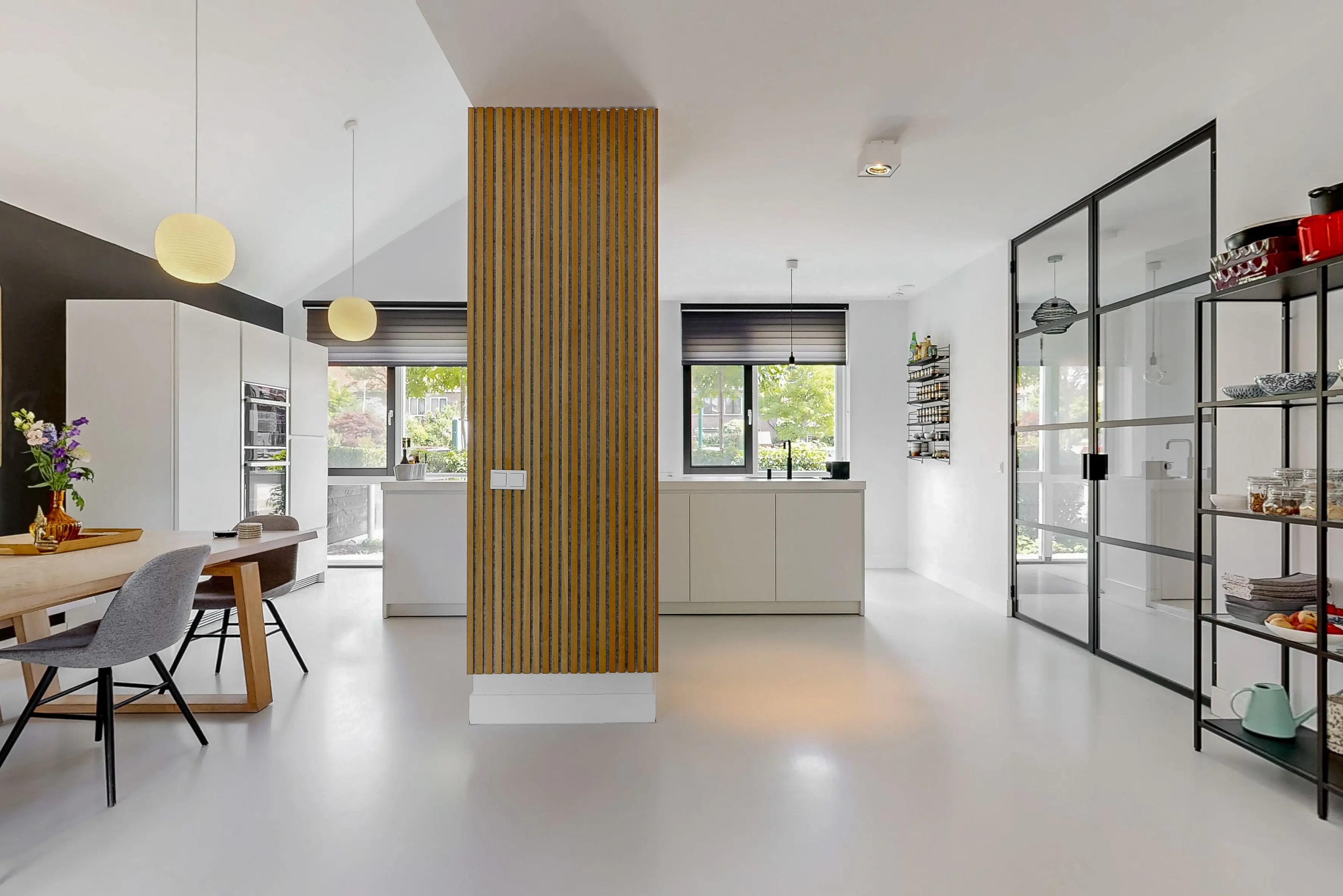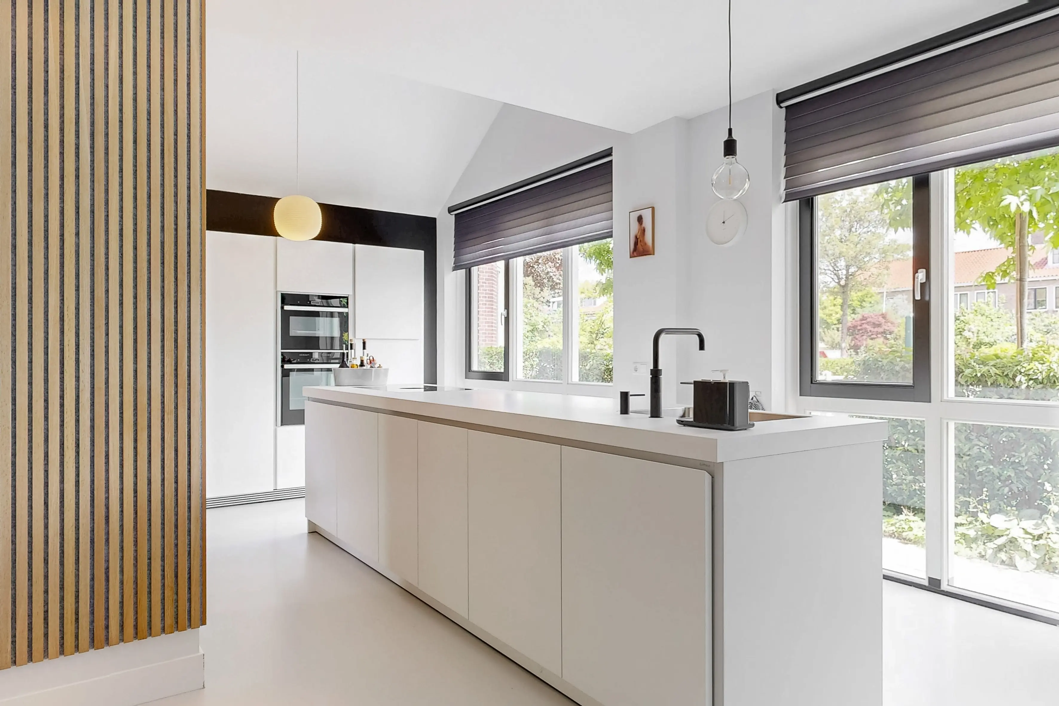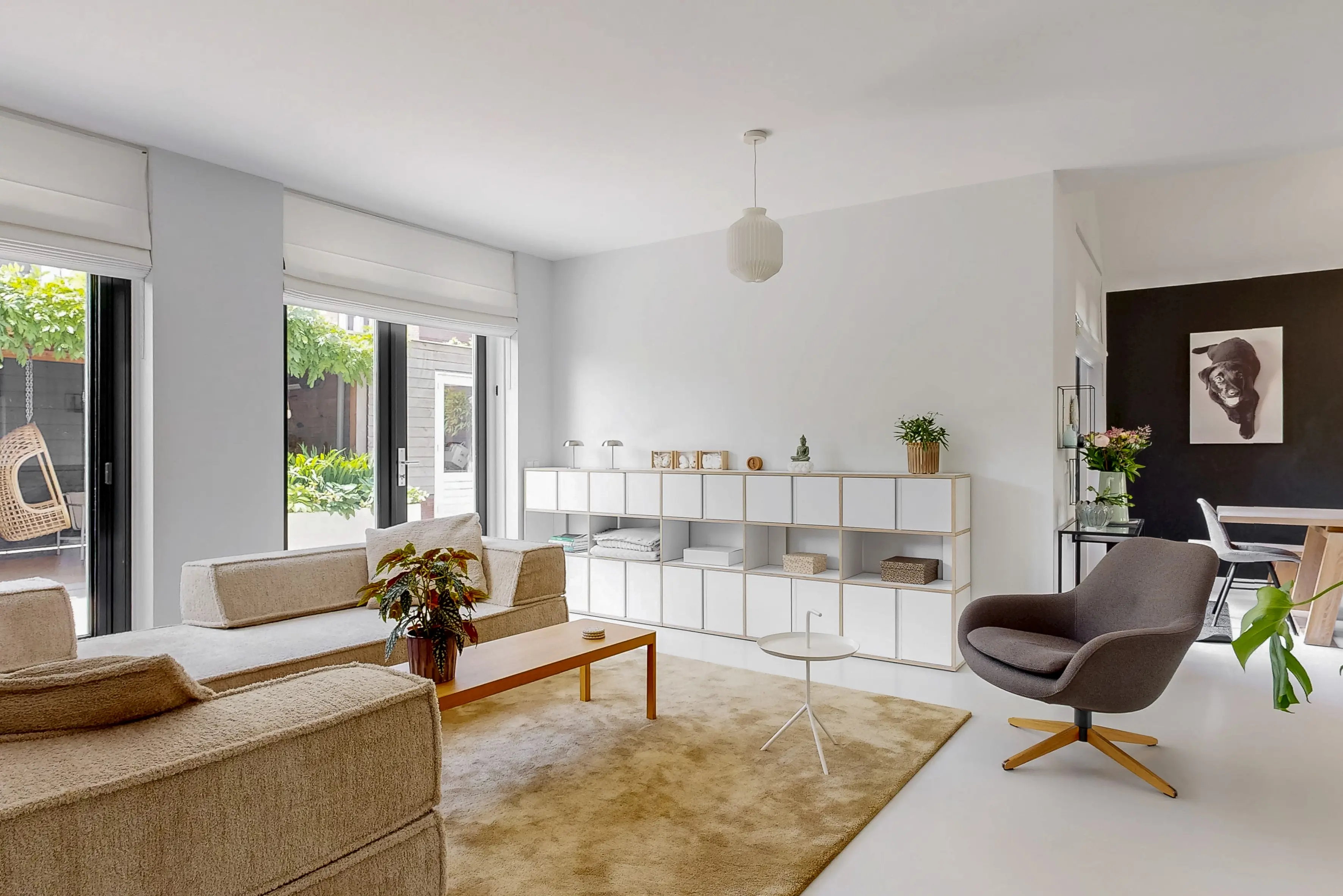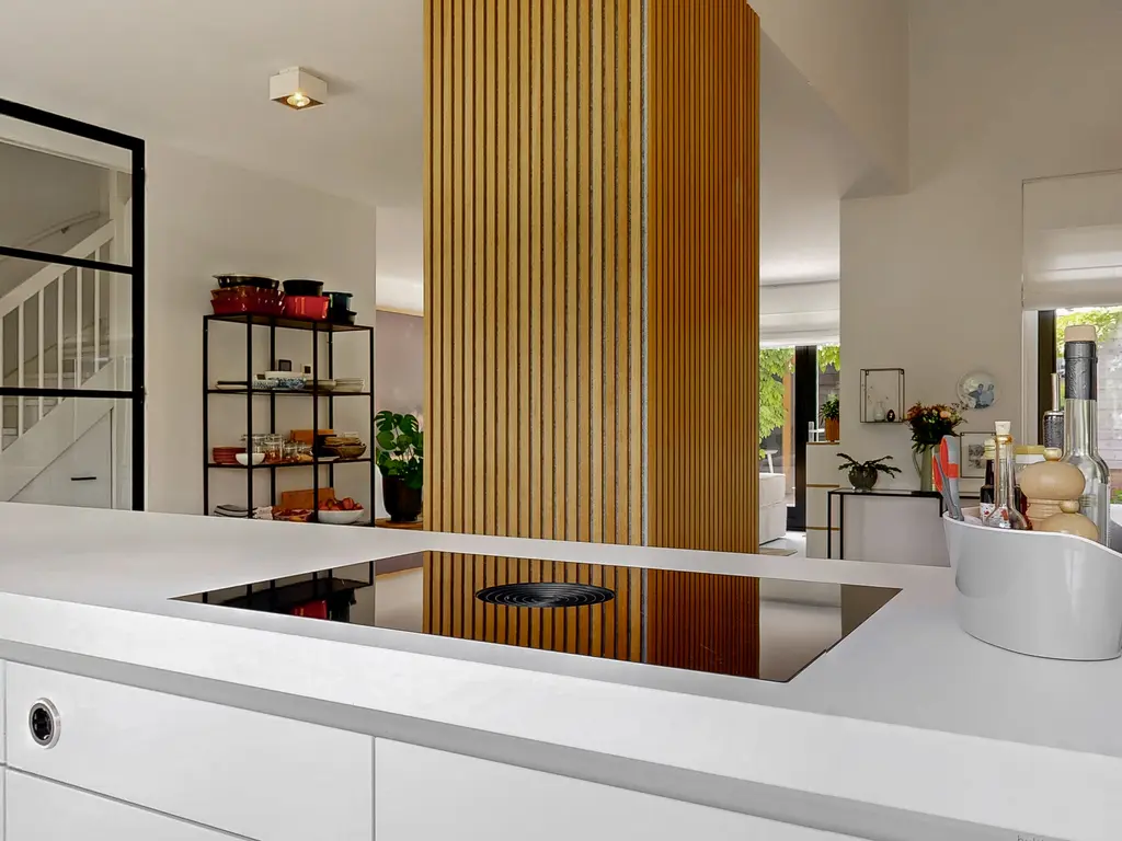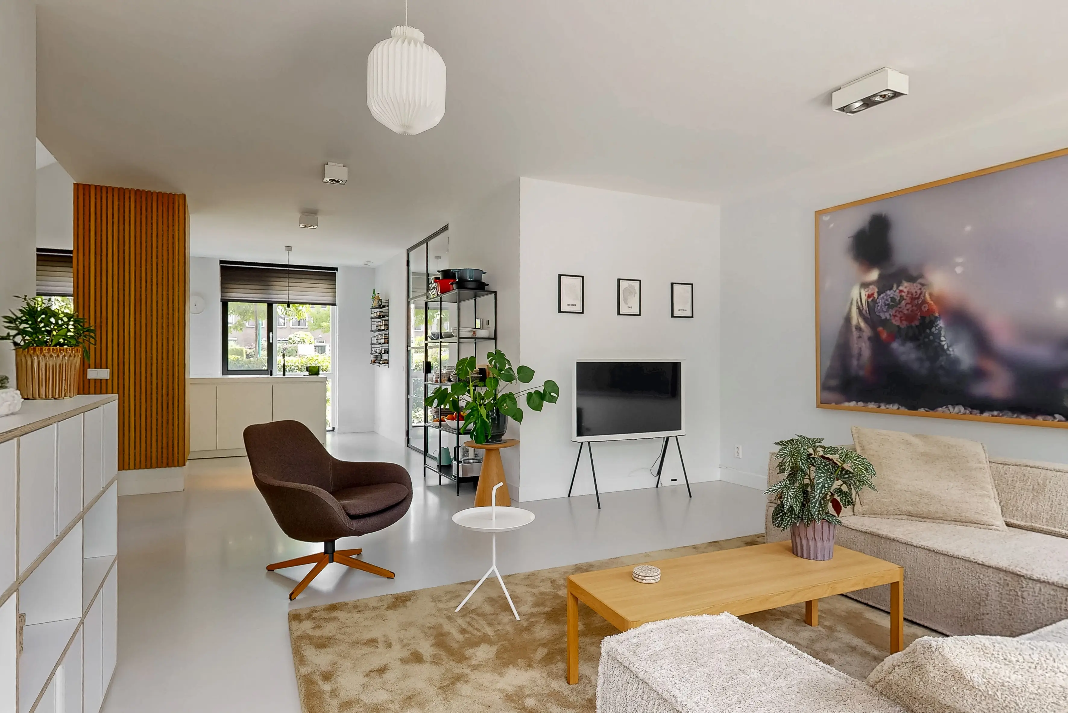 Voortuin en oprit met plaats voor twee auto’s op eigen terrein. Entree, hal met toilet, meterkast, trap naar de verdieping, een kast en toegang tot de keuken en woonkamer. De mooie Bulthaup keuken aan de voorzijde van de woning is van alle moderne gemakken en (inbouw)apparatuur voorzien. Zo heeft het bijvoorbeeld een inductie kookplaat met ingebouwde afzuigkap, een Quooker, vaatwasser, koel-/ vriescombinatie, een oven en een combi-stoomoven. Dankzij de uitbouw aan de zijkant is er extra veel leefruimte gecreëerd in de lichte woonkamer. De royale woonkamer heeft een moderne gietvloer met vloerverwarming, glad gestuukte muren en plafond en via de openslaande deuren heeft u toegang tot de zonnige en verzorgde achtertuin, waar je heerlijk kunt genieten van het buitenleven. In de tuin staat een heerlijke veranda met berging. ideaal voor fietsen en opslag.