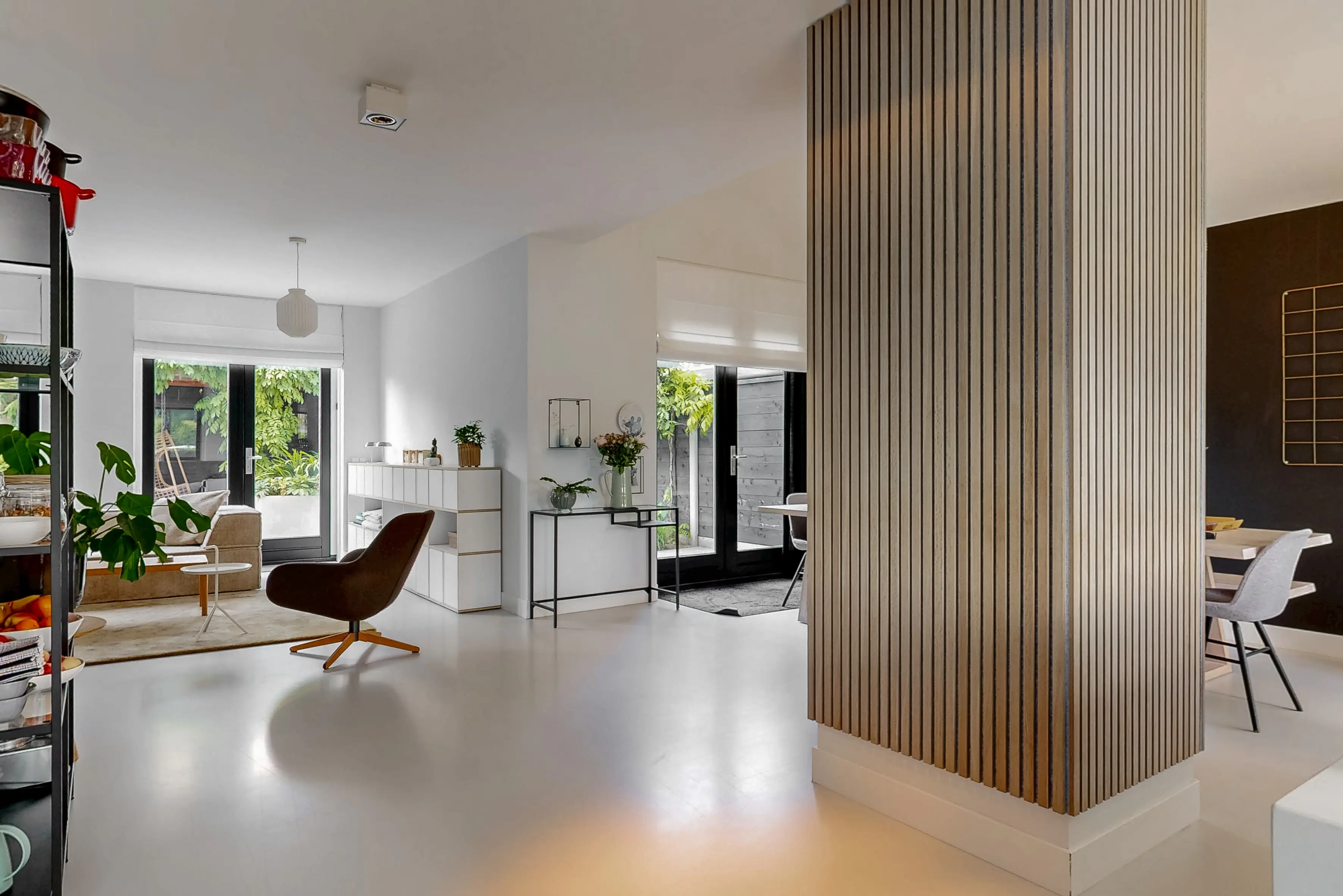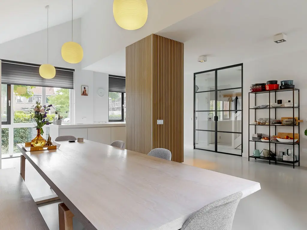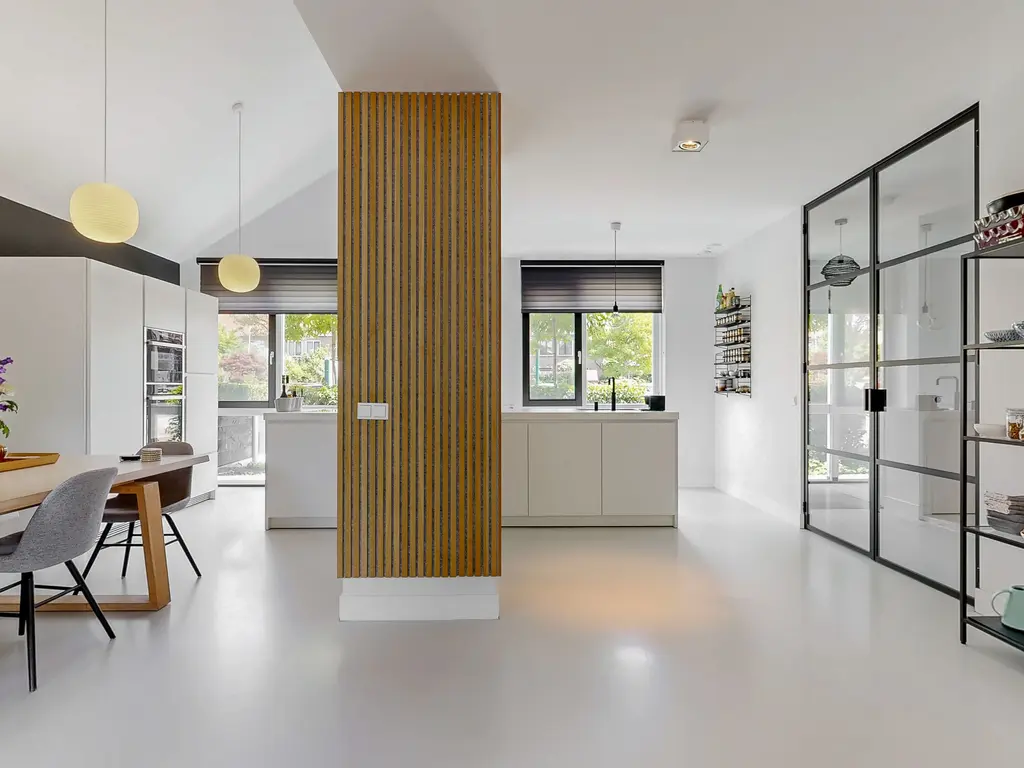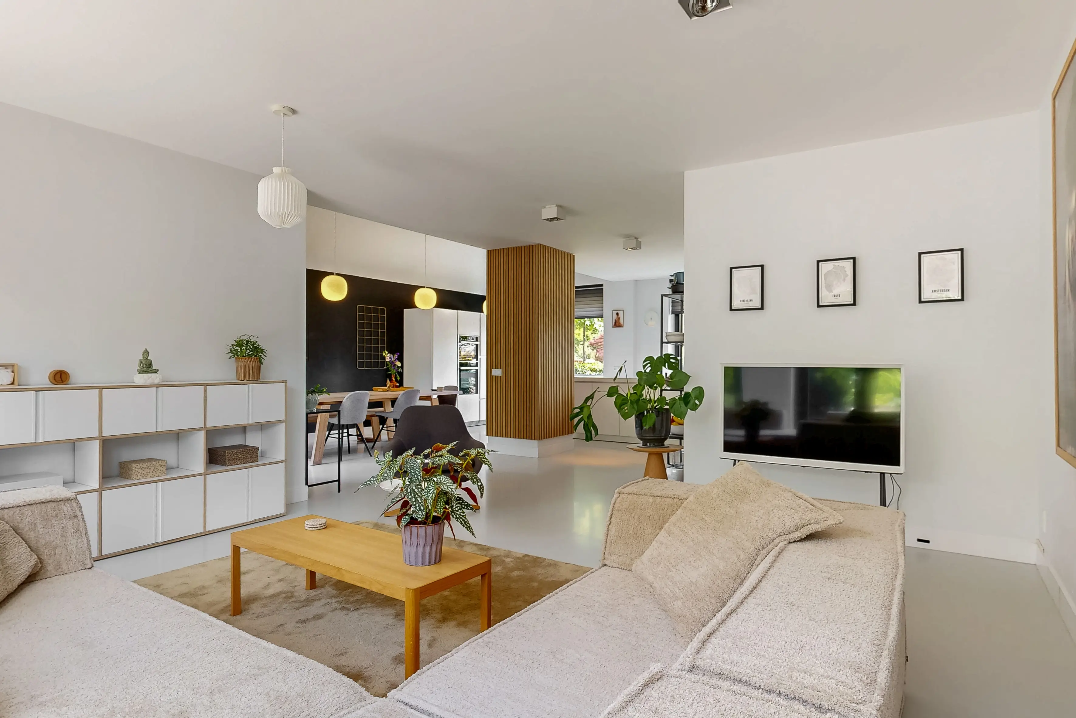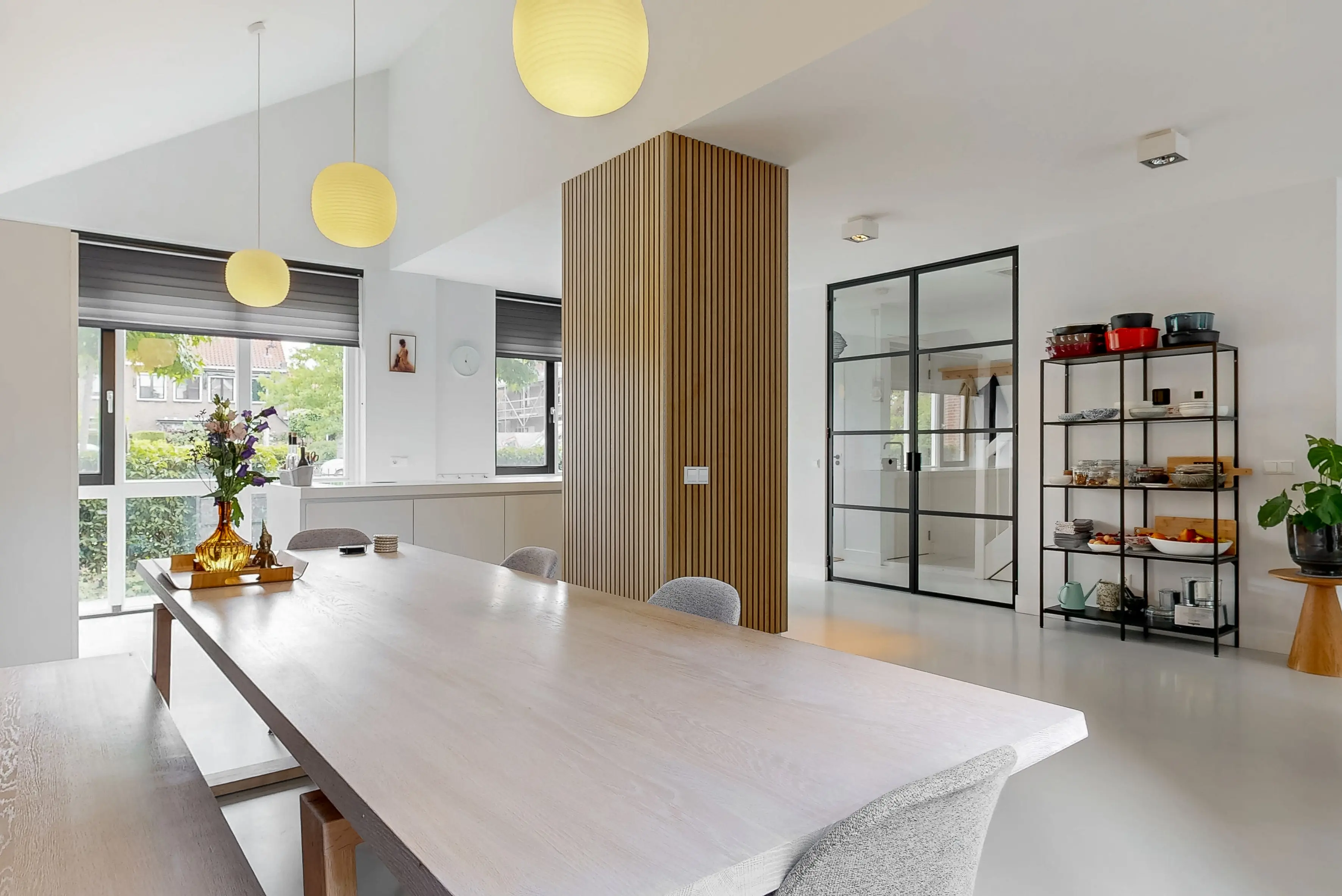 Voortuin en oprit met plaats voor twee auto’s op eigen terrein. Entree, hal met toilet, meterkast, trap naar de verdieping, een kast en toegang tot de keuken en woonkamer. De mooie Bulthaup keuken aan de voorzijde van de woning is van alle moderne gemakken en (inbouw)apparatuur voorzien. Zo heeft het bijvoorbeeld een inductie kookplaat met ingebouwde afzuigkap, een Quooker, vaatwasser, koel-/ vriescombinatie, een oven en een combi-stoomoven. Dankzij de uitbouw aan de zijkant is er extra veel leefruimte gecreëerd in de lichte woonkamer. De royale woonkamer heeft een moderne gietvloer met vloerverwarming, glad gestuukte muren en plafond en via de openslaande deuren heeft u toegang tot de zonnige en verzorgde achtertuin, waar je heerlijk kunt genieten van het buitenleven. In de tuin staat een heerlijke veranda met berging. ideaal voor fietsen en opslag.