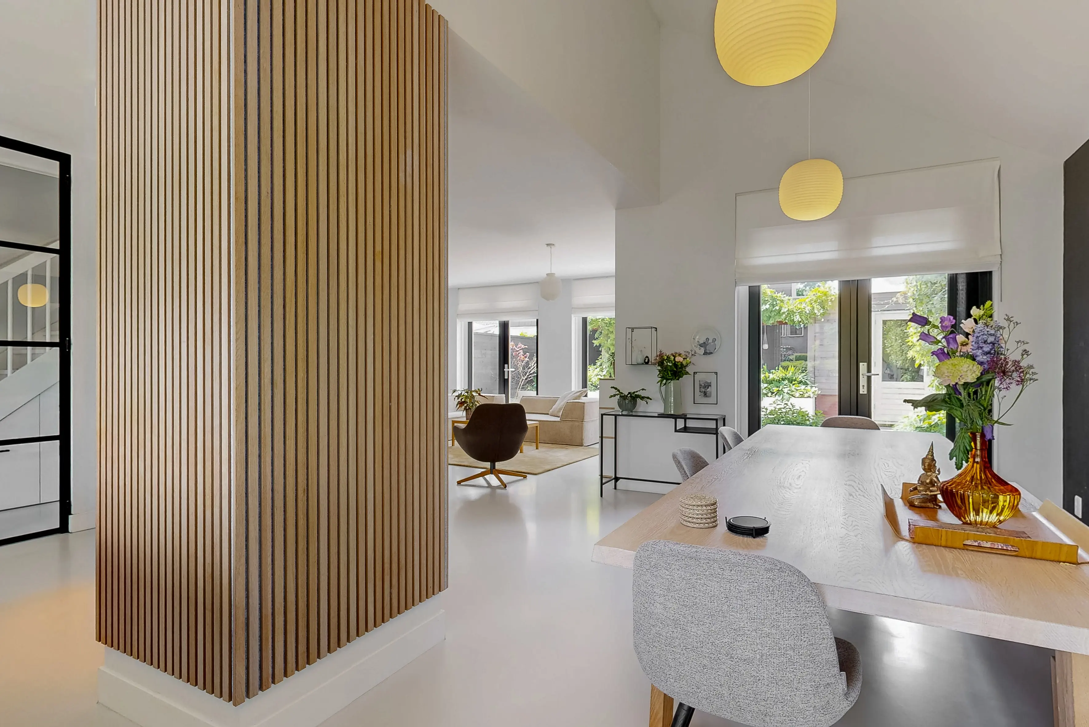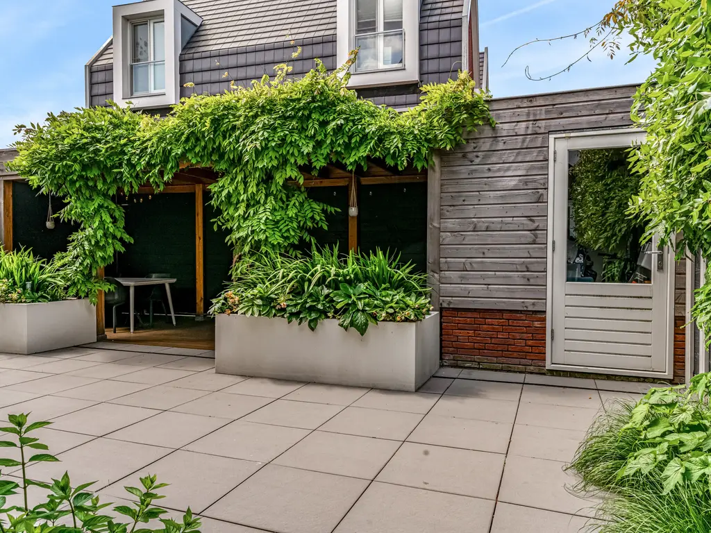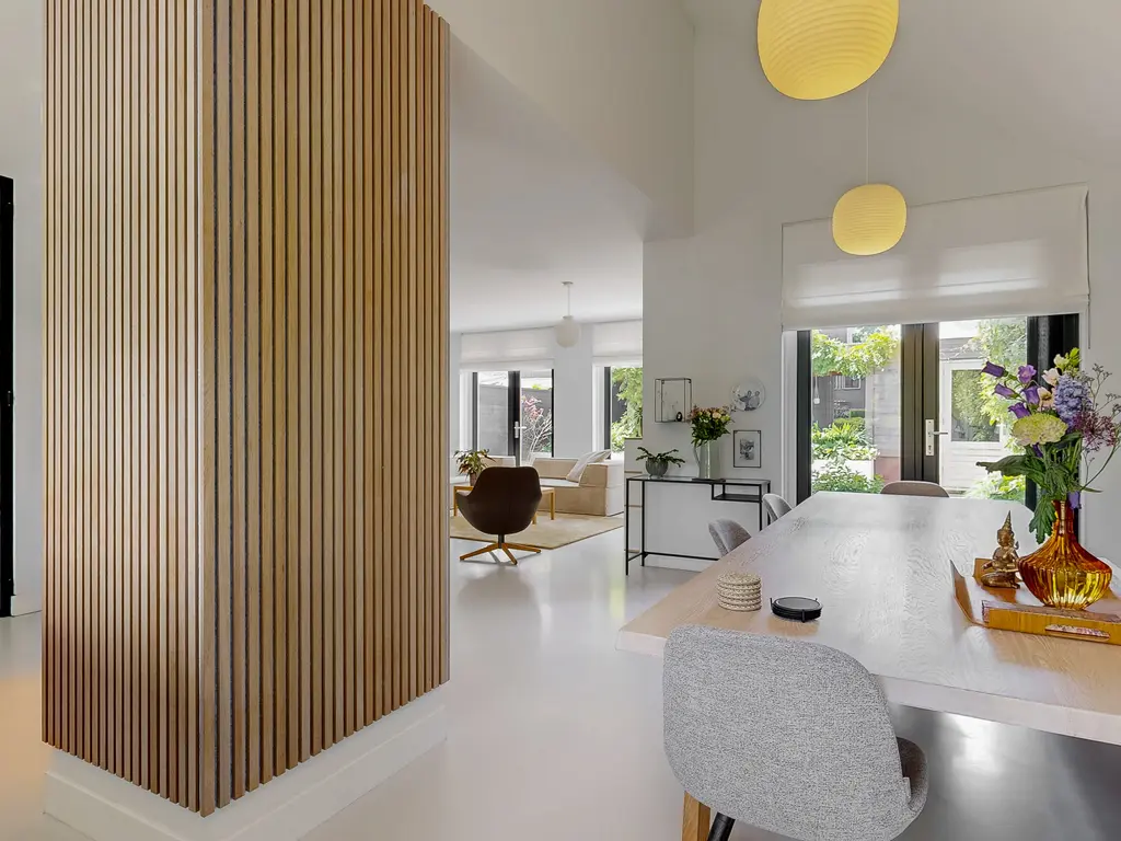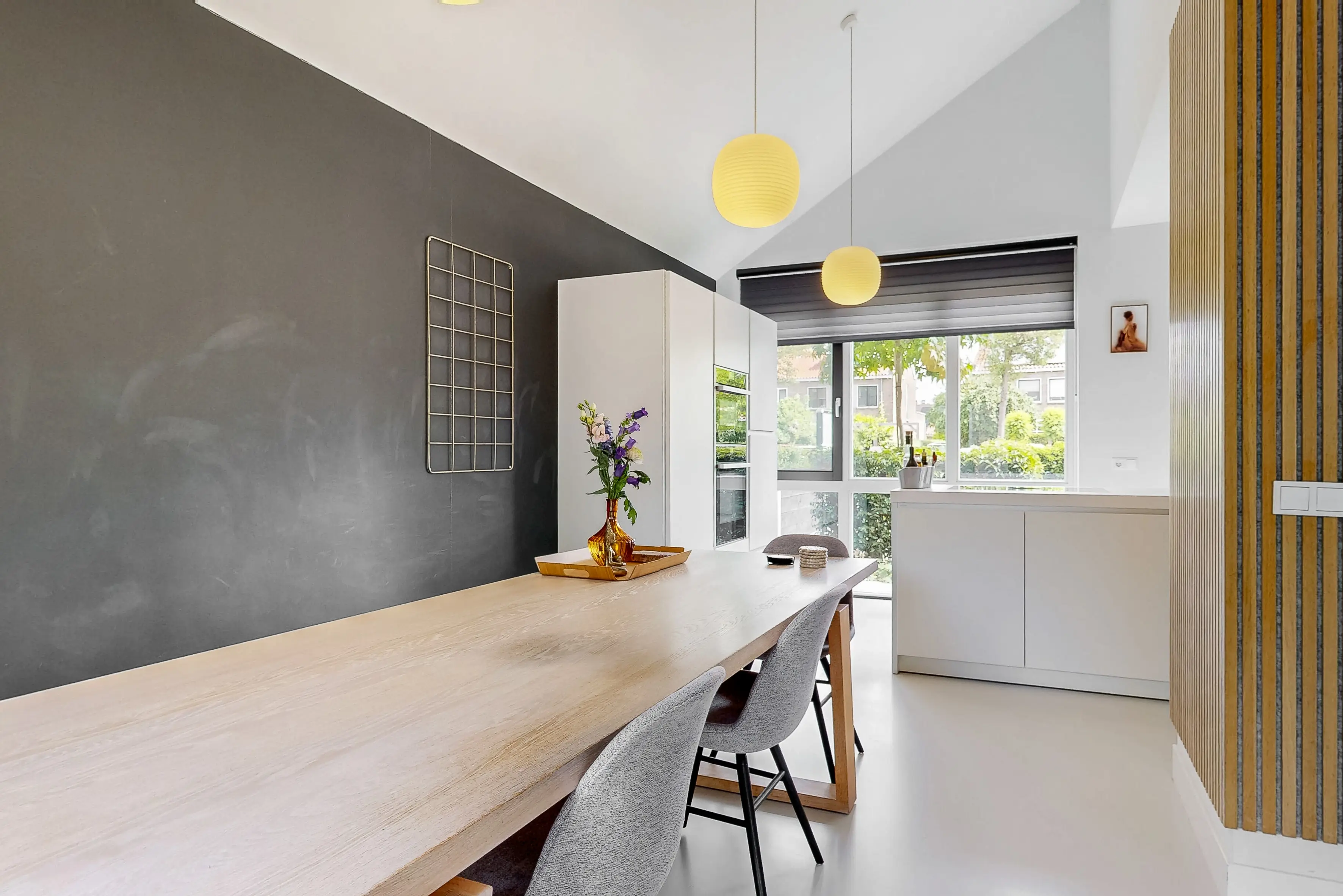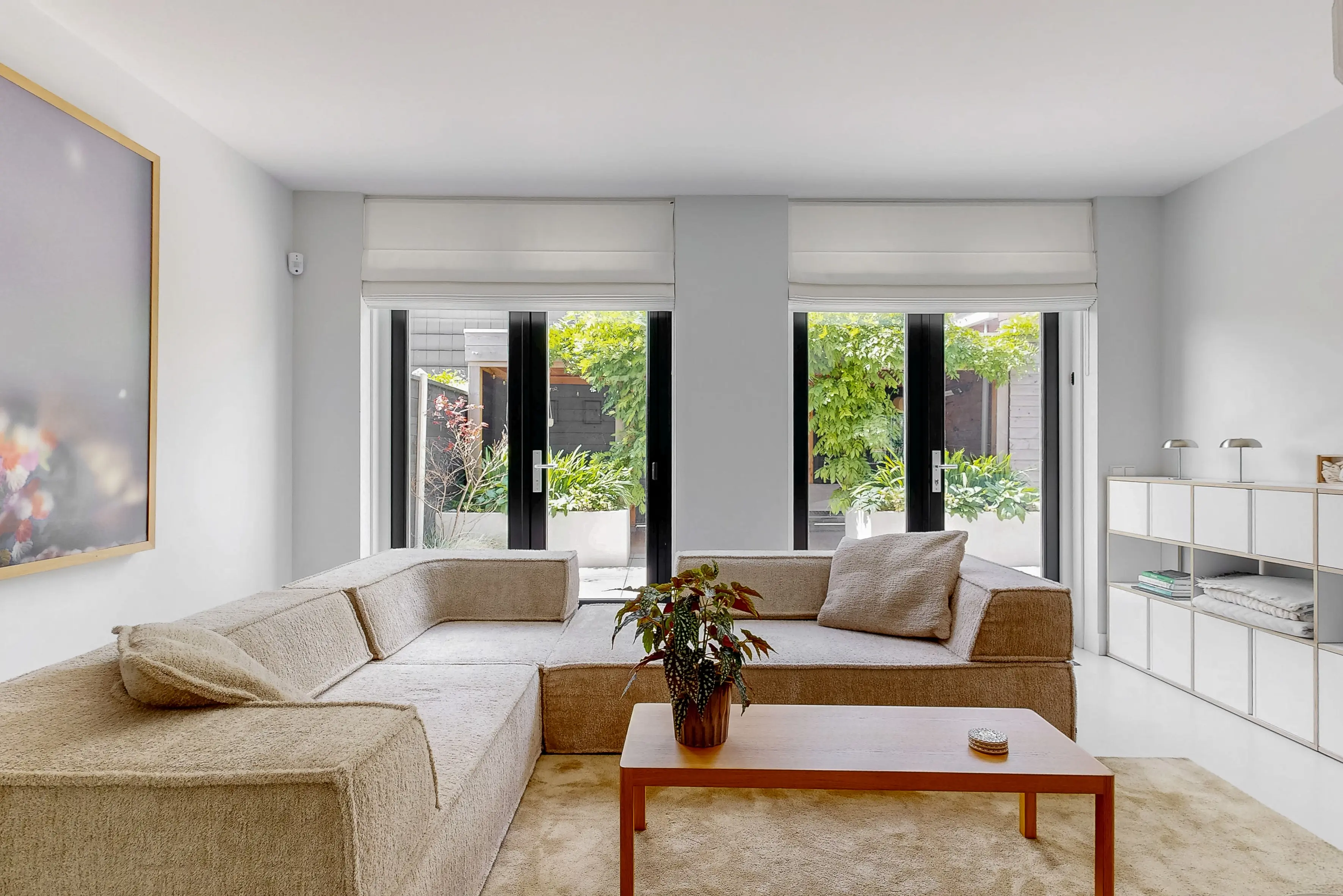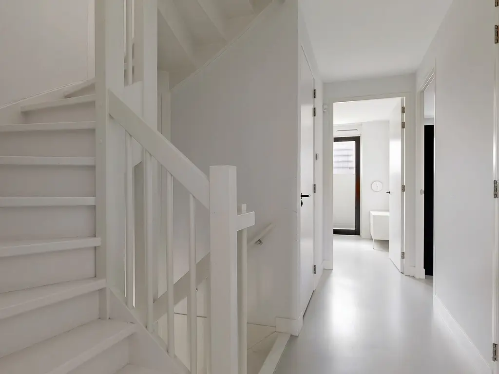 Voortuin en oprit met plaats voor twee auto’s op eigen terrein. Entree, hal met toilet, meterkast, trap naar de verdieping, een kast en toegang tot de keuken en woonkamer. De mooie Bulthaup keuken aan de voorzijde van de woning is van alle moderne gemakken en (inbouw)apparatuur voorzien. Zo heeft het bijvoorbeeld een inductie kookplaat met ingebouwde afzuigkap, een Quooker, vaatwasser, koel-/ vriescombinatie, een oven en een combi-stoomoven. Dankzij de uitbouw aan de zijkant is er extra veel leefruimte gecreëerd in de lichte woonkamer. De royale woonkamer heeft een moderne gietvloer met vloerverwarming, glad gestuukte muren en plafond en via de openslaande deuren heeft u toegang tot de zonnige en verzorgde achtertuin, waar je heerlijk kunt genieten van het buitenleven. In de tuin staat een heerlijke veranda met berging. ideaal voor fietsen en opslag.