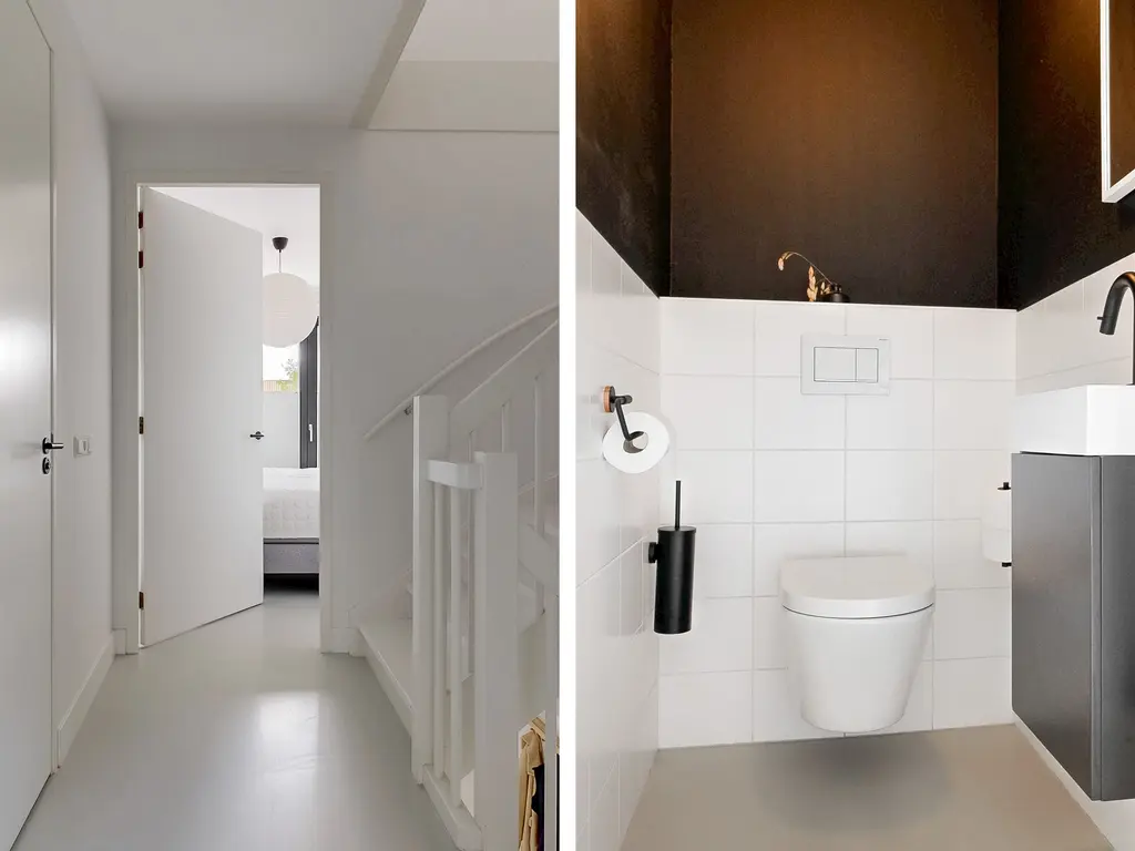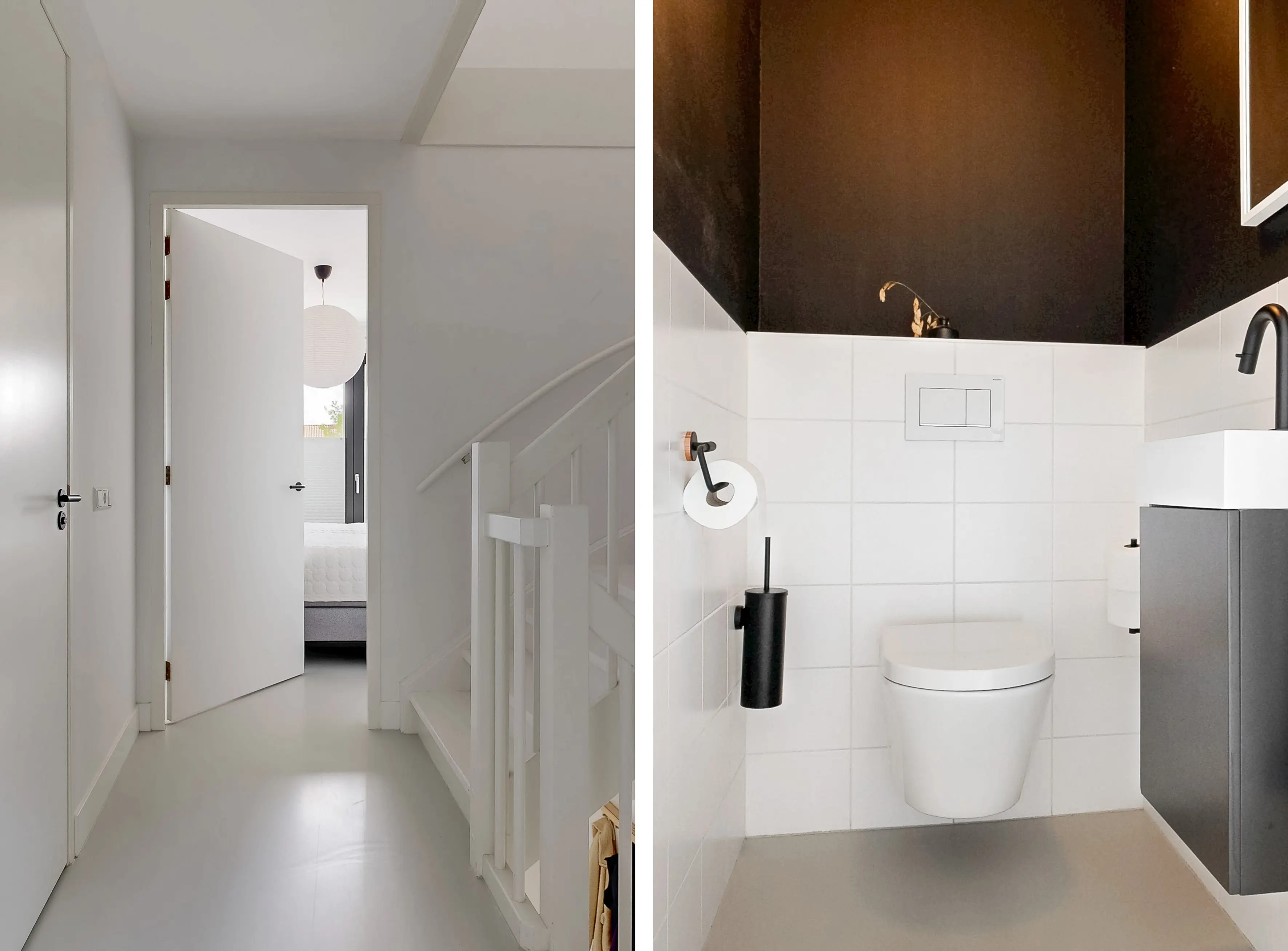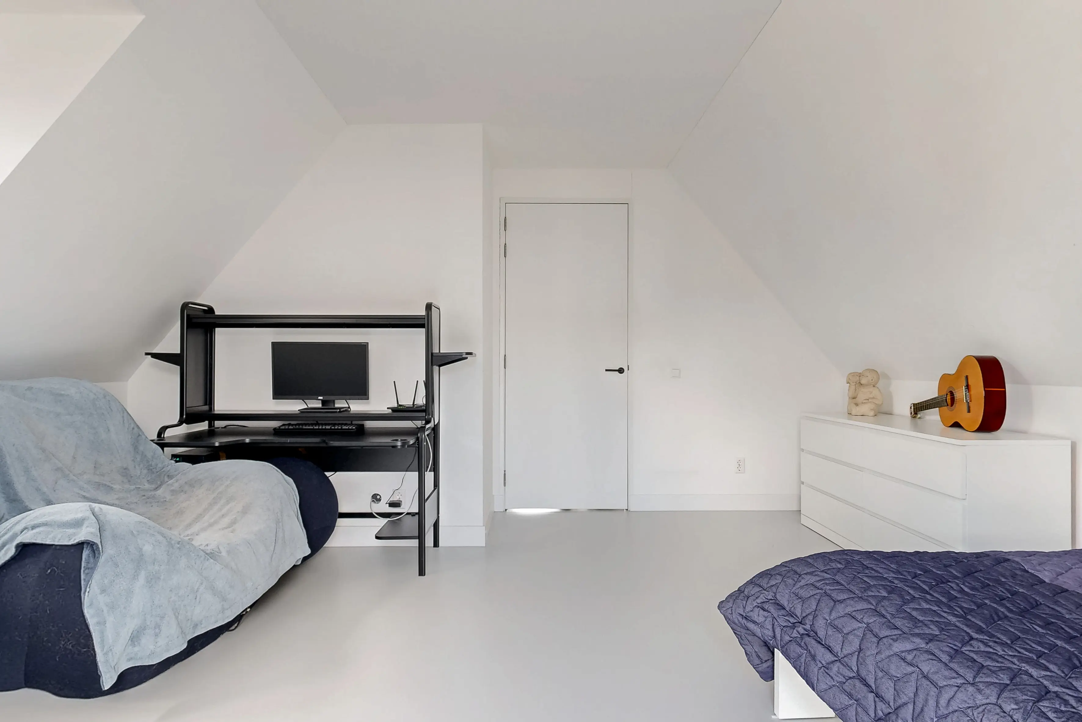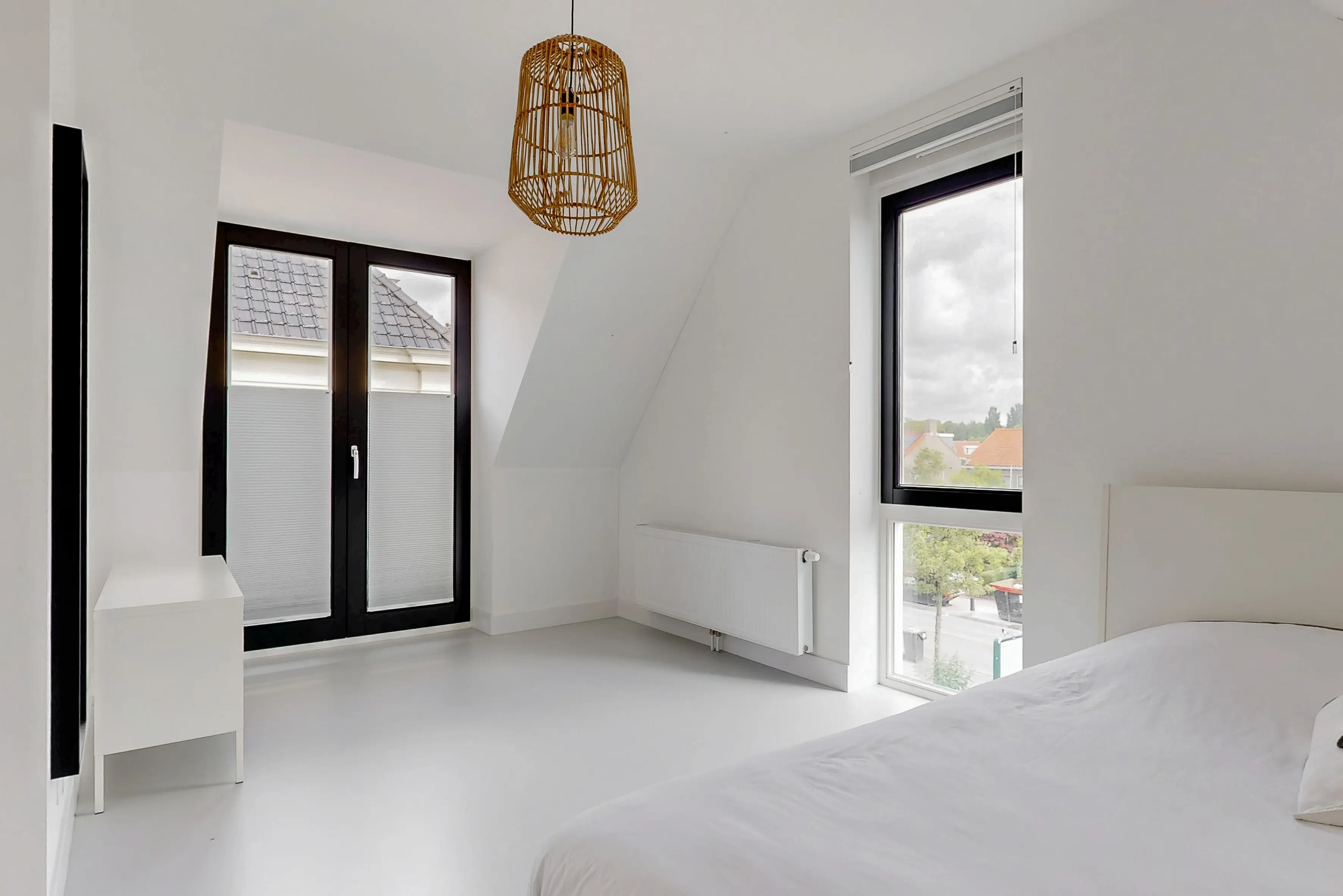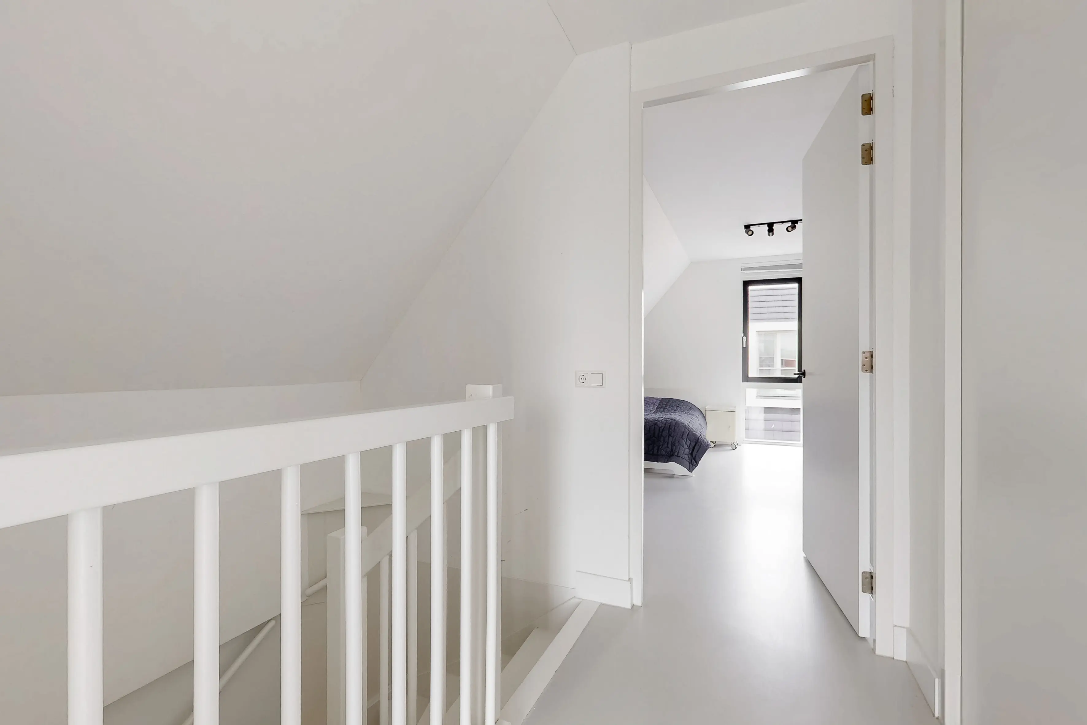Op de eerste verdieping bevinden zich drie ruime (slaap-)kamers en een moderne badkamer met alle voorzieningen voor een ontspannen start van de dag. Zo is er een inloopdouche, tweede toilet en een duo-wastafel met meubel en spiegel. De grote slaapkamer aan de voorzijde van de woning is voorzien van een walk in closet. De gehele verdieping heeft dezelfde gietvloer met vloerverwarming.