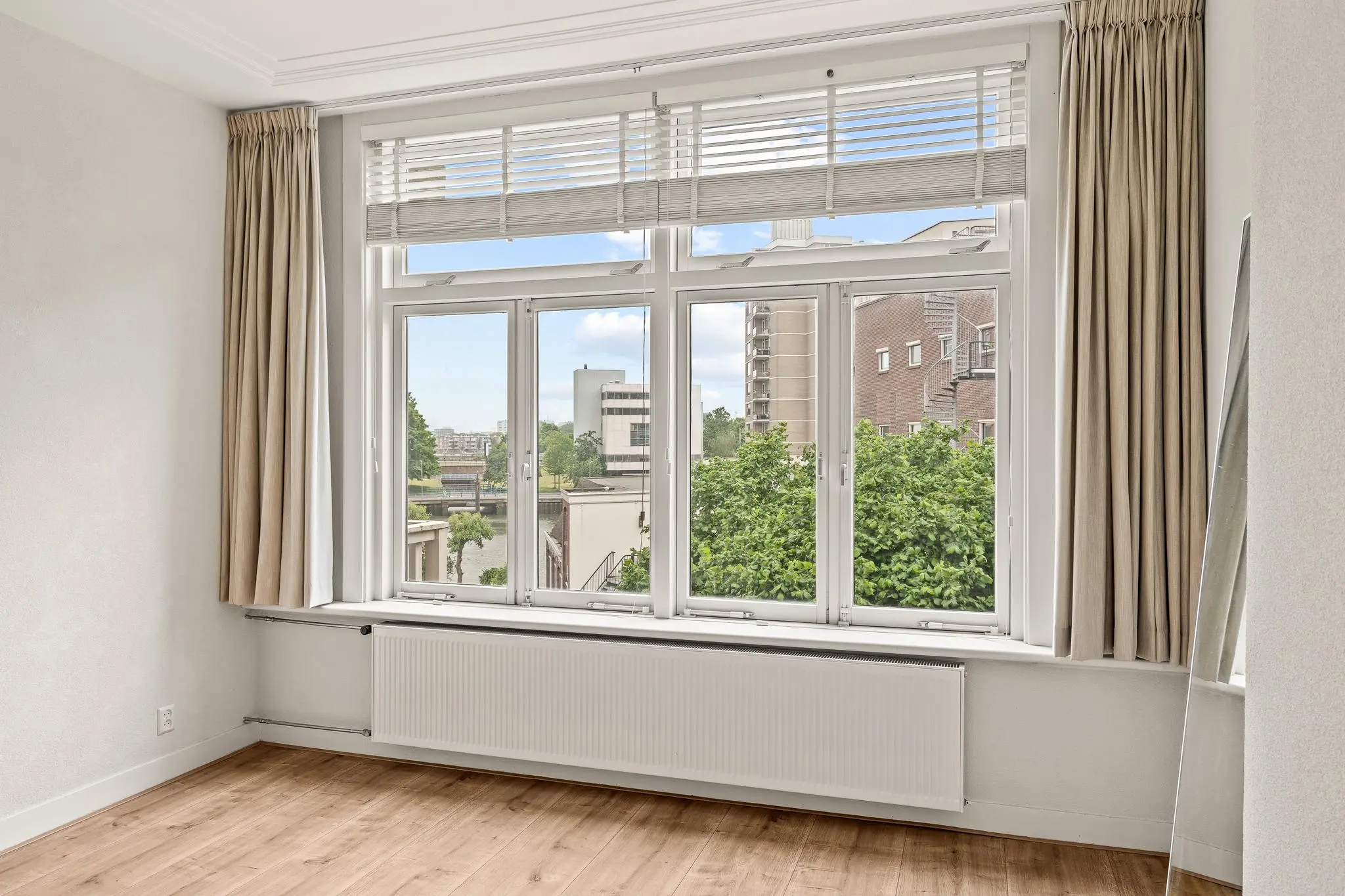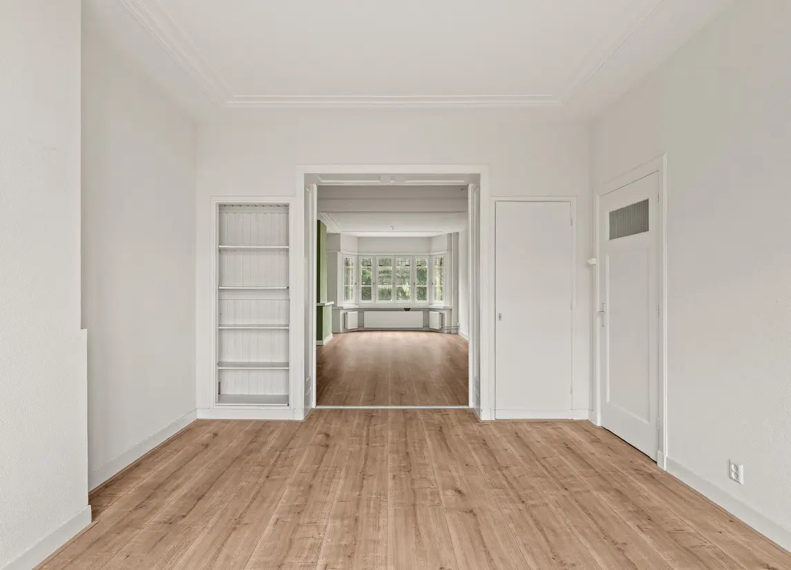De woning begint op de tweede verdieping. Via de lange hal bereik je een praktische werk- of hobbykamer aan de voorzijde, en het toilet. Aan de achterzijde ligt de eetkamer met grote raampartijen en vaste kasten, verbonden via authentieke schuifdeuren met de sfeervolle woonkamer aan de voorzijde. De erker, het hoge plafond, de lichtinval – hier komt alles samen. Naast de eetkamer ligt de dichte keuken, voorzien van inbouwapparatuur en met toegang tot het eerste balkon op het zuidwesten.