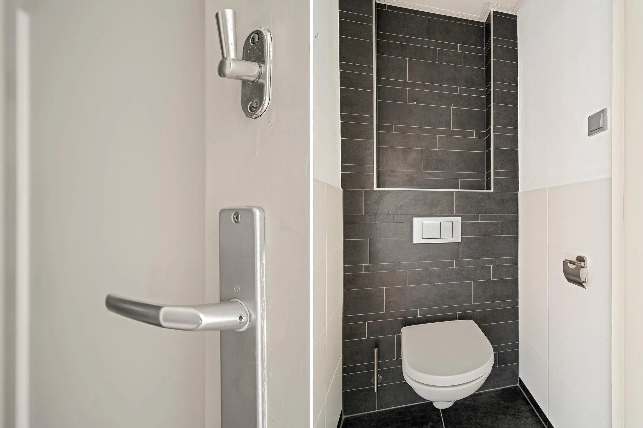 Op de derde verdieping zijn twee ruime slaapkamers te vinden: één aan de rustige achterzijde met uitzicht op het groen, en één aan de voorzijde met toegang tot het tweede balkon (noordoost). De badkamer is functioneel ingericht met douche, wastafel, tweede toilet en wasmachineaansluiting. Op de overloop is een extra vaste kast aanwezig. Vanuit de kleinste kamer is via een ladder en een dakluik toegang tot het dak – een verzorgd groendak dat extra licht biedt.