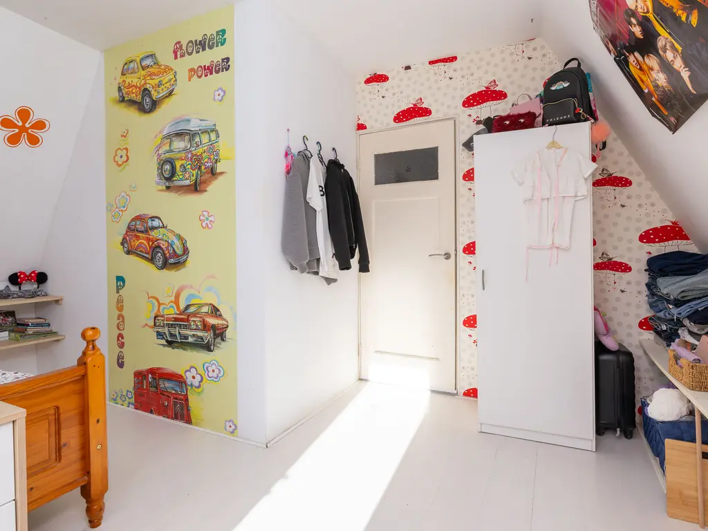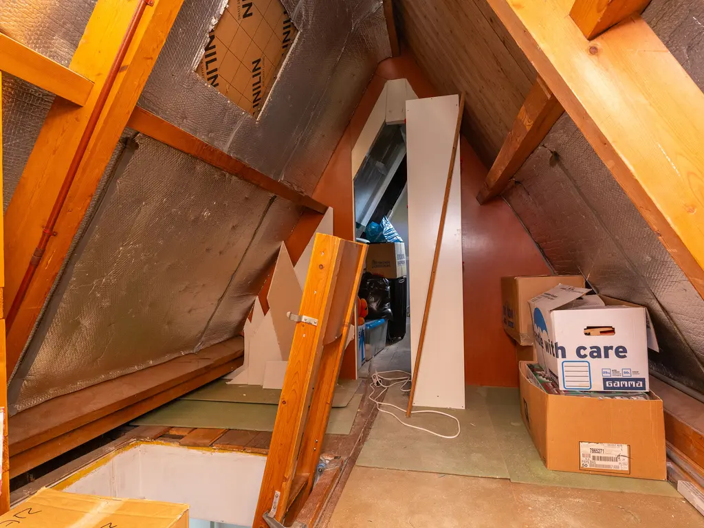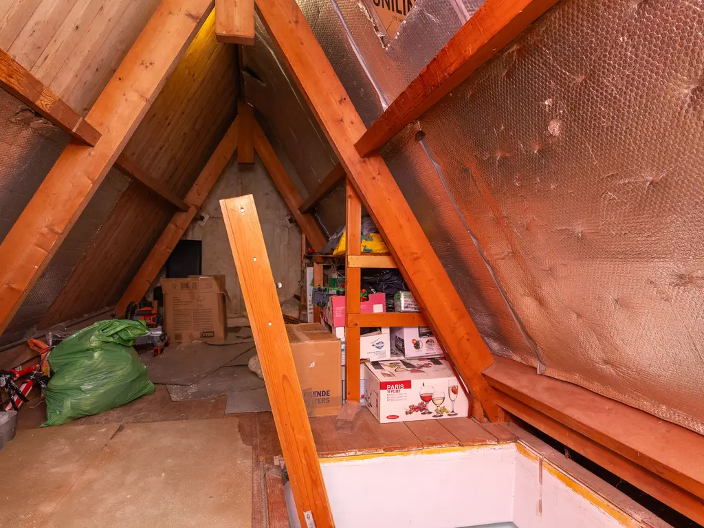 Via een vlizotrap bereik je de opbergzolder. Perfect voor het opbergen van seizoensspullen, koffers of gereedschap — extra bergruimte is altijd handig!