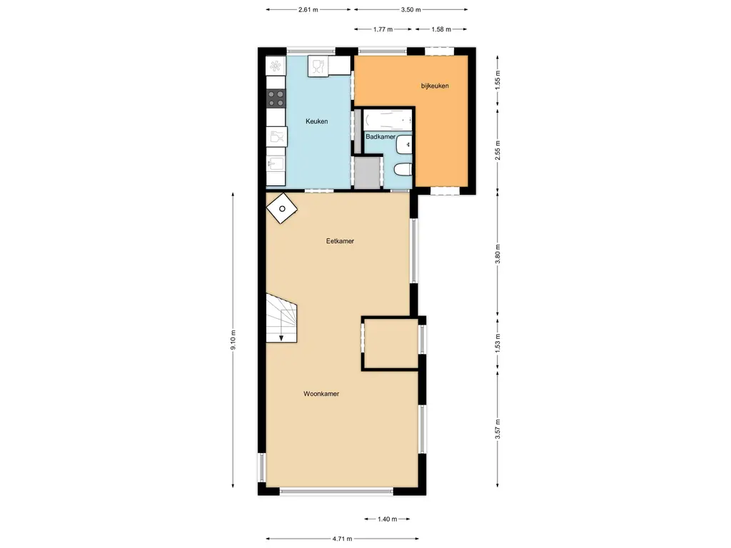 Op de begane grond vind je een royale woonkamer met veel lichtinval en voldoende ruimte voor een gezellige zithoek en eethoek. De keuken biedt volop mogelijkheden om naar eigen wens te moderniseren en vormt samen met de bijkeuken een praktische indeling. Verder bevindt zich op deze verdieping de badkamer, handig en comfortabel op de begane grond gesitueerd.