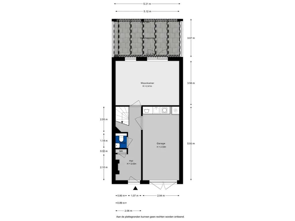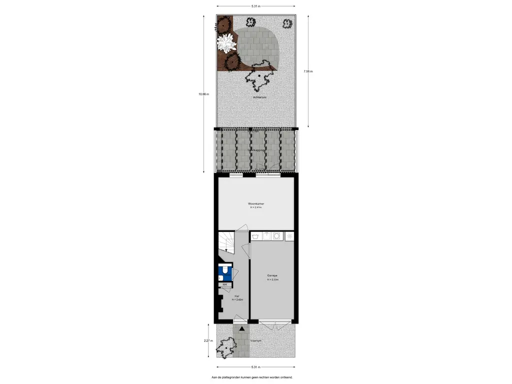 Via de voordeur komen we binnen in de hal met daarin de meterkas, een toilet, toegang tot de garage, die tevens dienstdoet als wasruimte, en de achtergelegen tuinkamer (±19m²) vanwaaruit je toegang hebt tot de achtertuin. De op het oosten georiënteerde tuin biedt een heerlijke plek om tot rust komen. Onder de overkapping geniet u ook in de koudere maanden van frisse lucht.