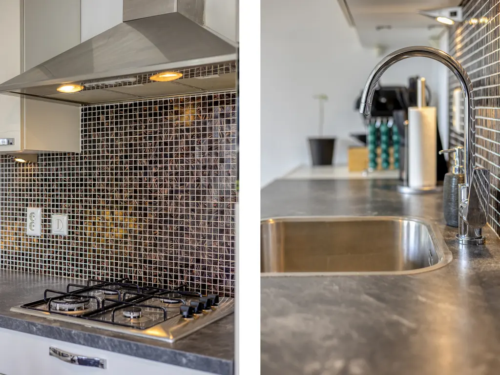 De open keuken sluit naadloos aan op de woonkamer en is modern ingericht met een strakke opstelling en diverse inbouwapparatuur.